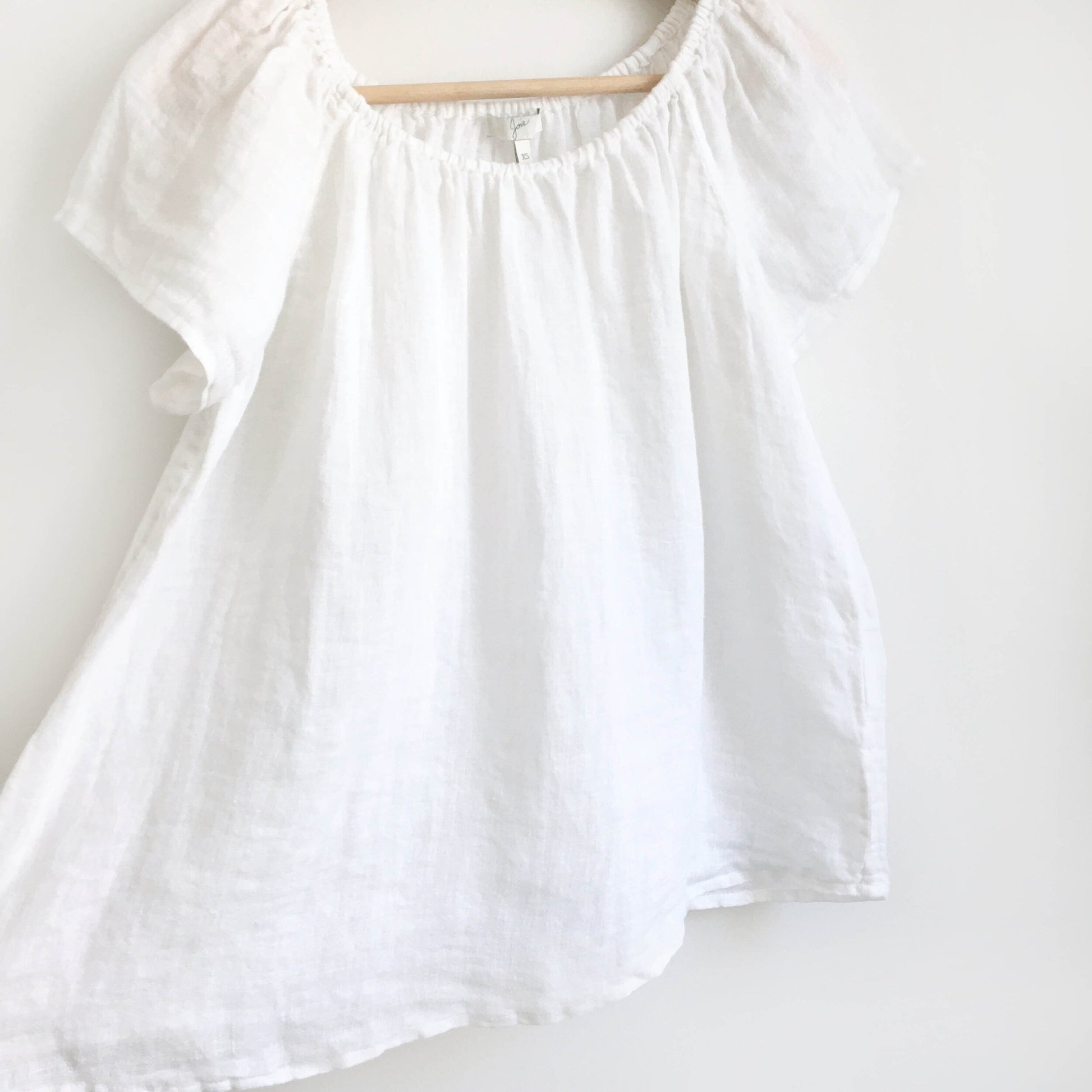 Item Description: This breezy white short sleeve gauze cotton top from Joie features a flowy, oversized silhouette with stretch neckline to wear off shoulder or on - no content tag but likely 100% cotton or blended with linen