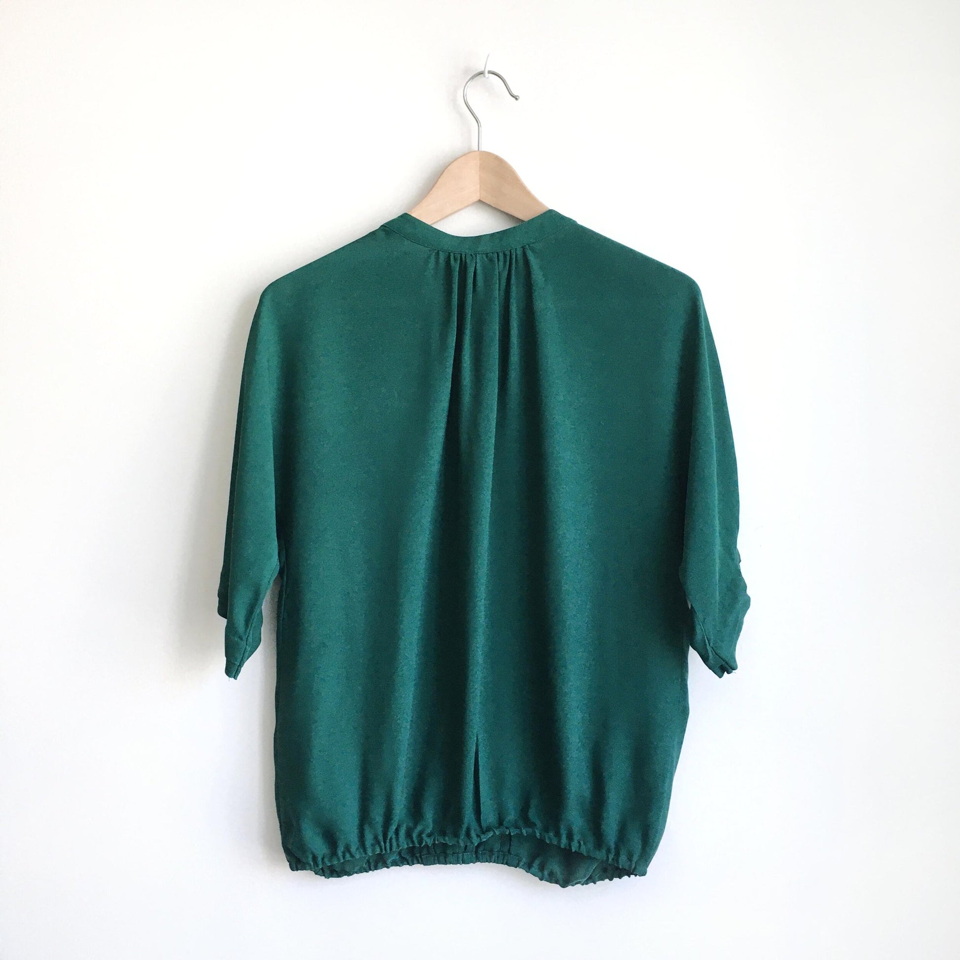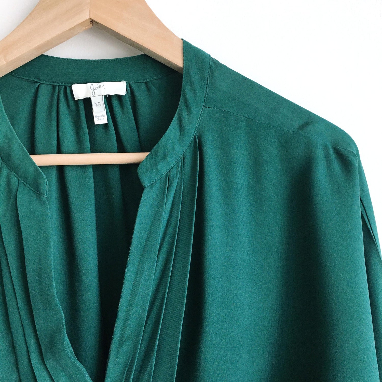 Item Description: This emerald green short sleeve silk blouse from Joie features a split v-neck with front tiered pleats, elastic hem and tiered sleeve hem. 100% silk