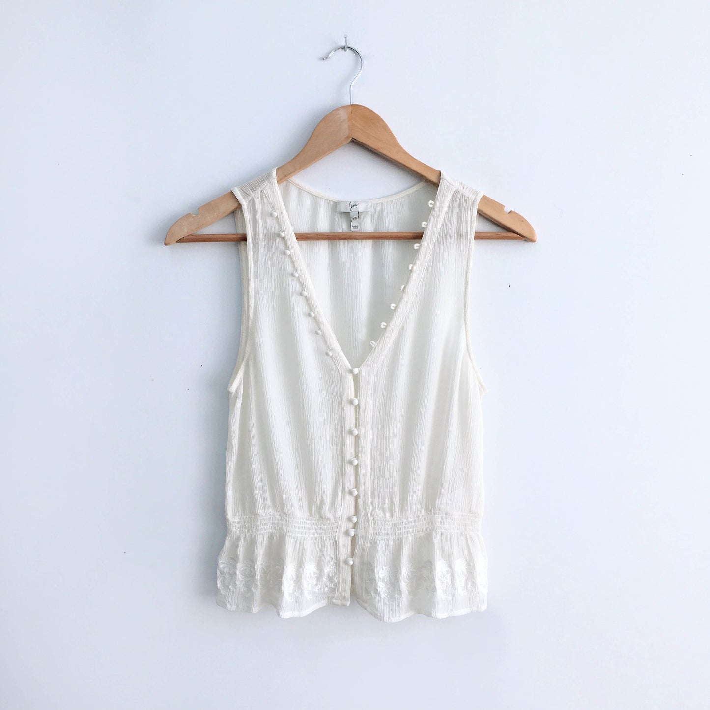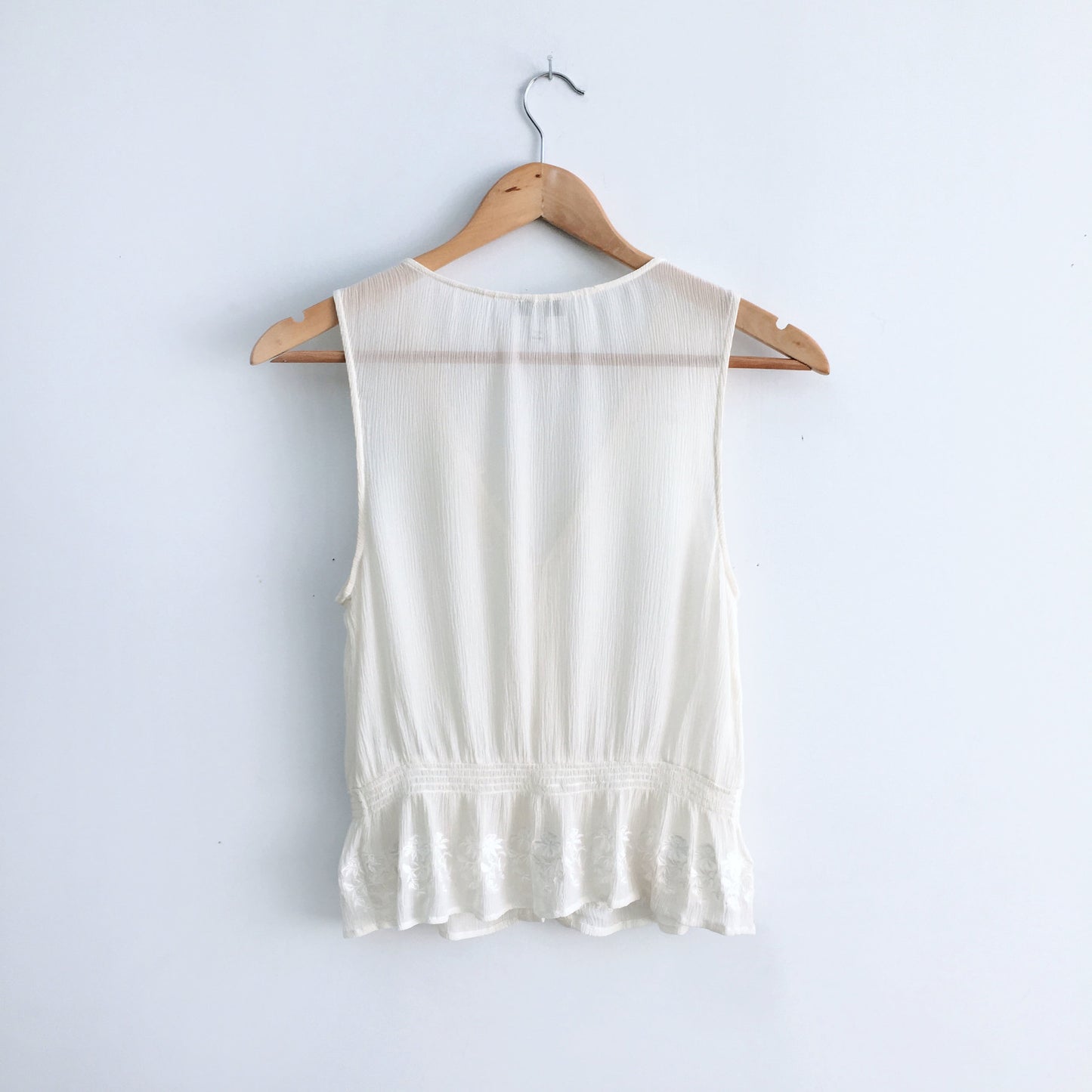 Item Description: This off-white chiffon blouse features a faux-button up v-neckline with fabric buttons, and a stretch peplum waist with rose embroidery. Can you say STUNNING? 100% silk