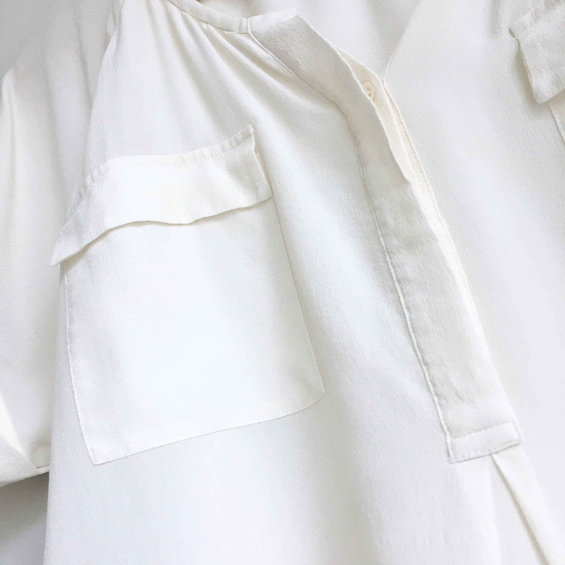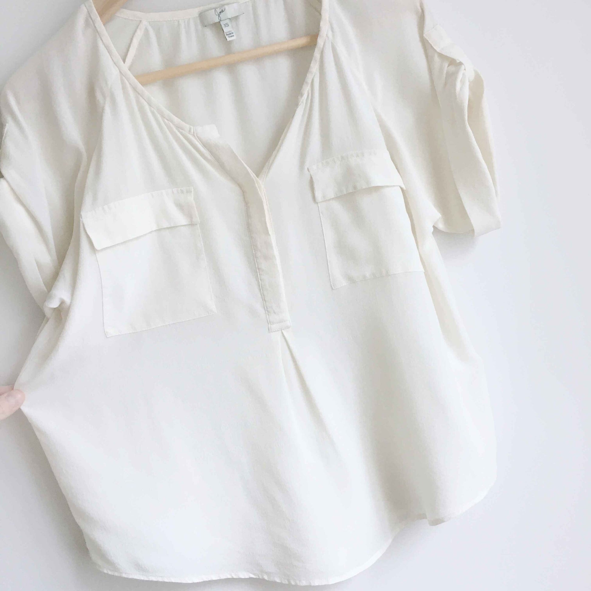 Item Description: This classic off-white silk 1/2 button down blouse from Joie features rolled sleeves, front flap pockets and covered buttons. 100% silk