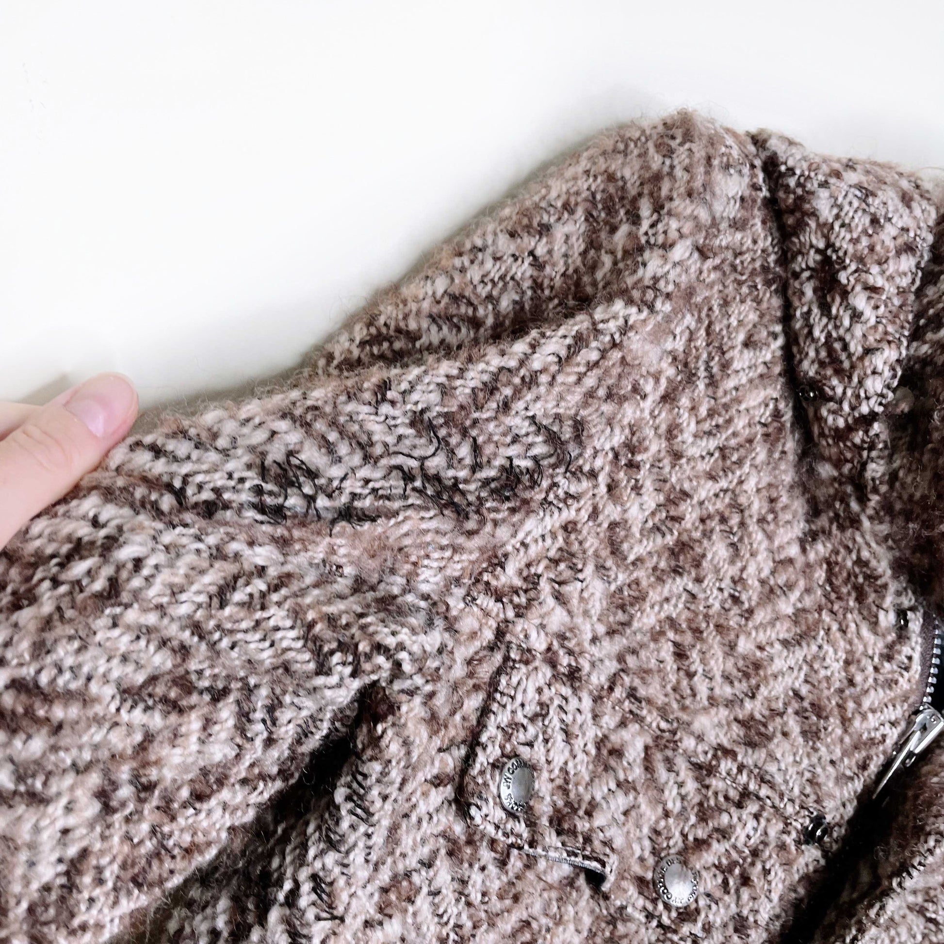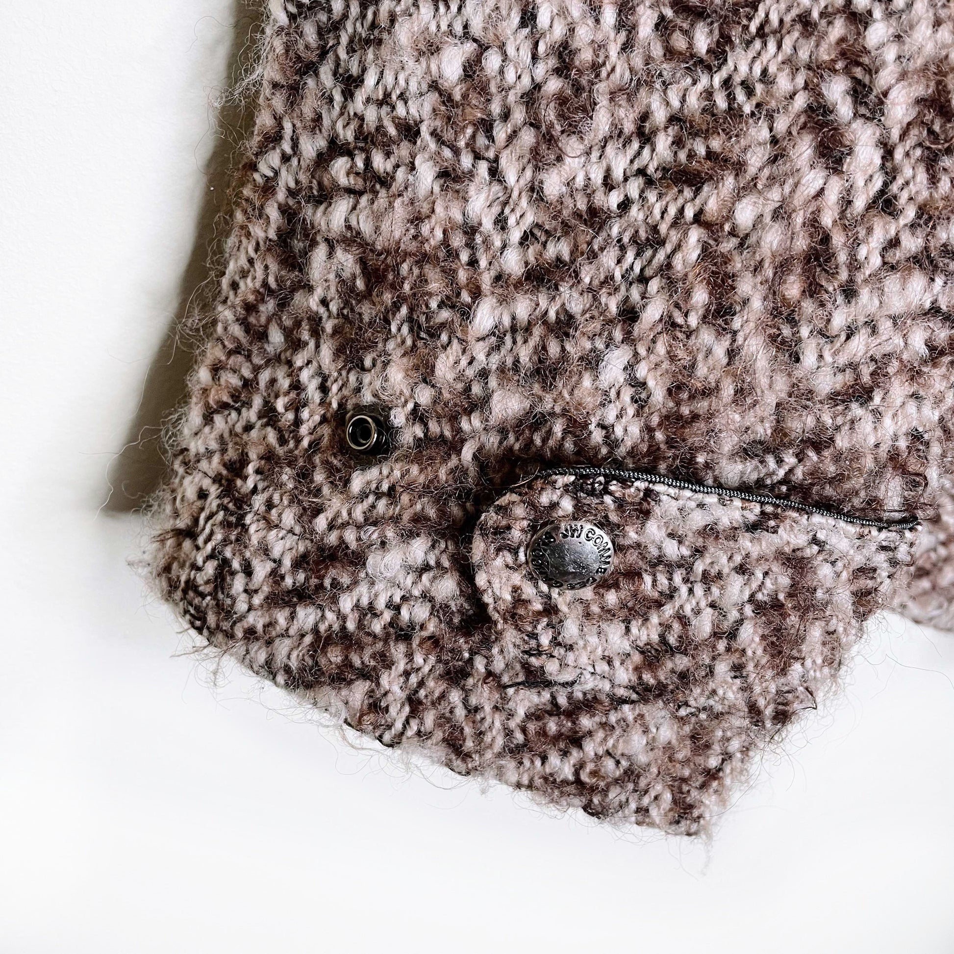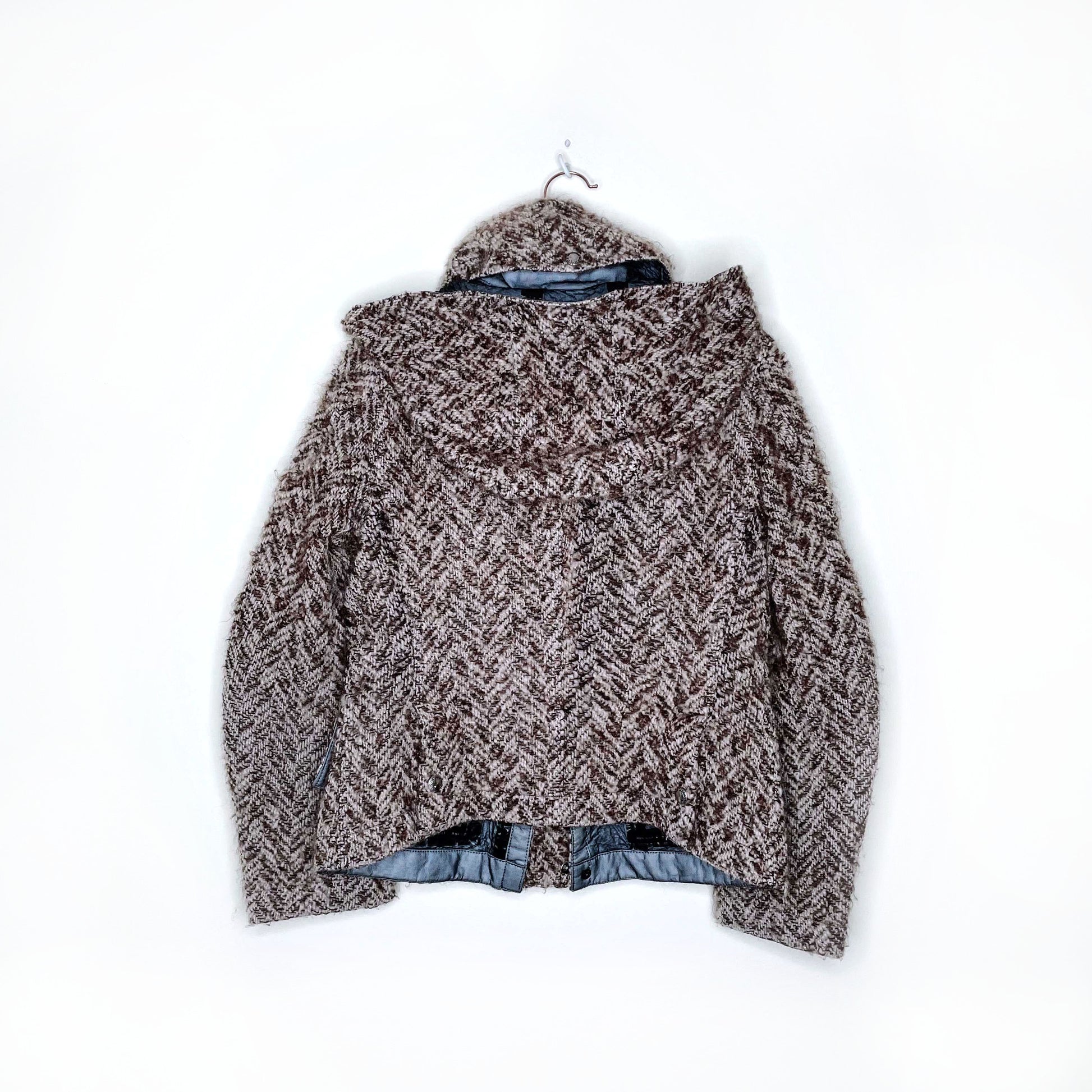 Item Description: This brown heather wool tweed jacket from Junya Watanabe's Commes des Garcons runway collection in 2005 has a preppy y2k meets Chanel vibe to it - front flap pockets, zipper and snap combo closure and windstopper lining to keep the chill out. Hood tucks away into collar with snap button closure.