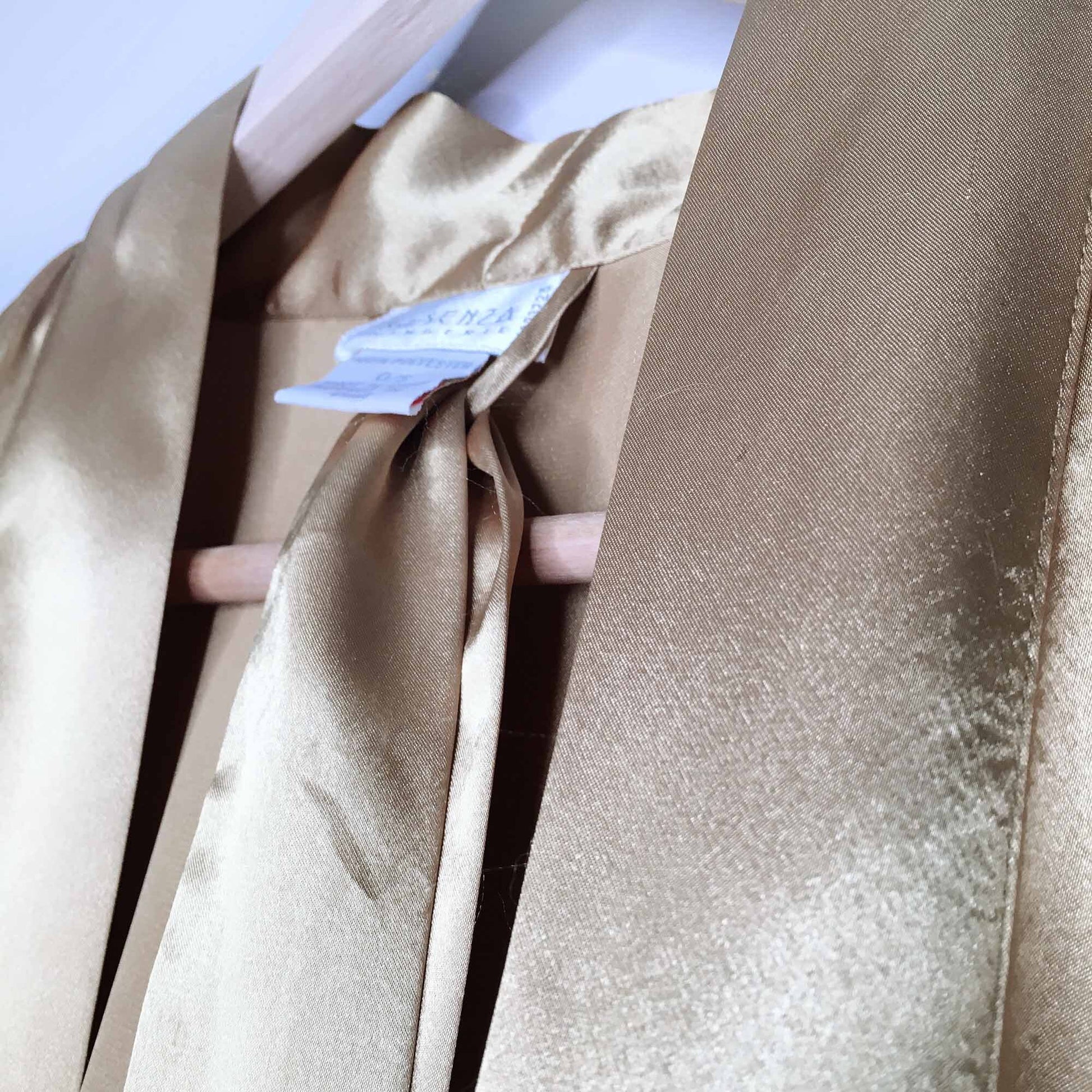 Item Description: This shining gold satin robe from La Senza (perhaps from their bridal line) is a shimmery seductive housecoat that ties inside and tie closure. 100% polyester