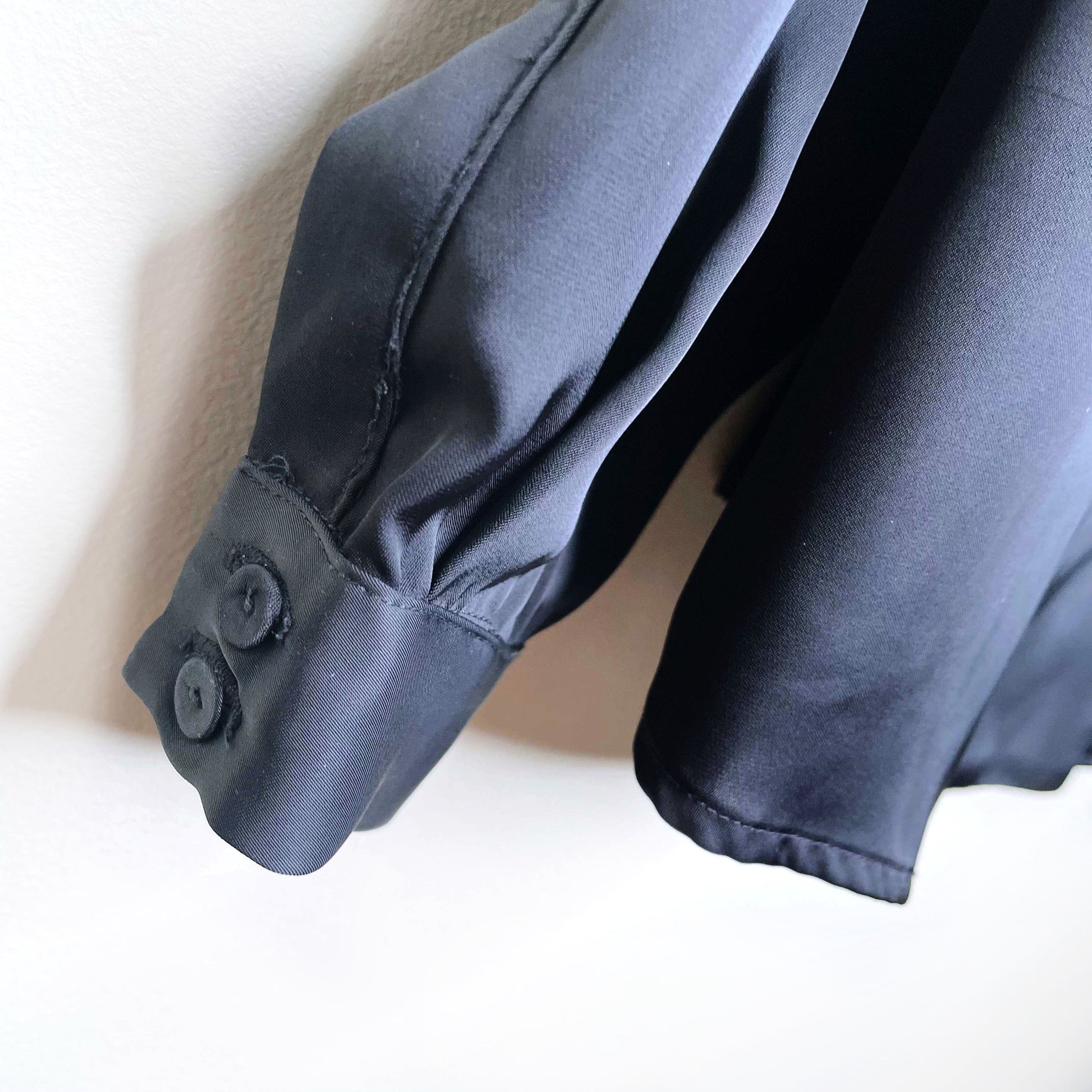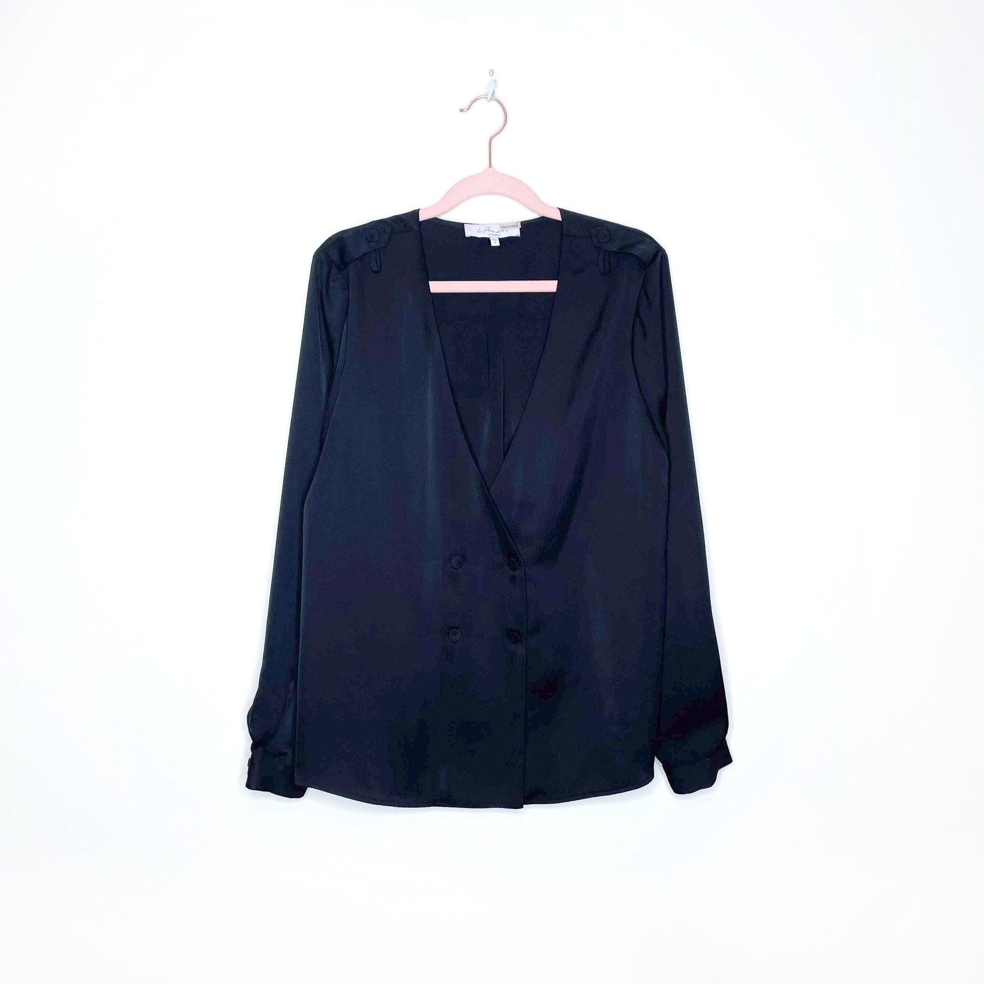 Item Description: This military inspired blouse from L'Academie features a soft and flowy satin fabric, epaulette shoulders and double breasted front with deep V. 100% polyester
