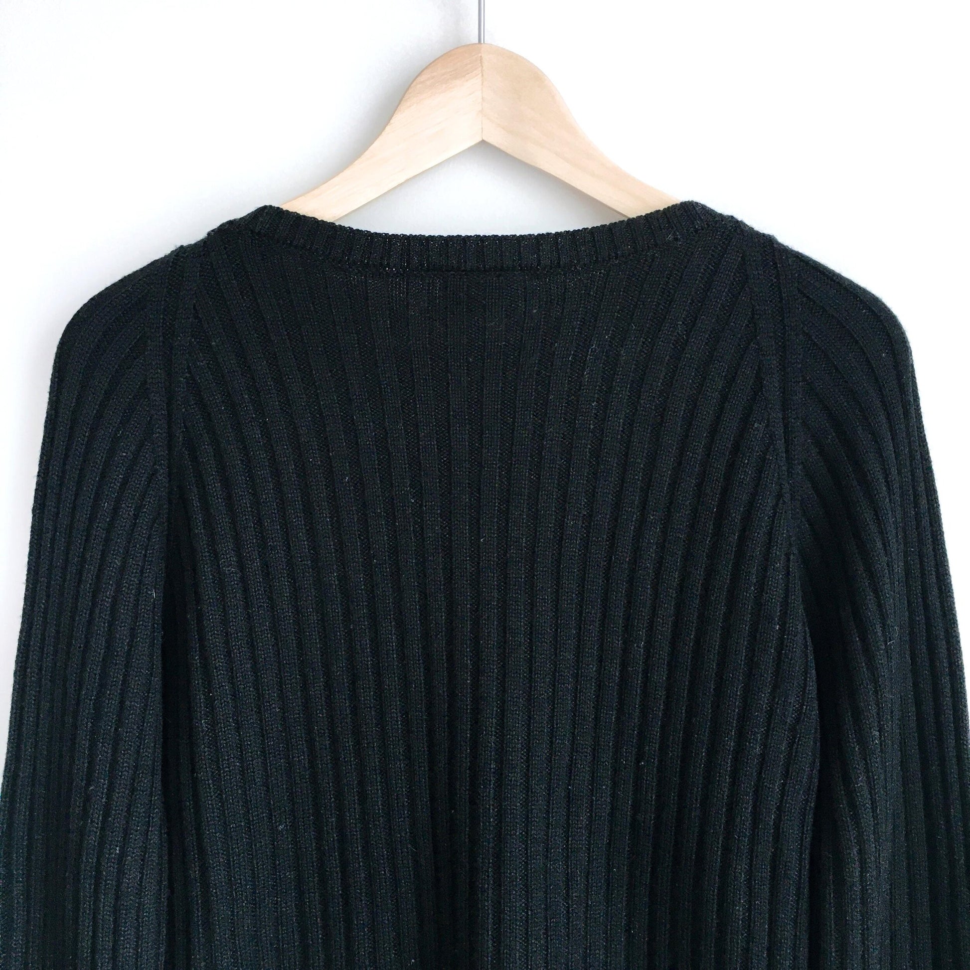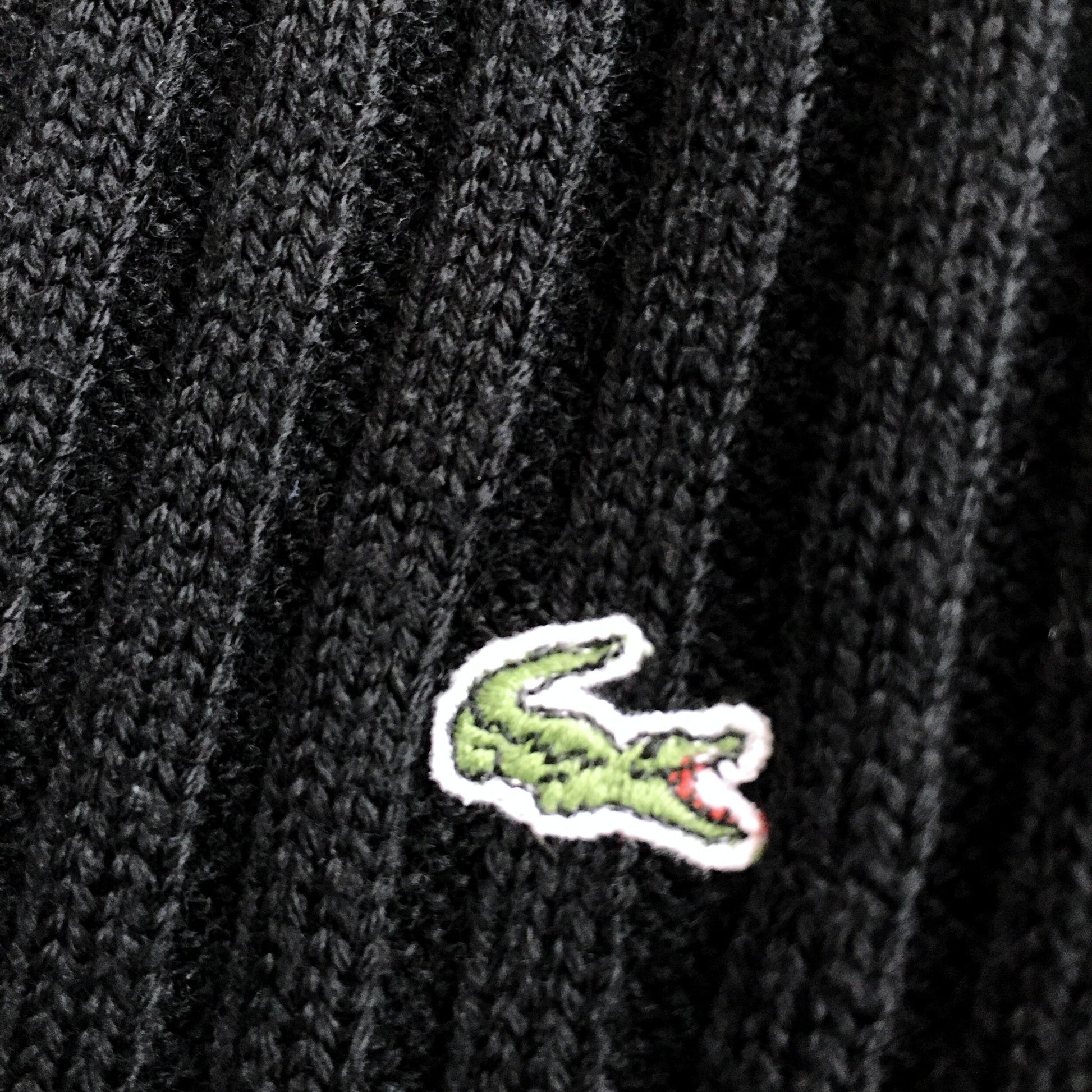 Item Description: This black v-neck wool jumper from Lacoste has all the casual sporty vibes the brand oozes. Classic chunky rib texture, crocodile patch logo on chest and v-neckline. 100% pure new wool
