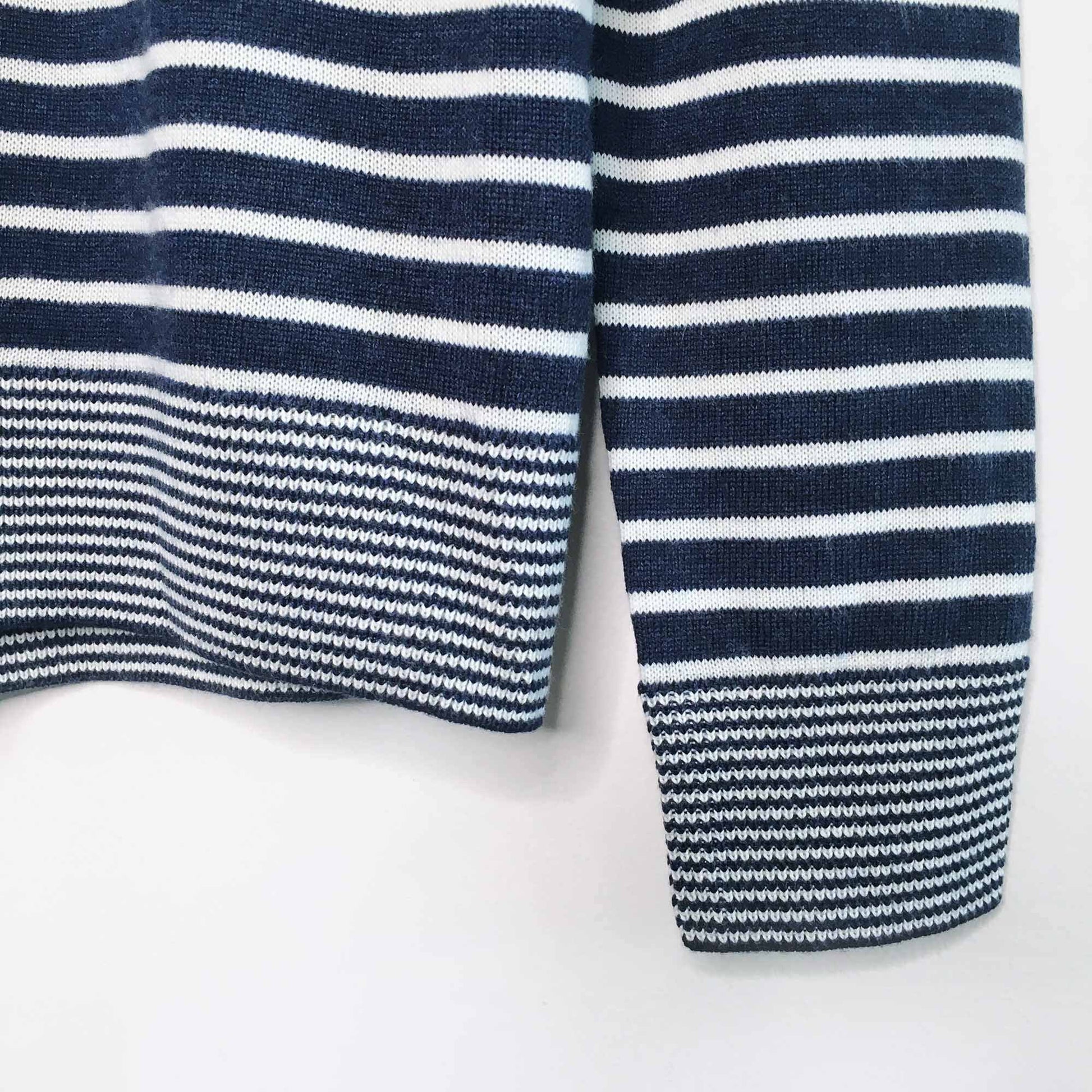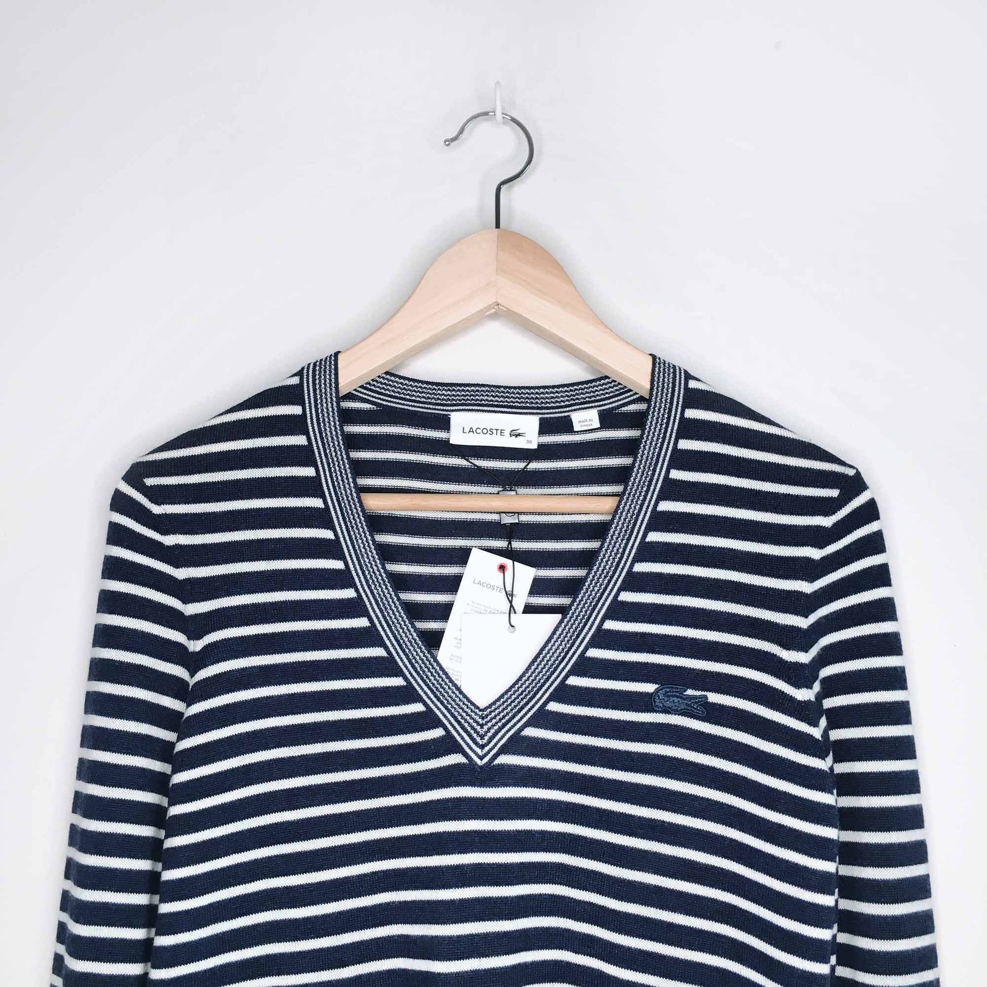 Item Description: This medium weight wool-blend sweater from Lacoste features a blue and white striped shell with contrast strip trim. 87% wool 13% acrylic