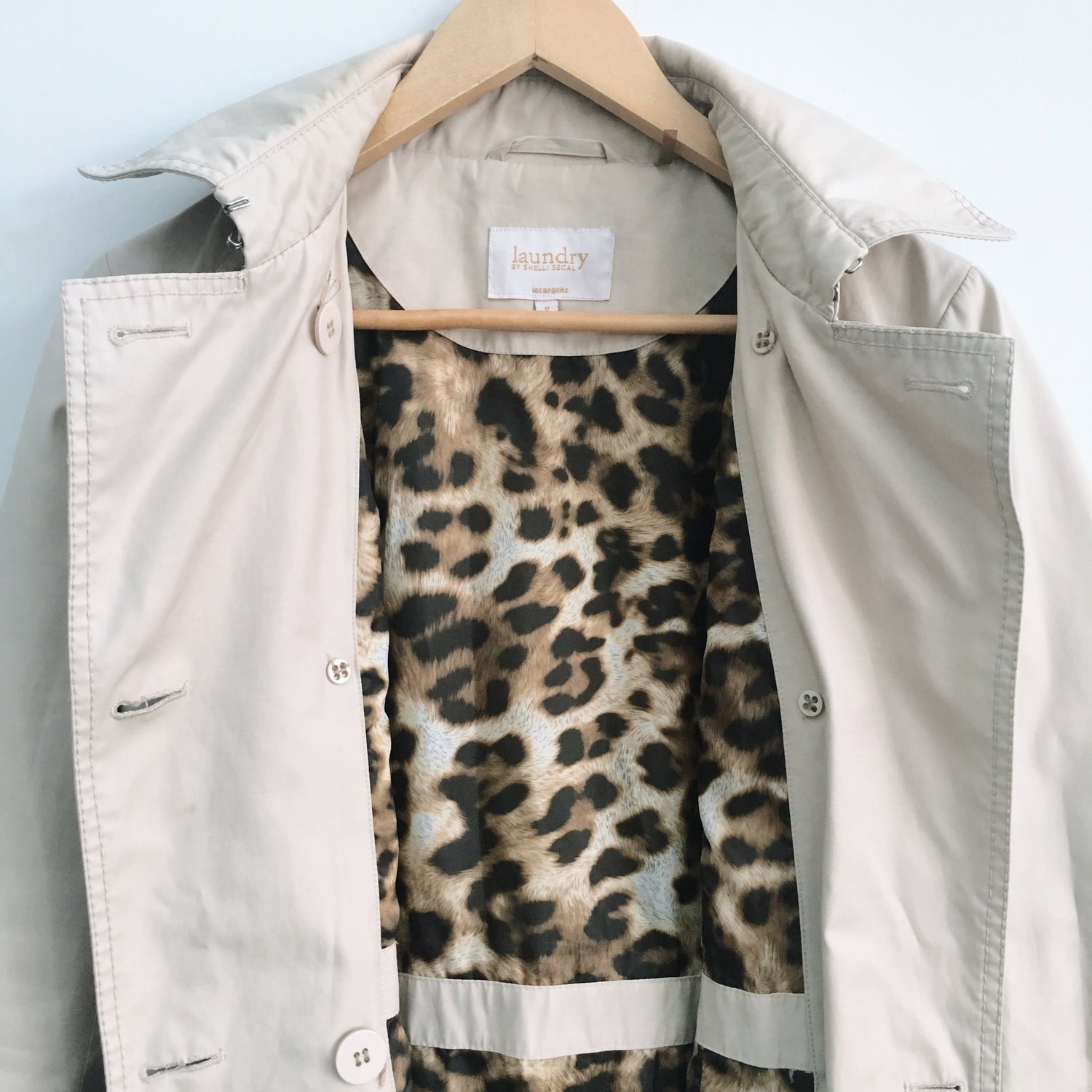 Item Description: This leopard lined trench coat from Laundry is ready for your spring wardrobe! Features front lapels, double breasted front and drawstring wait.