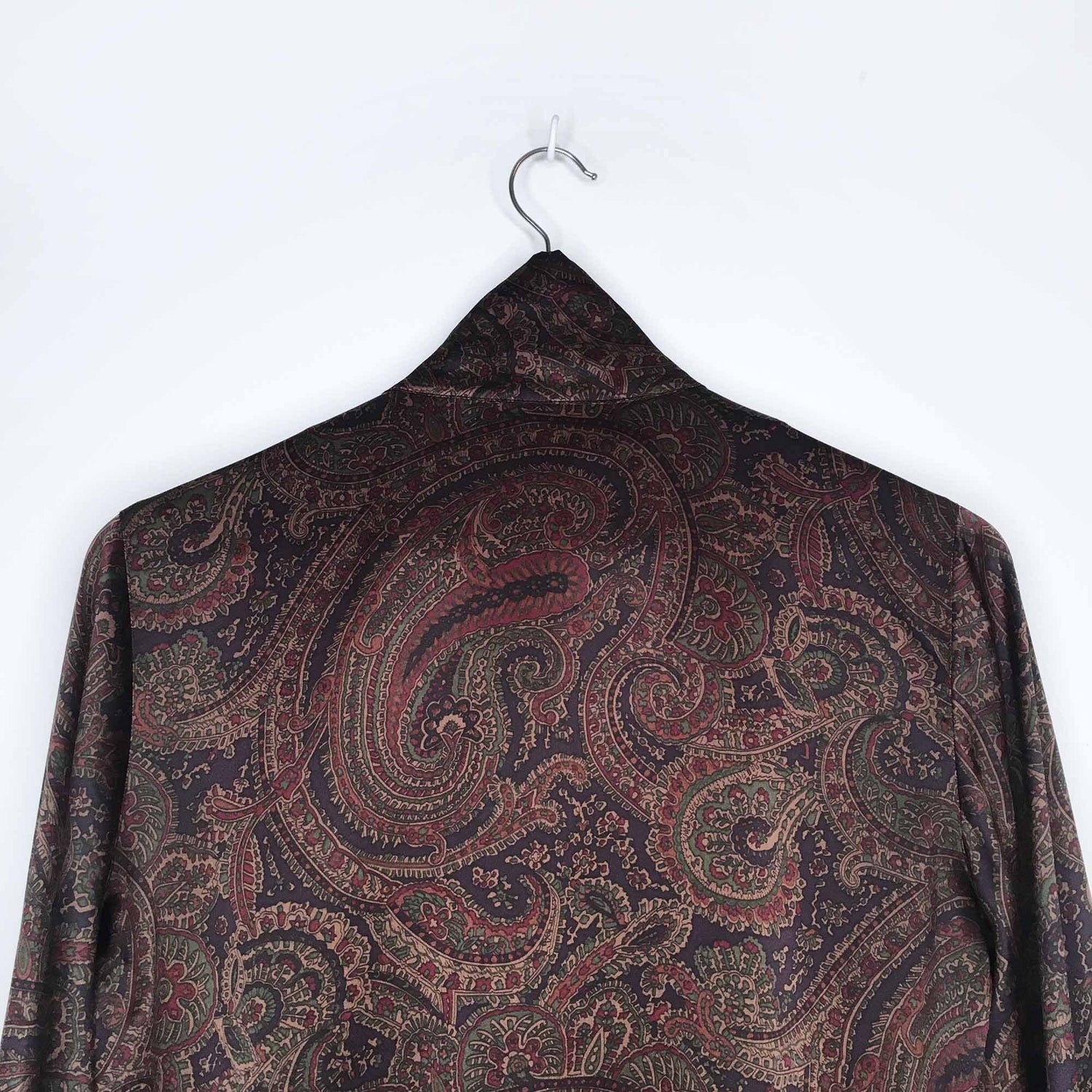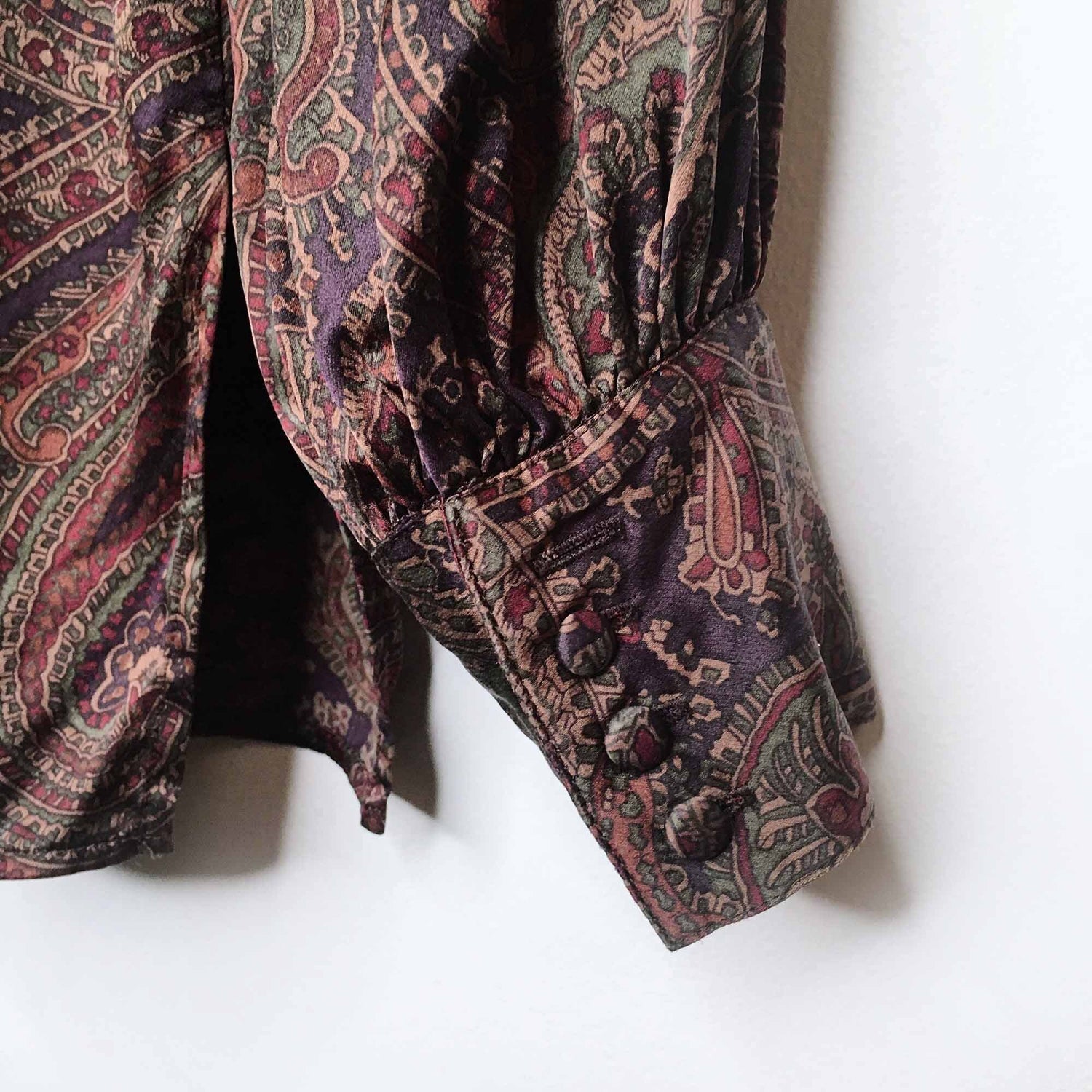 Item Description: This elegant silk blouse from Lauren Ralph Lauren has a total vintage vibe to it with oversized button cuffs that add a billow of drape to the sleeve, high neck with 1/2 button closure and a pintuck at the bottom for added drama. All decked out in a gorgeous silk paisley print. 100% silk