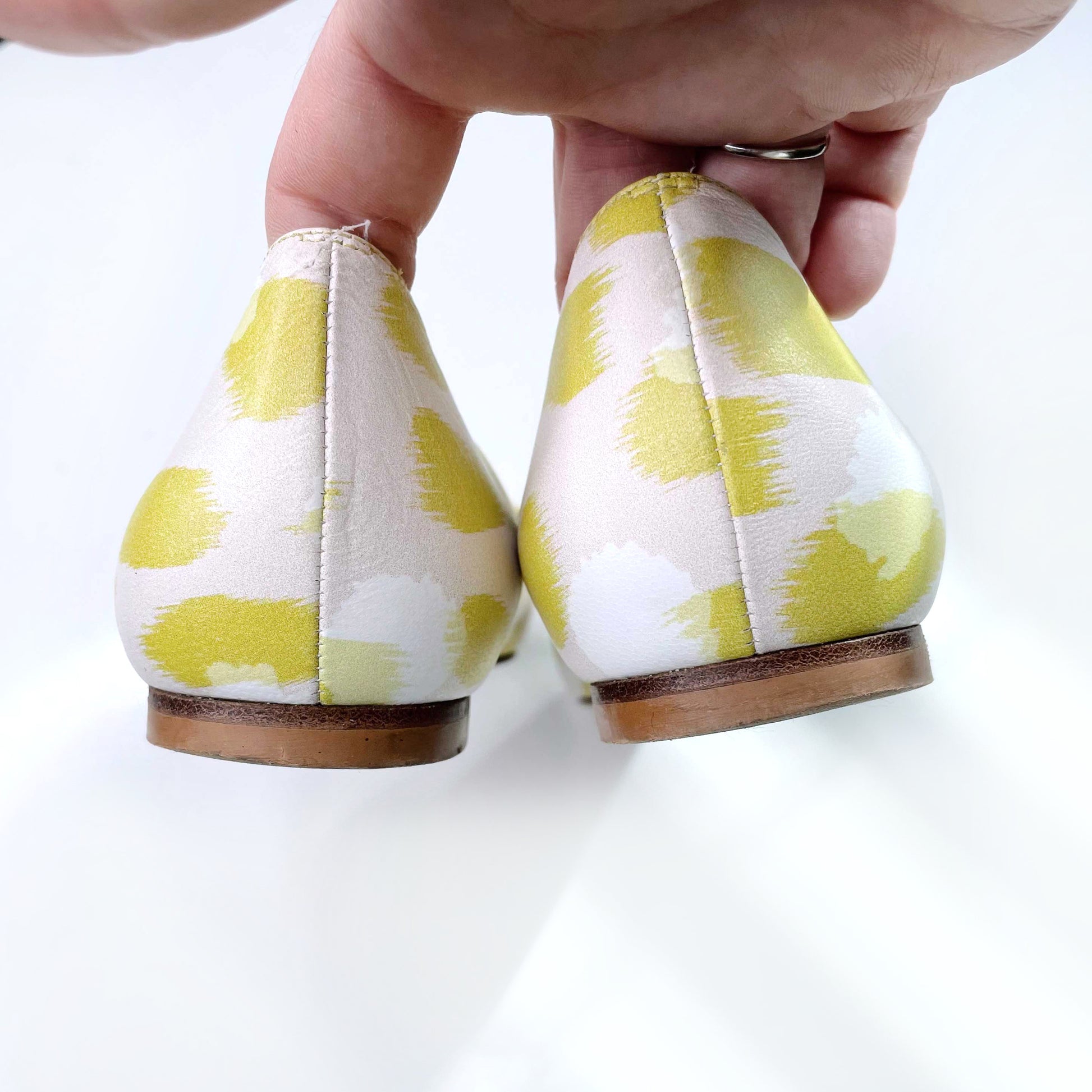 Item Description: These every day pointed toe Irani flats from LK Bennett feature an all-over lime green and white splash print on a soft leather shell, complete with bow toe. 100% leather upper and sole