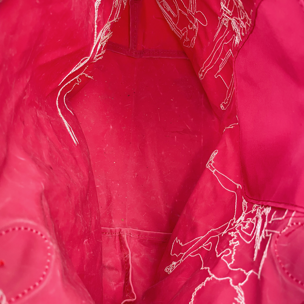 Item Description: This handy tote bag from Longchamp features an embroidered city scene in a bright pink hue with leather handles and trim. Packable into a small wallet-sized bag.