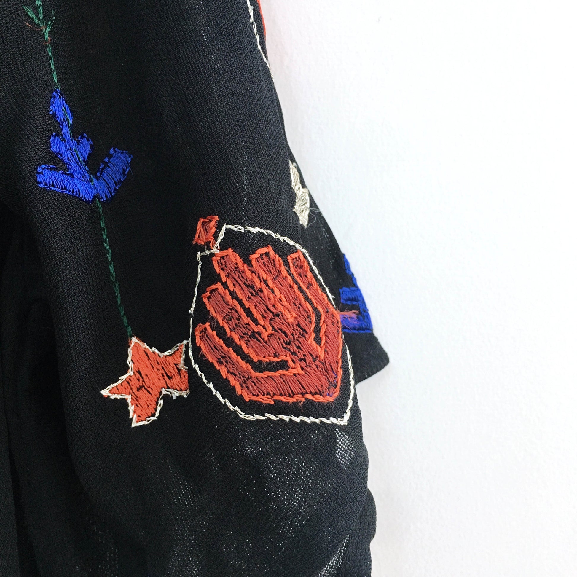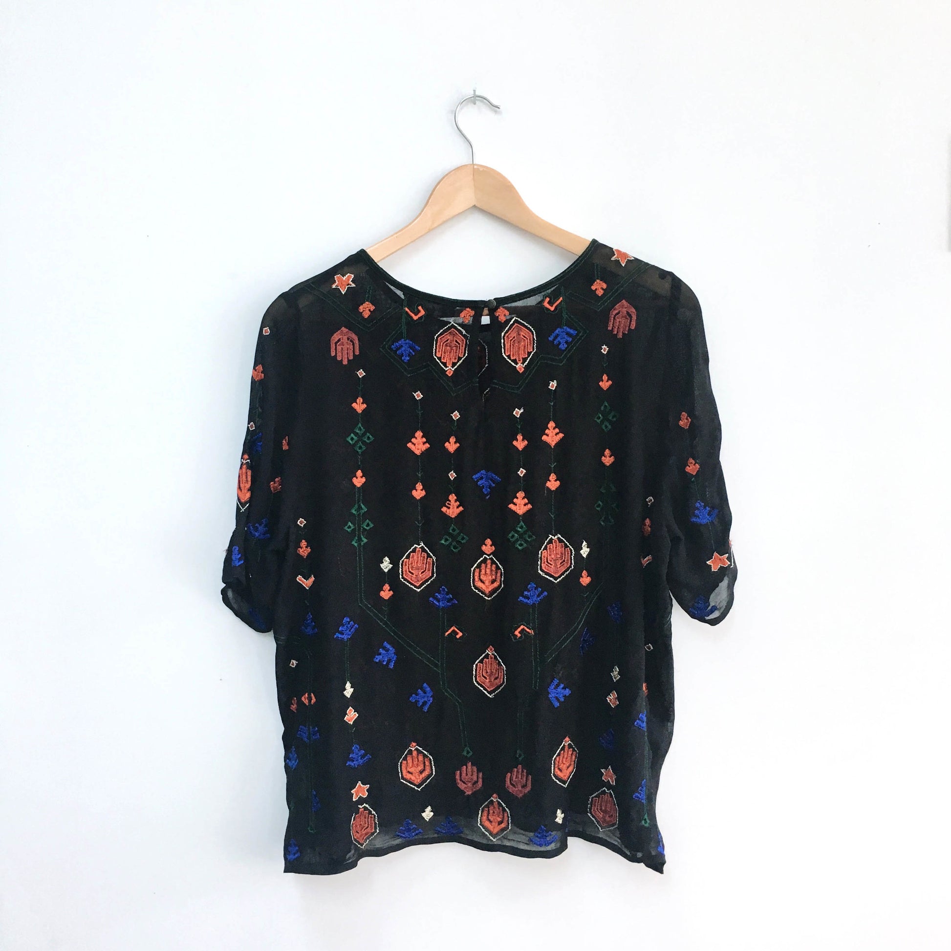 Item Description: This semi-sheer black blouse tee from Lucky Brand captured all the boho vibes and embroidered them onto this shirt. Bits of metallic thread throughout, this gem is just a must-have. 100% rayon