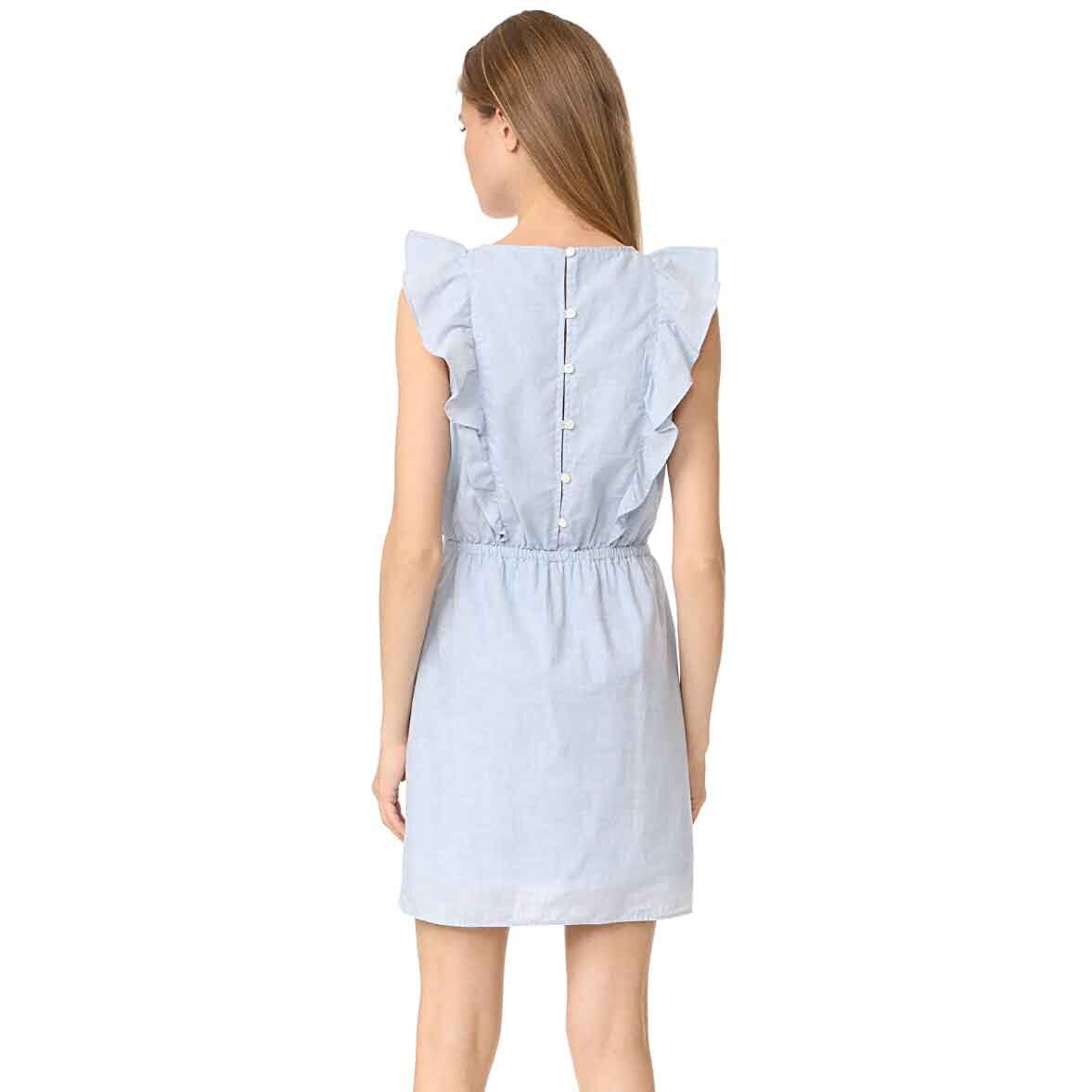Item Description: A sleeveless Madewell dress with ruffle-trimmed seams at the bodice. Covered elastic waistband. Button back placket. Lined. 100% cotton Colour: craft blue