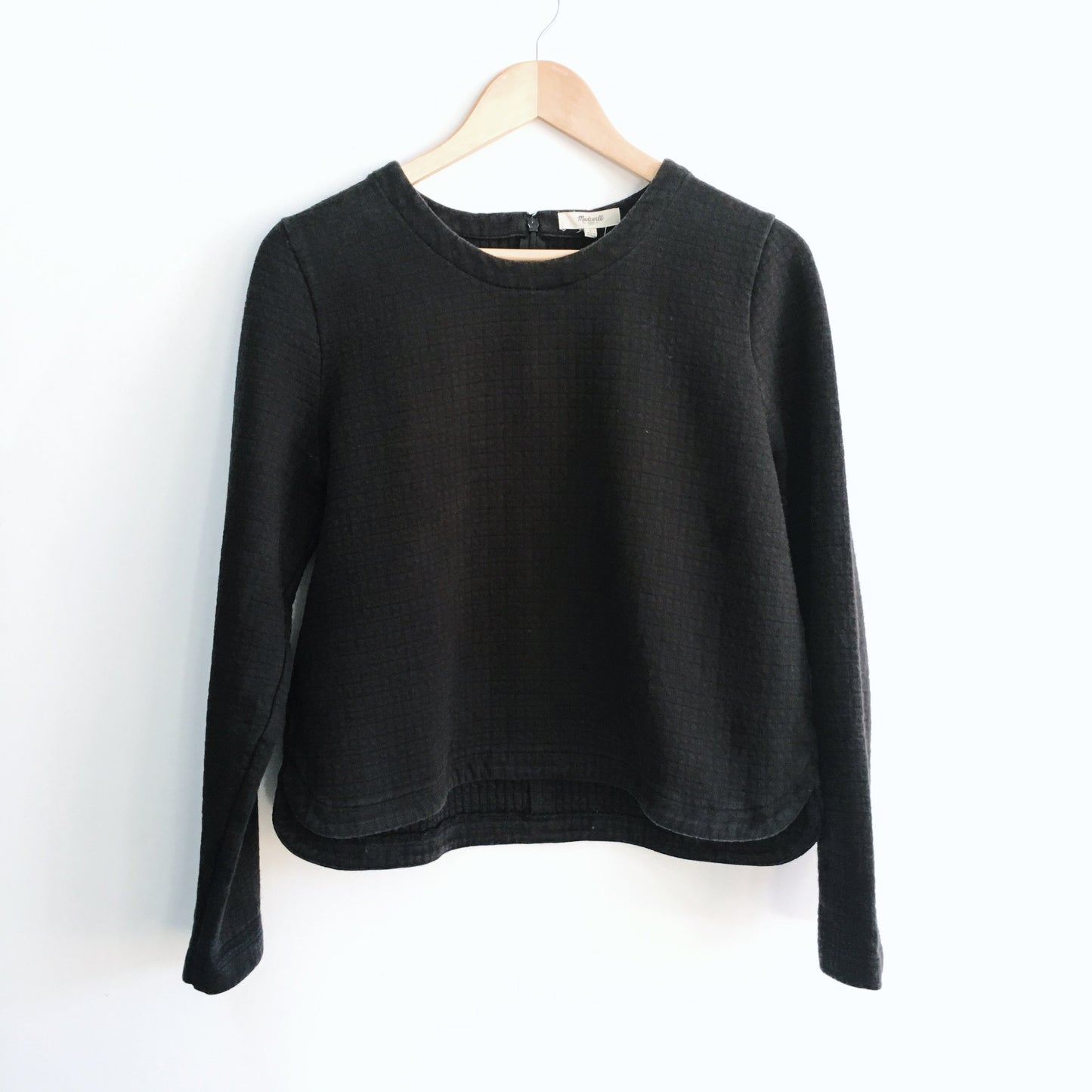 Item Description: A cropped high low Madewell sweatshirt with a hidden zip closure at the upper back. Long sleeves. Small rounded slit on sides.