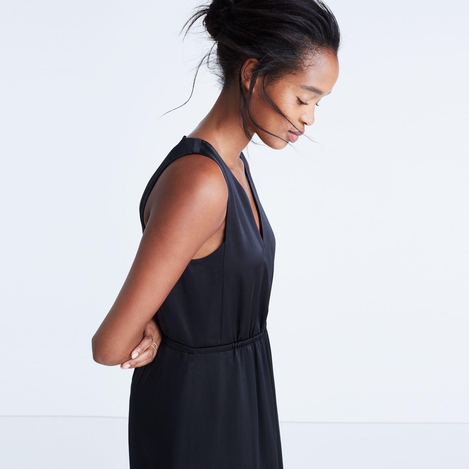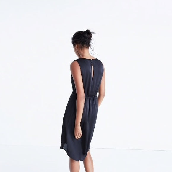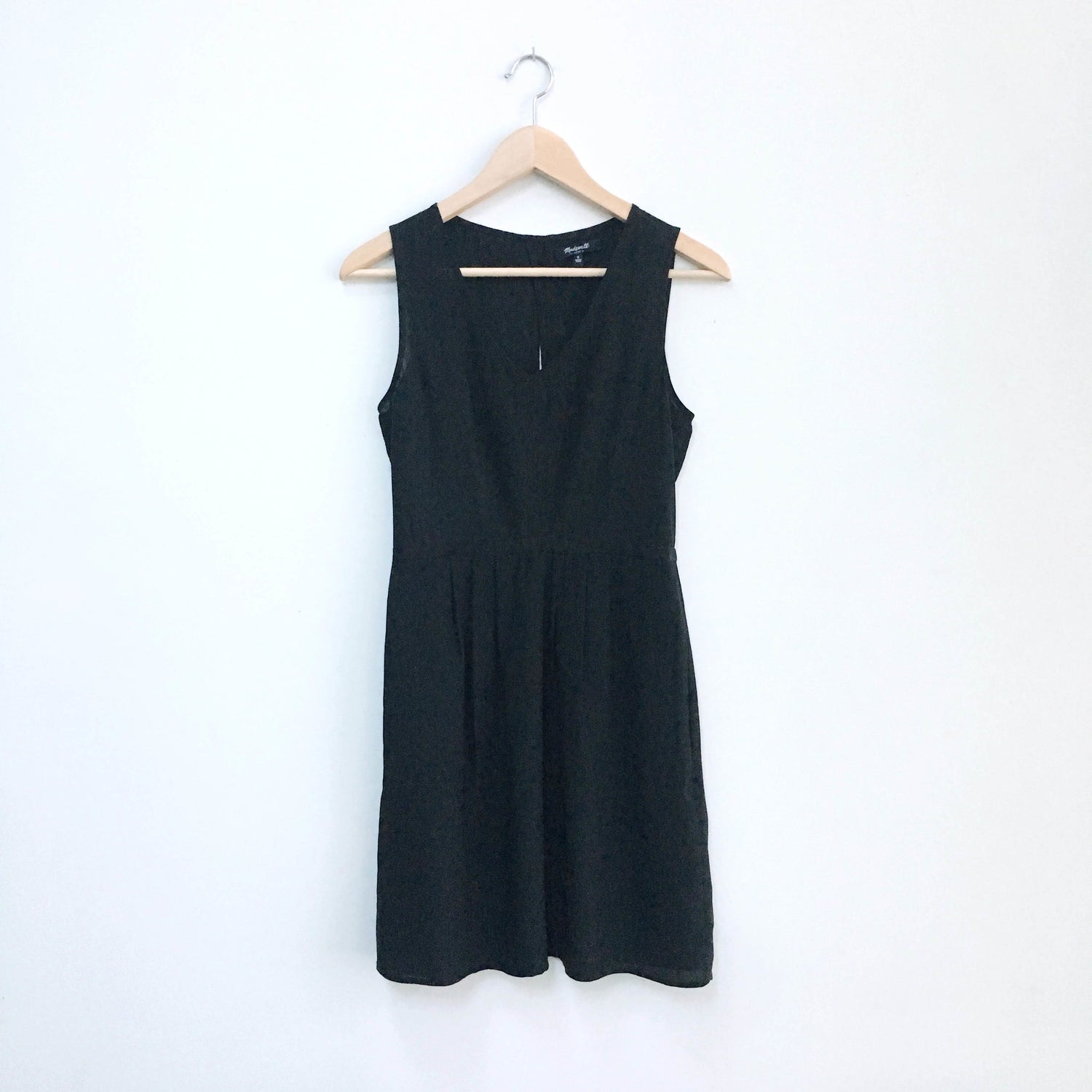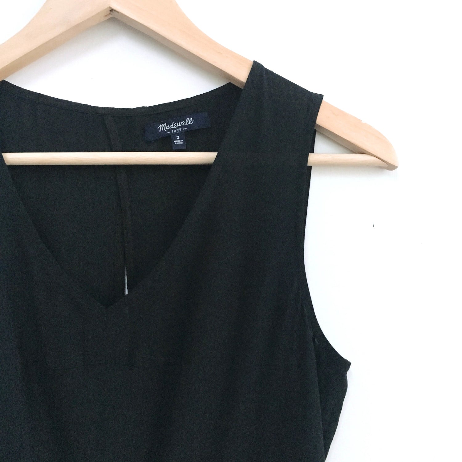 Item Description: The little black dress gets a night out with Madewell! This simple but flattering dress features a v-neck with slimming stitching detail, side pockets, keyhole back and lining at a respectable length. 100% silk exterior, 100% polyester lining