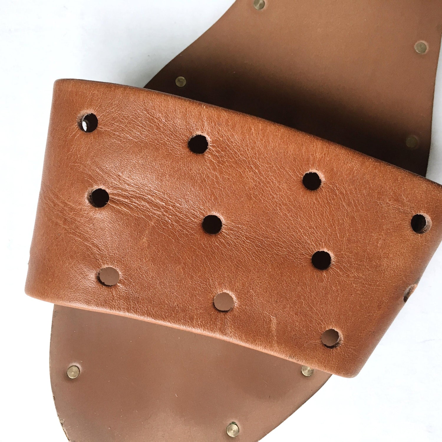 Item Description: These brown leather sandals from Madewell feature a hole punch toe strap with heel slingback and rubber sole.