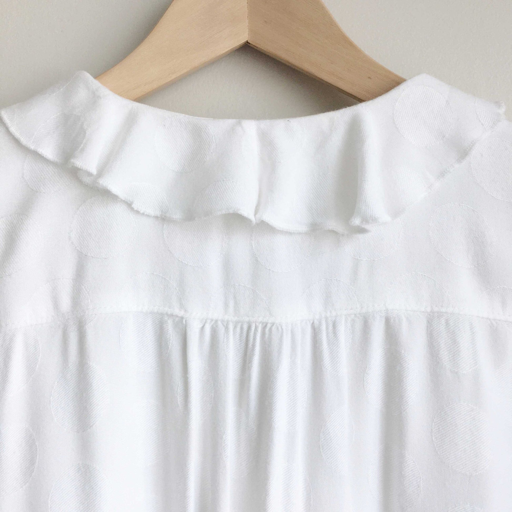 Item Description: This lightweight viscose v-neck button down from Maeve at Anthropologie features a ruffle neckline, rolled sleeves and hidden polka dot pattern, with a front pocket. 100% viscose