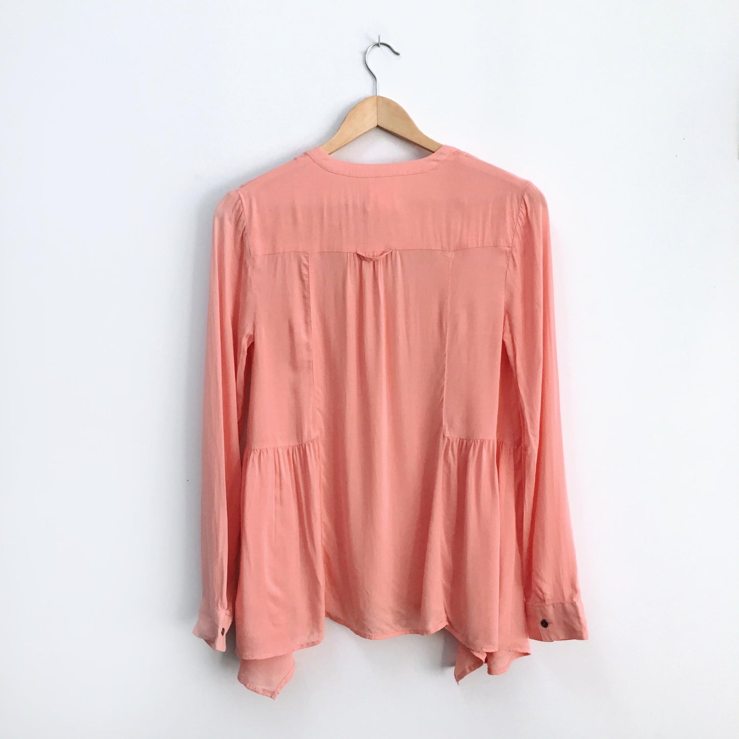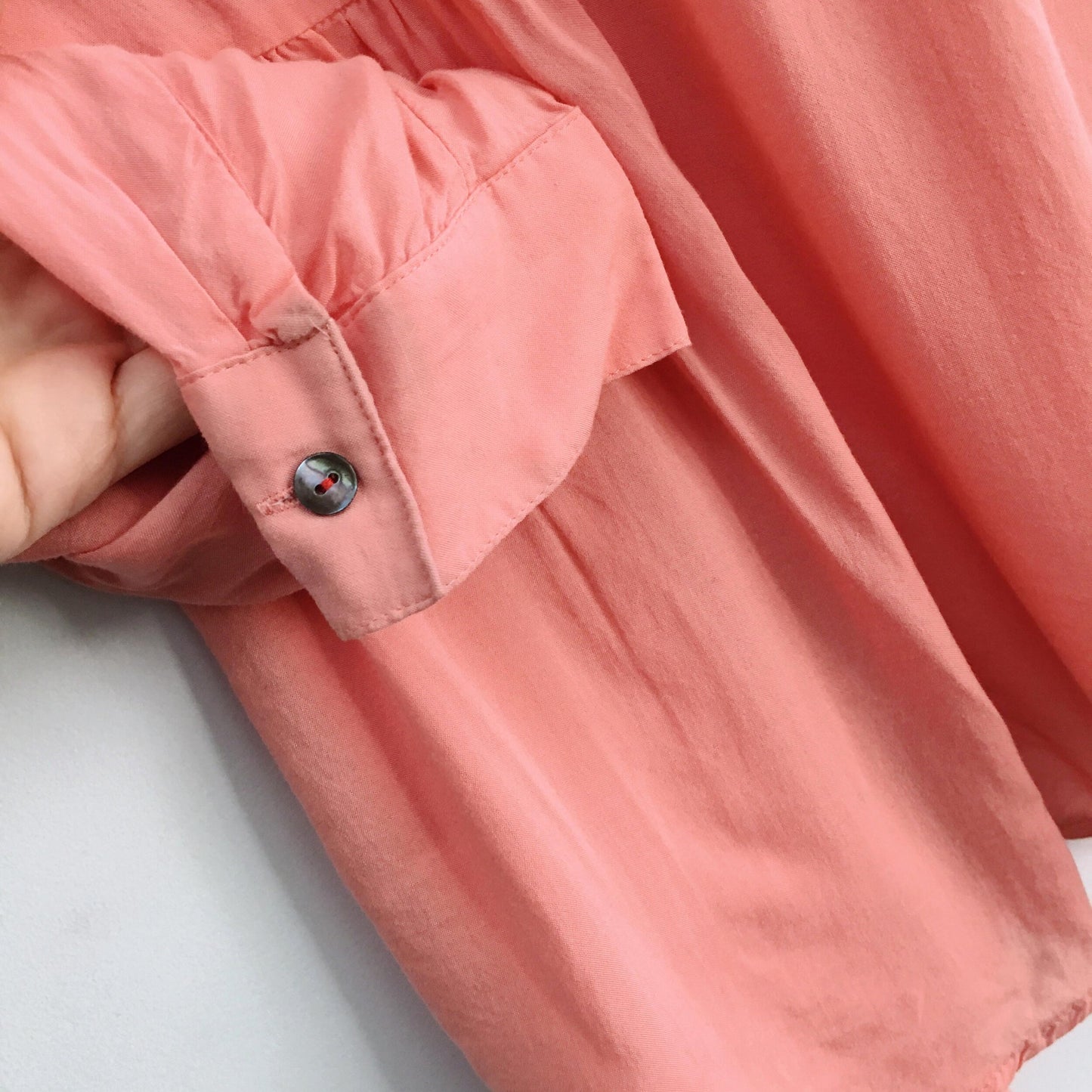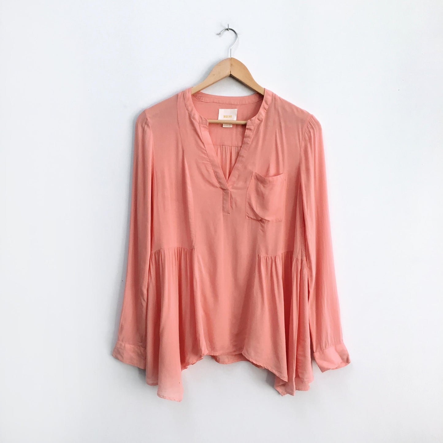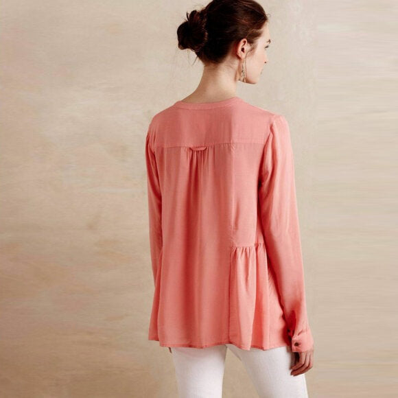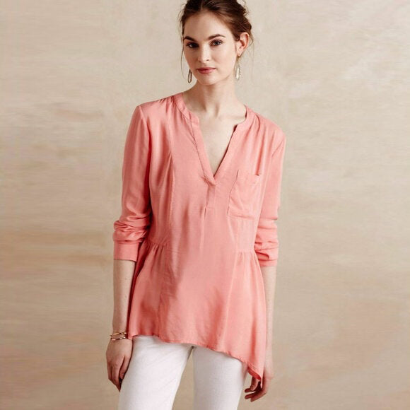 Item Description: A soft and flowry blouse, this shark bite henley from Anthropologie features a swing hem, front pockets and button cuffs. 100% rayon