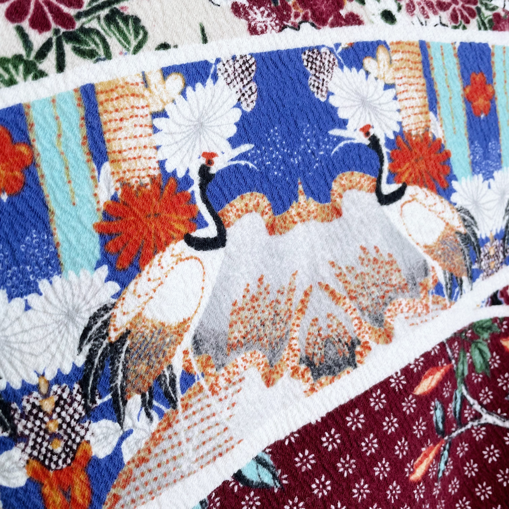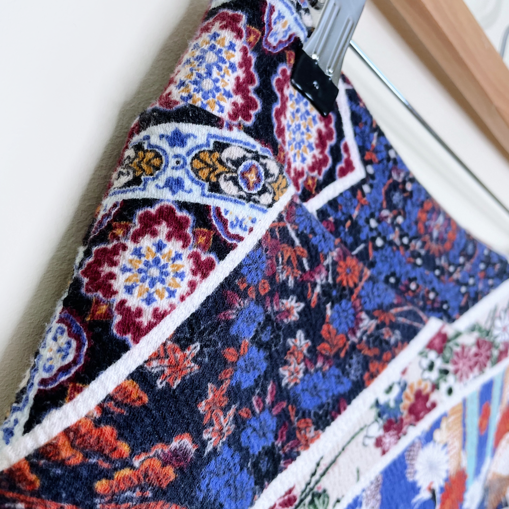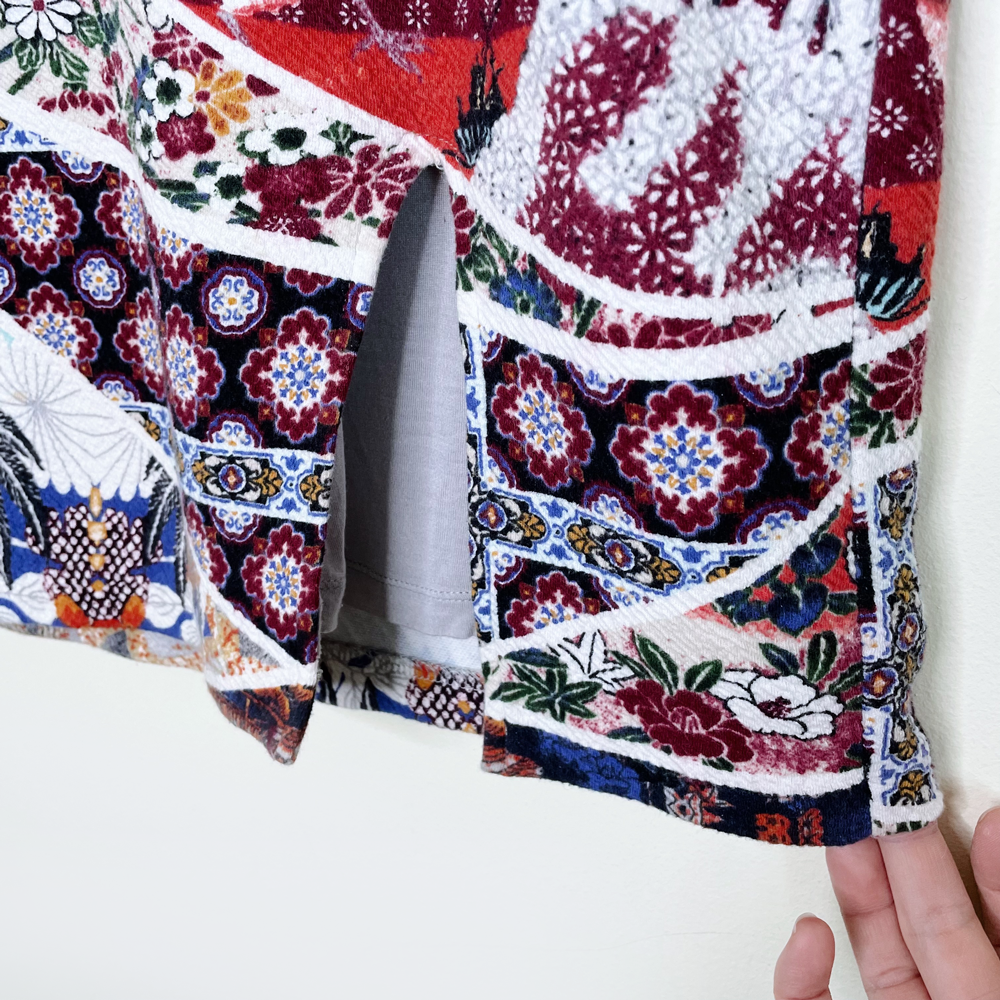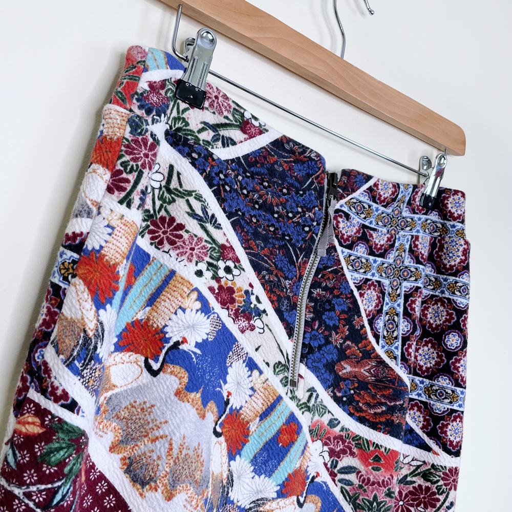 Item Description: This colourful patchwork art designed skirt from Anthropologie features a pique-type textured stretch fabric with knee slit, flowers, cranes and bohemian geometric designs.