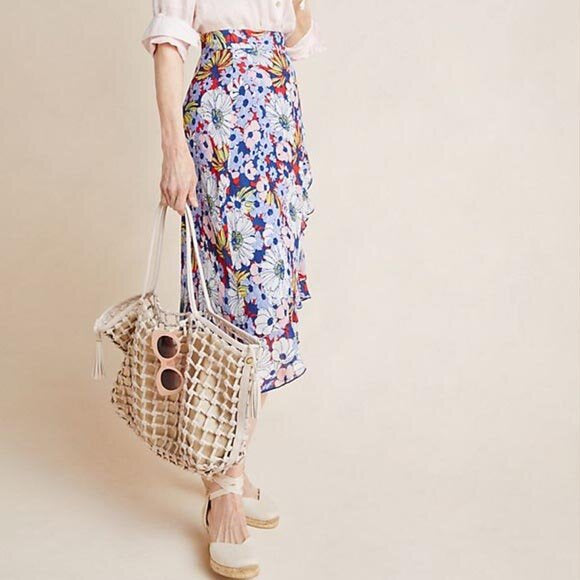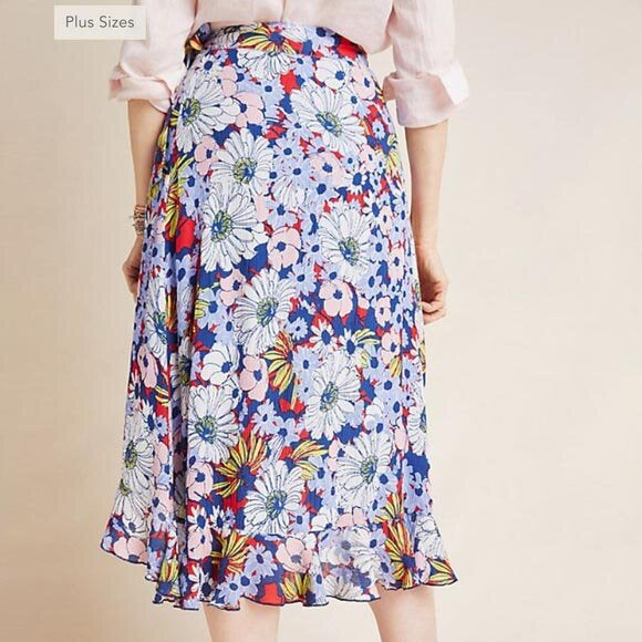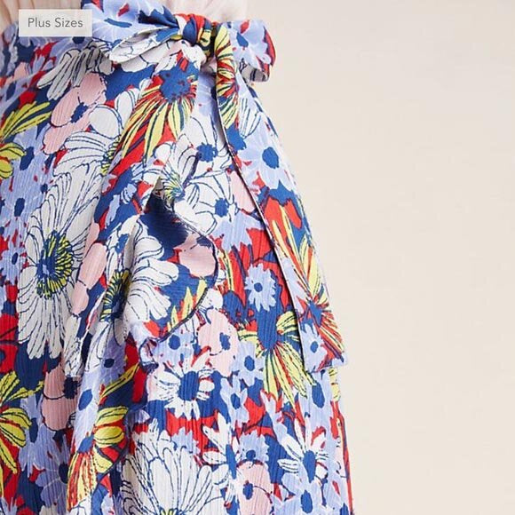 Item Description: This midi wrap skirt from Anthropologie’s Maeve features a tie waist, ruffle hem and floral print. Shell 100% viscose Lining 100% modal