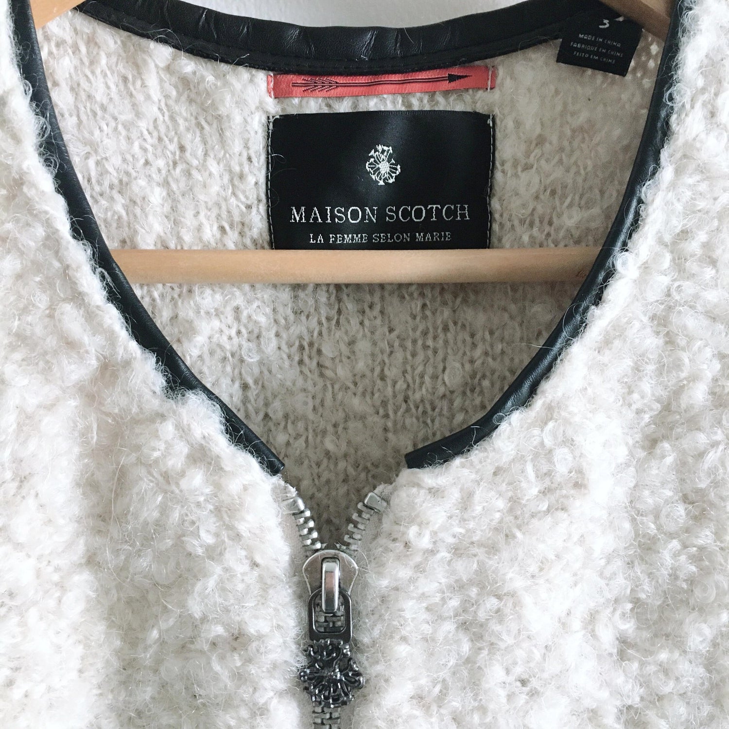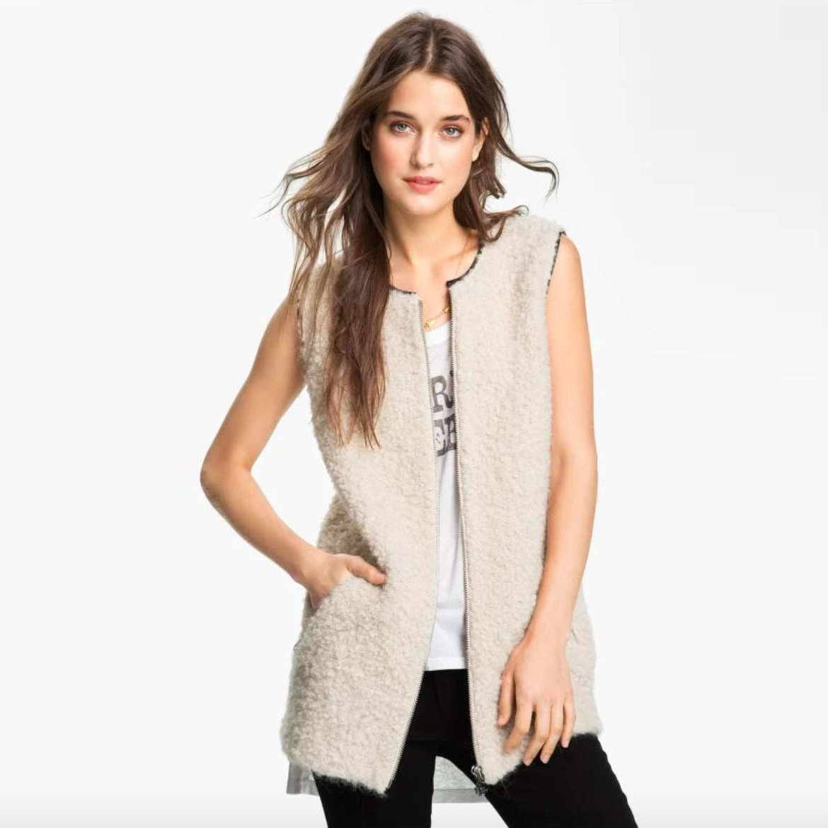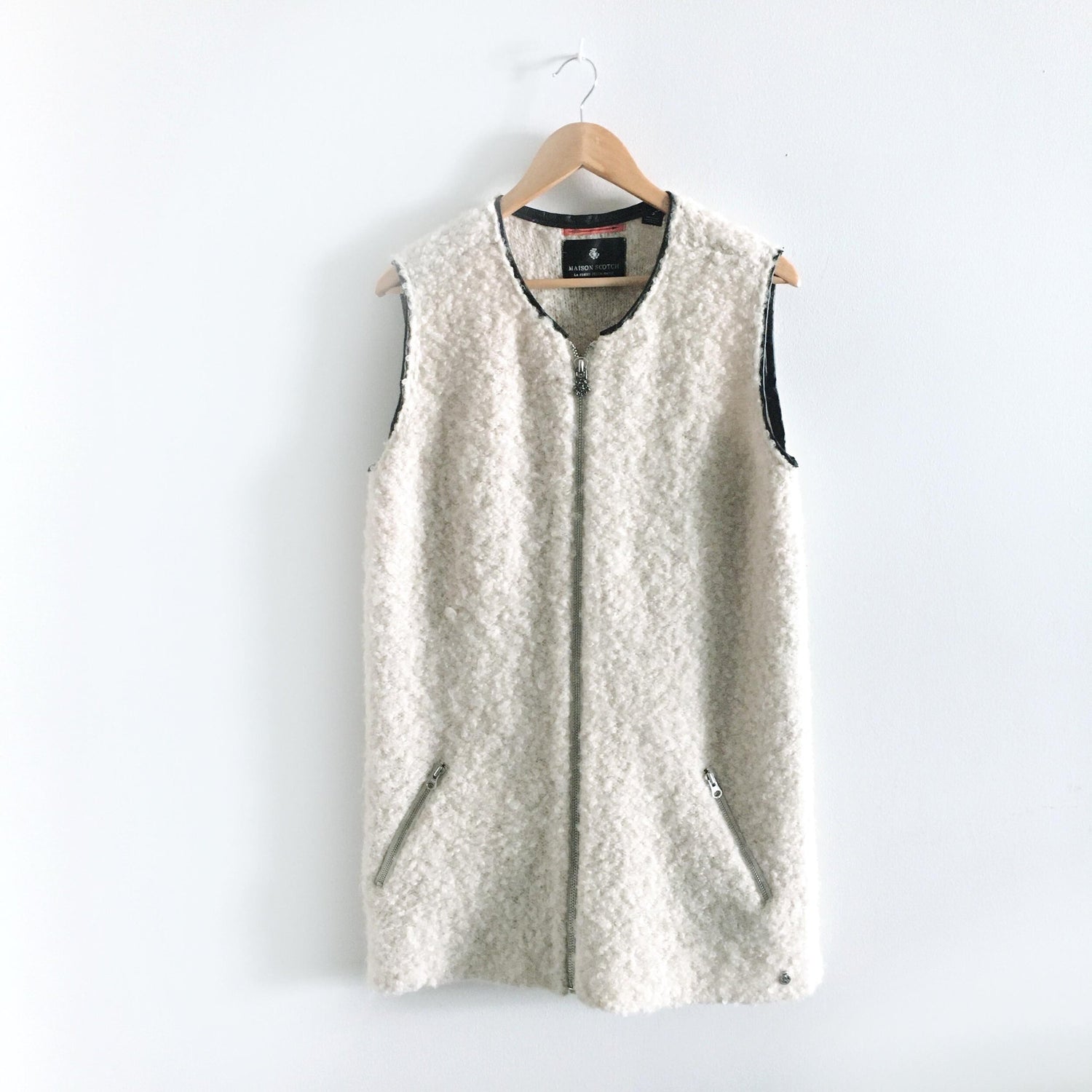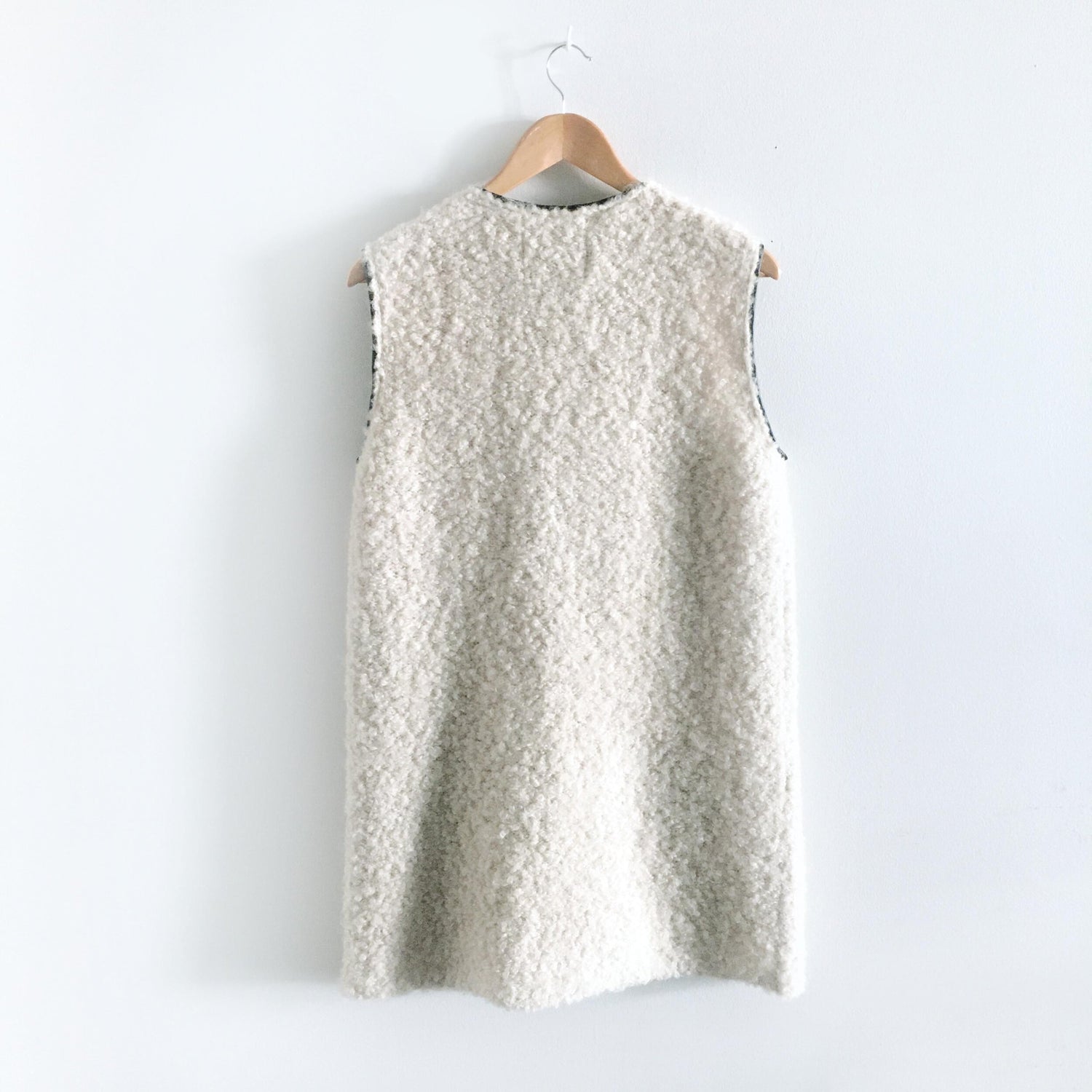 Item Description: A bouclé vest offers the look of chic shearling in a comfortable and cozy knit. Faux leather trim around the neckline and sleeves accentuate the lush look. Wool/Mohair blend.