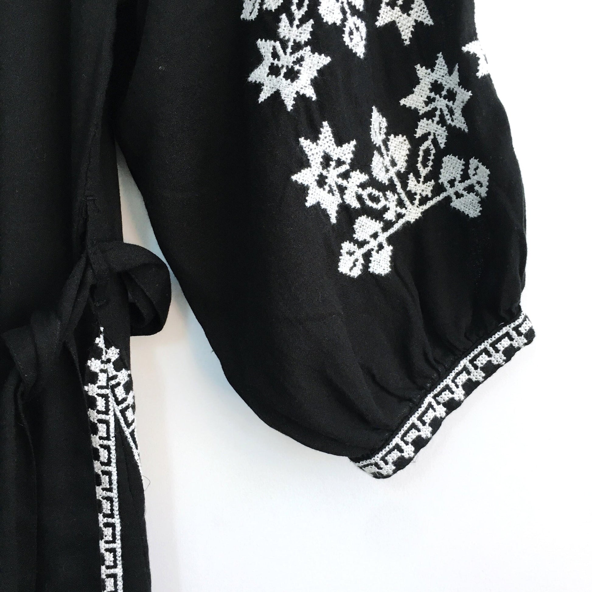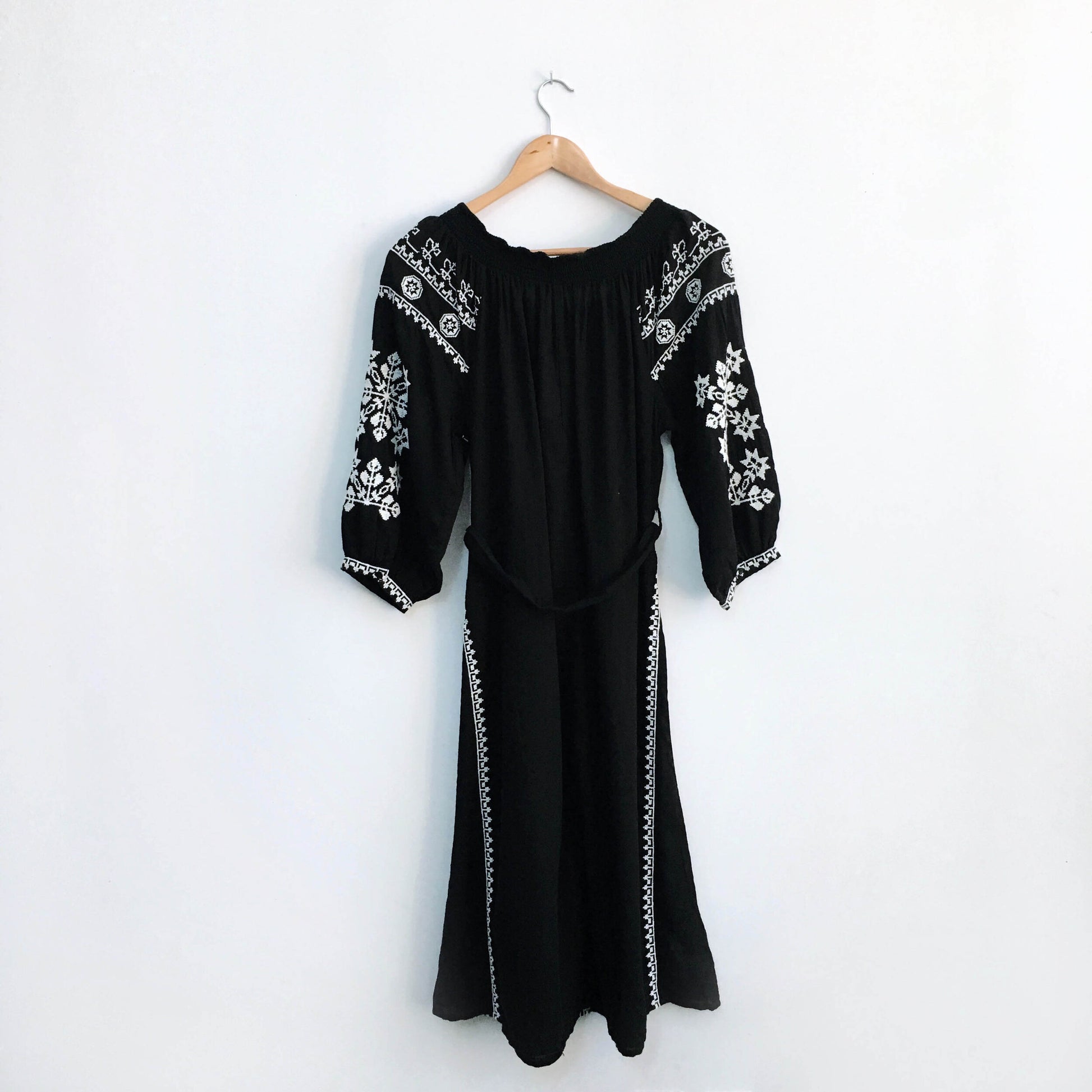 Item Description: A summer cotton dress with white embroidery and front tassle ties set on a stretch neckline, makes this European boho dress a must-have. 100% cotton