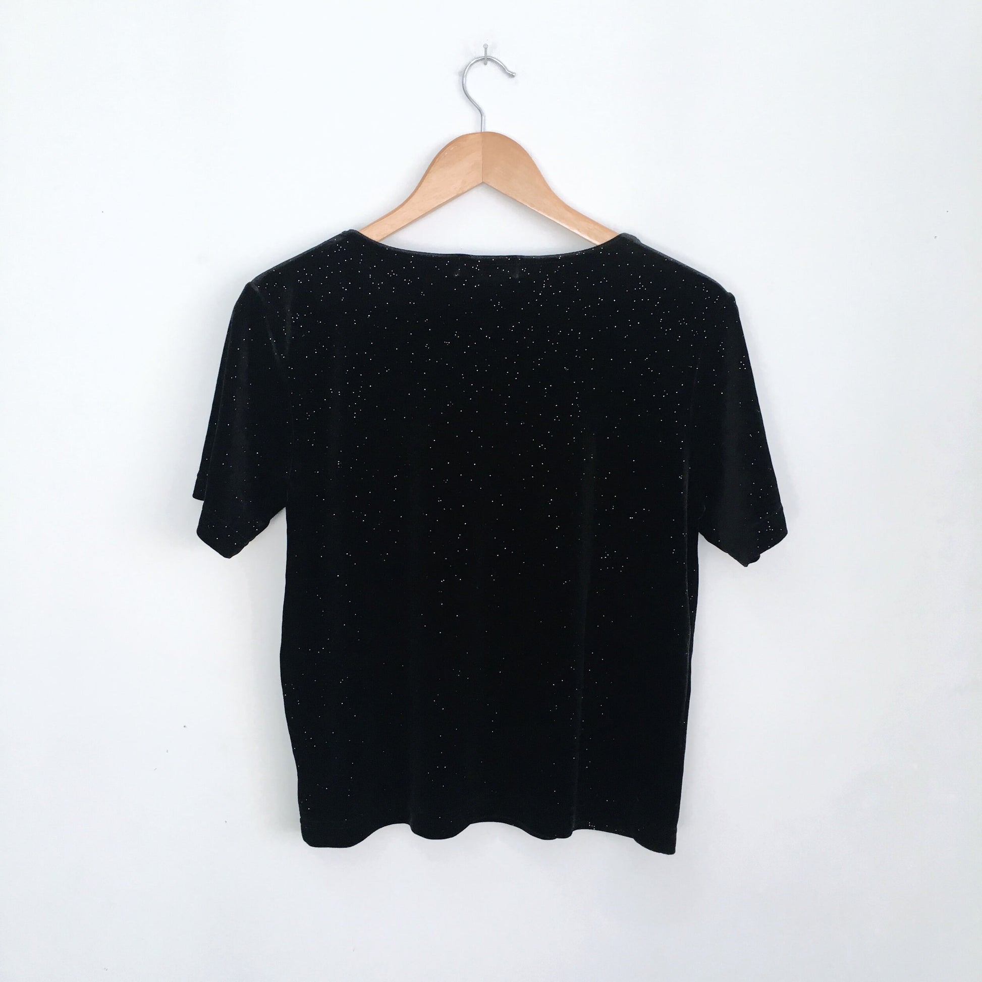 Item Description: This super stunner from Mantles is a soft and luxurious velvet tee with silver sparkles that start slightly bigger at the top and seem to fall softly down the shirt like snow. From The Bay’s private upscale collection. 90% polyester 10% spandex