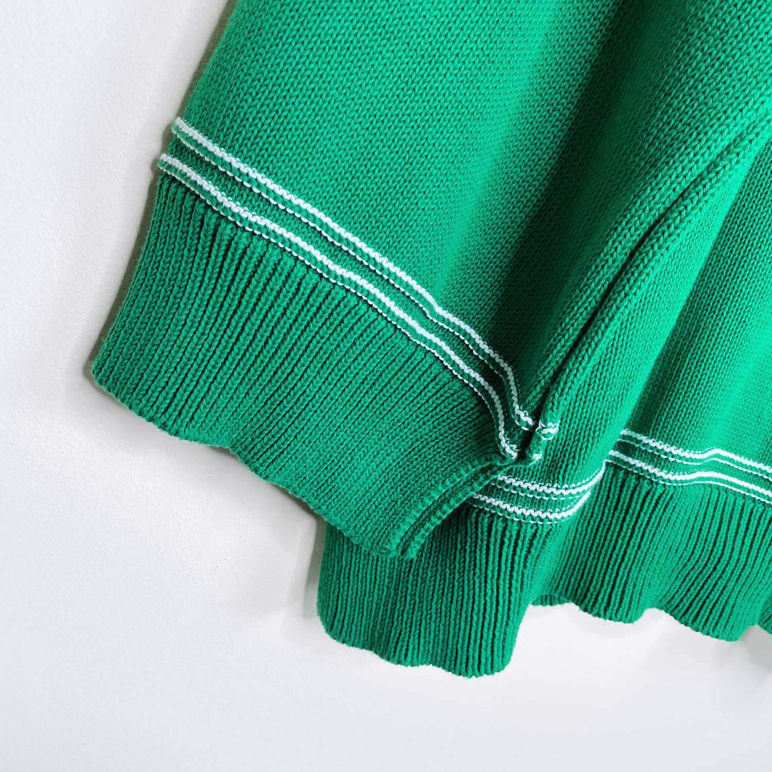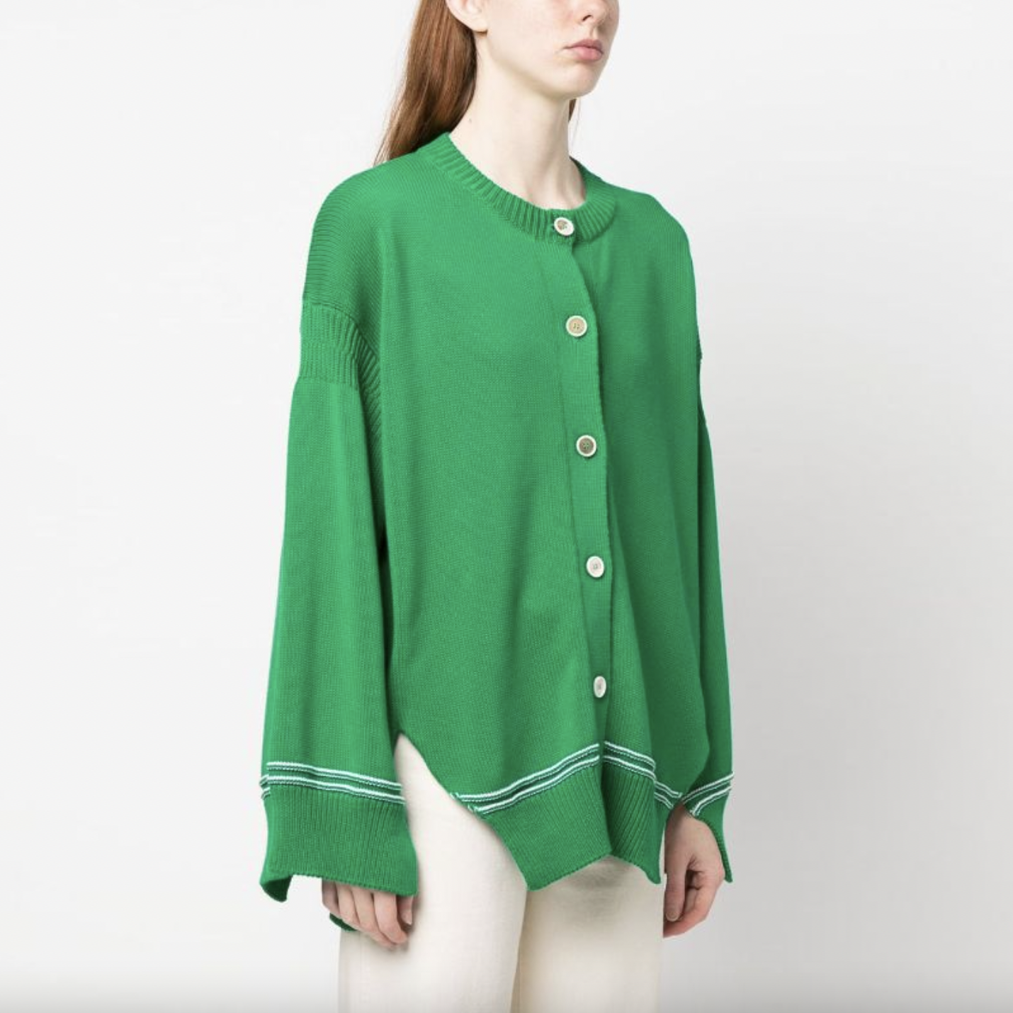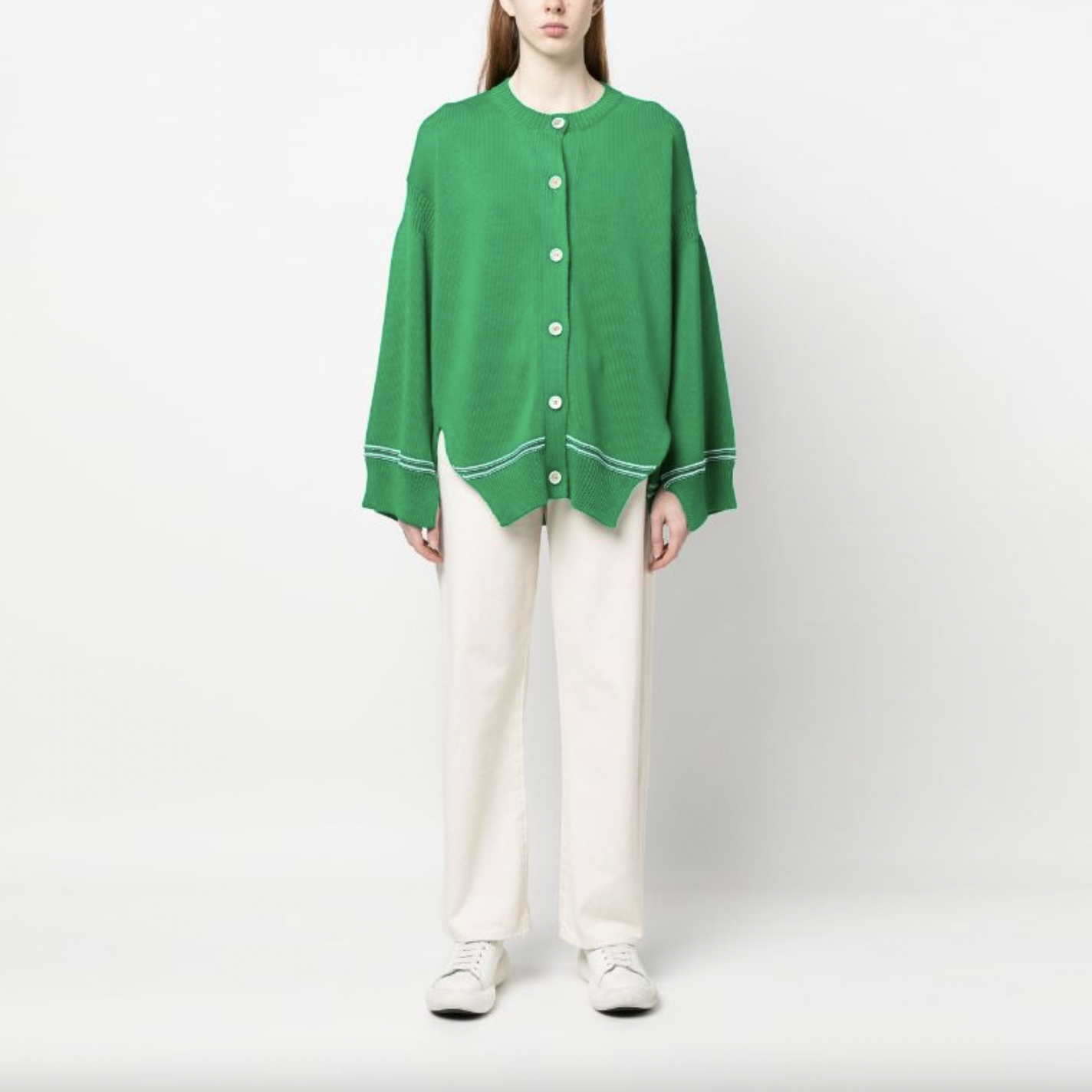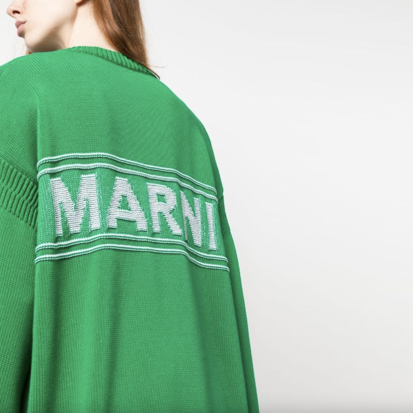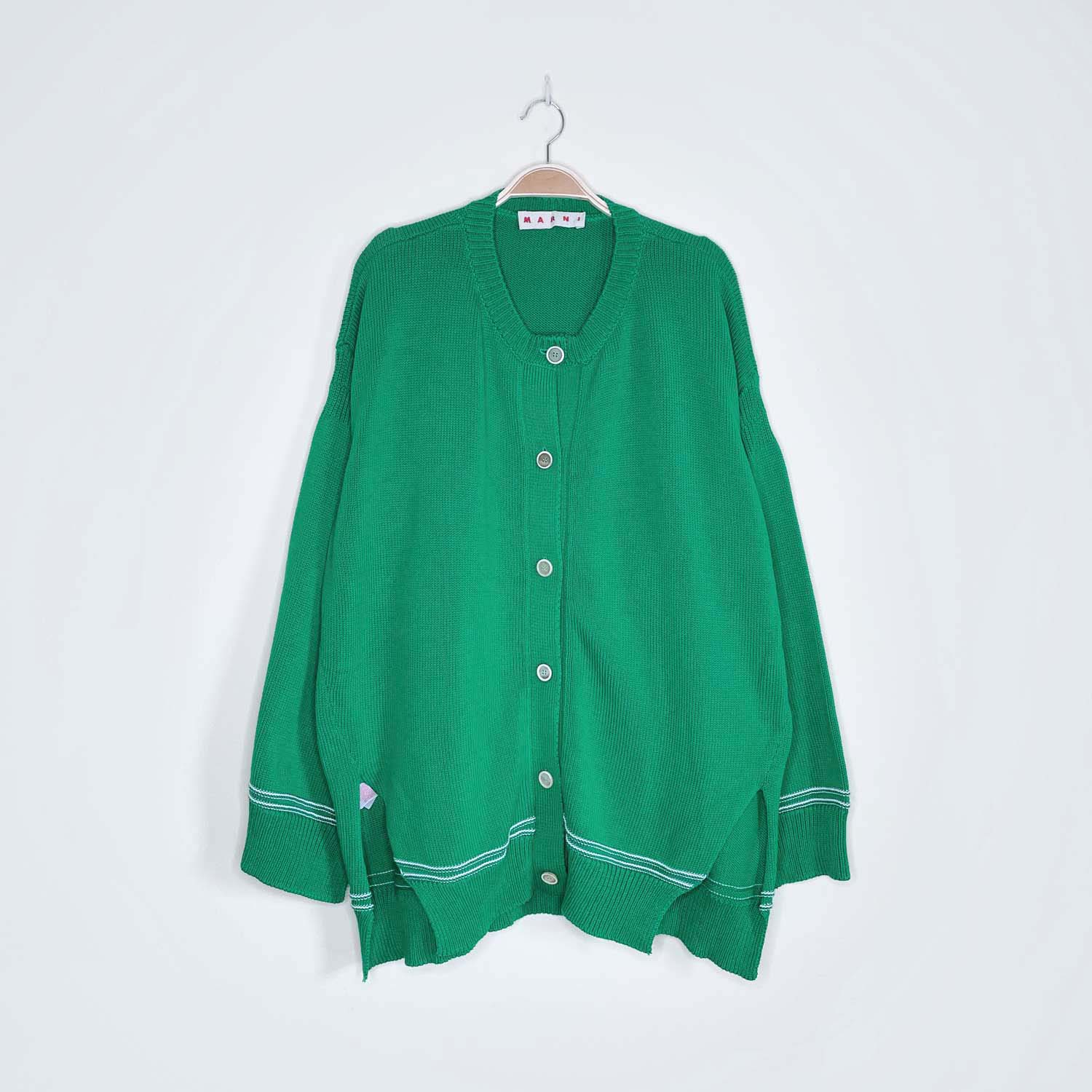 Item description: intarsia-knit logo cotton cardigan from MARNI featuring grass green, cotton, intarsia-knit logo, round neck, button fastening, striped border, long wide sleeves, split cuffs and split hem. 100% cotton