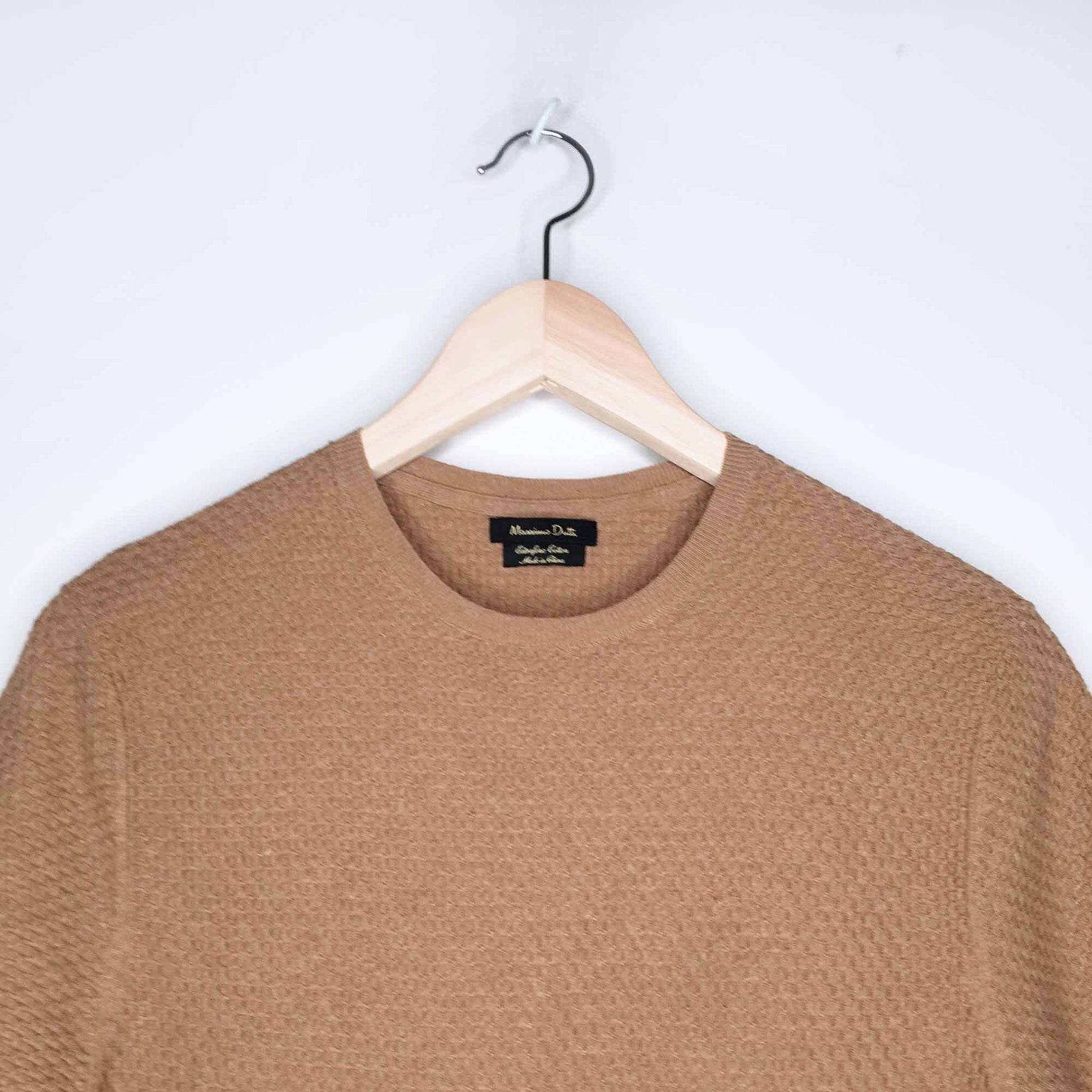 Item Description: This simple woven short sleeve knit from Massimo Dutti is set in a beautiful camel colour and woven with a bit of stretch. Made of extra fine cotton