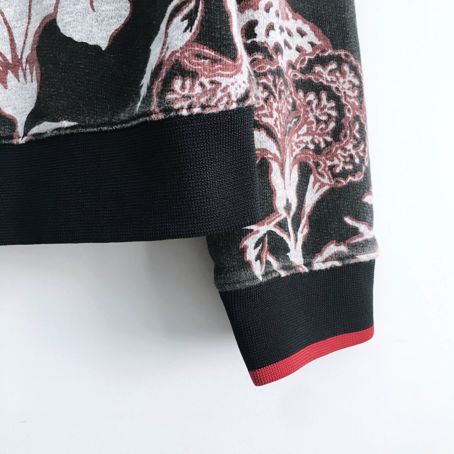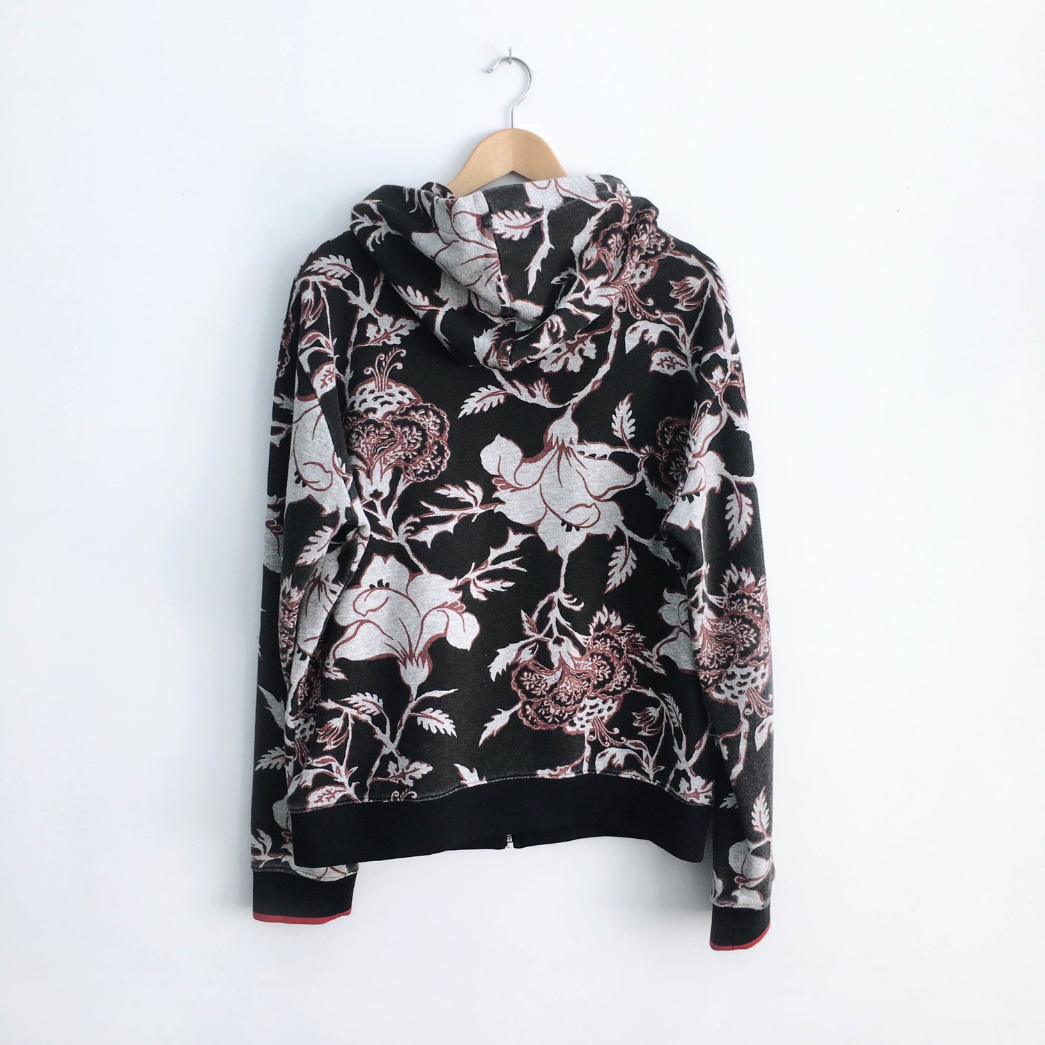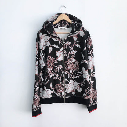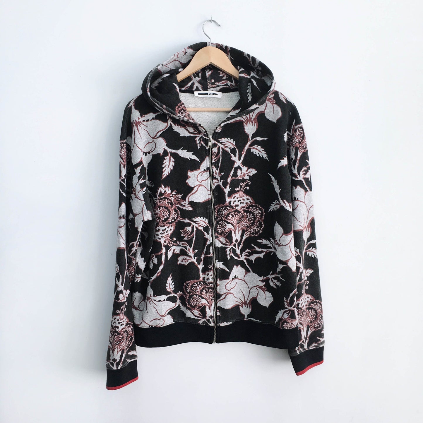 Item Description: Alexander McQueen is known for pushing the envelope, and with his second label McQ, he did not disappoint. This bold zip up hooded loopback cotton sweater features an all over floral print knockout with knit cuffs and hem. Sans hoodie strings. 100% cotton