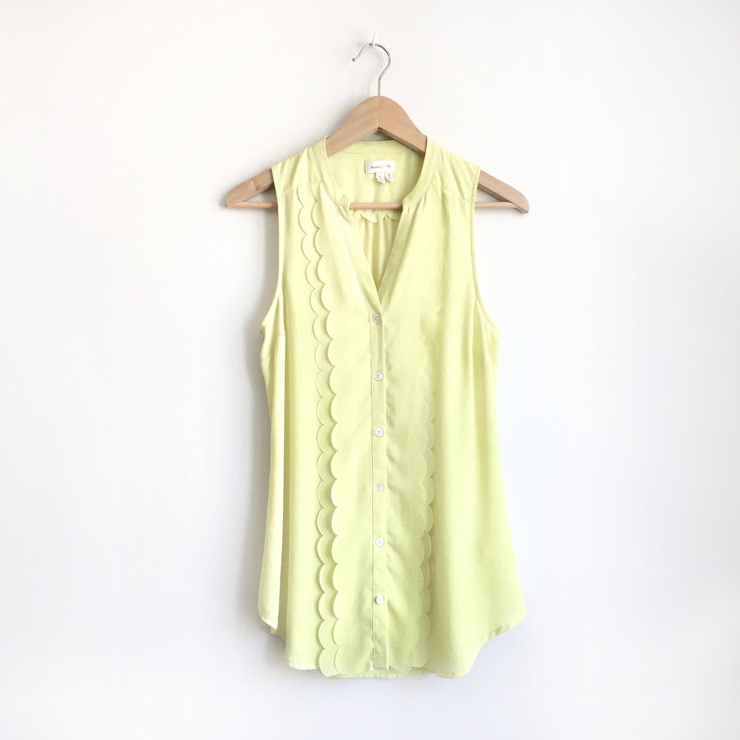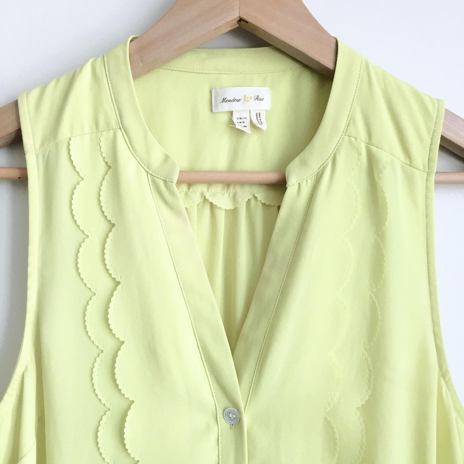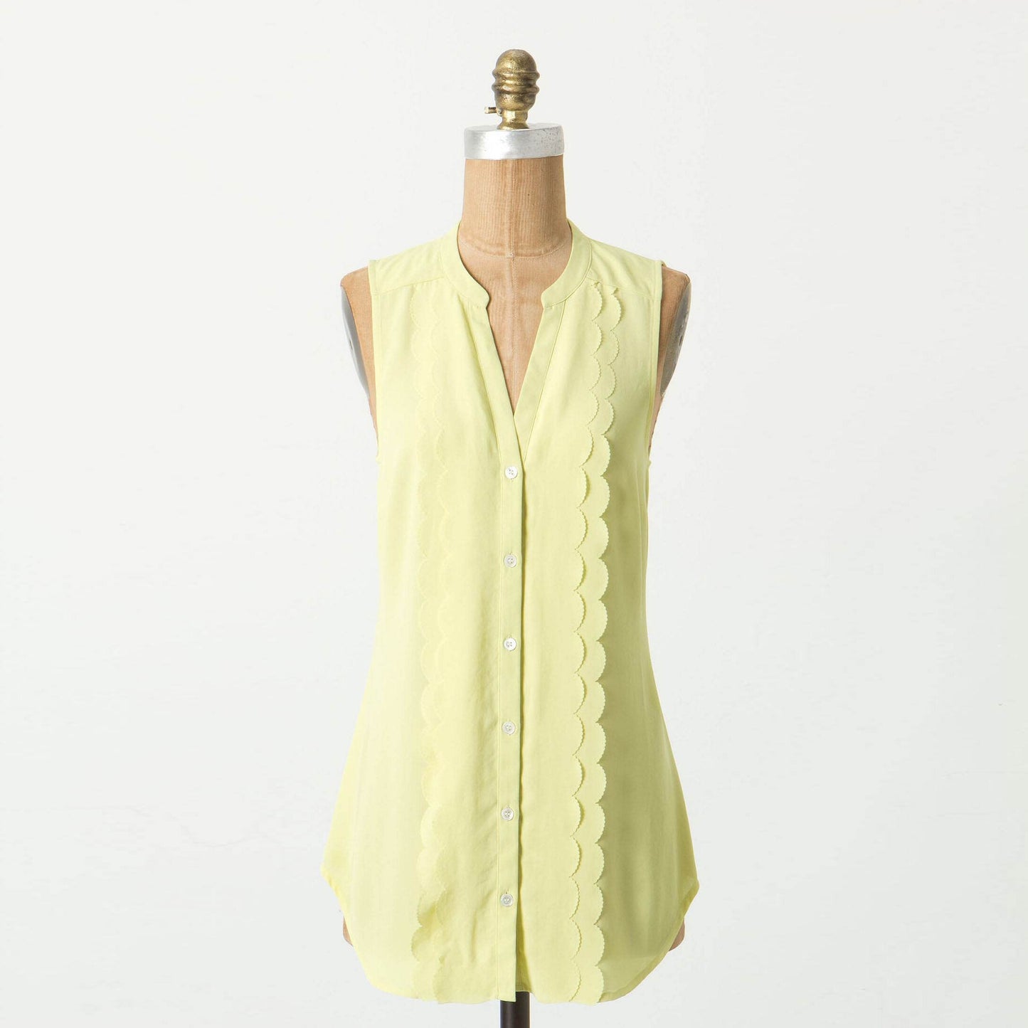 Item Description: This bright lemon-lime sleeveless buttondown from Anthropologie’s Meadow Rue features a beautiful laser cut scallop ruffle front. 100% polyester