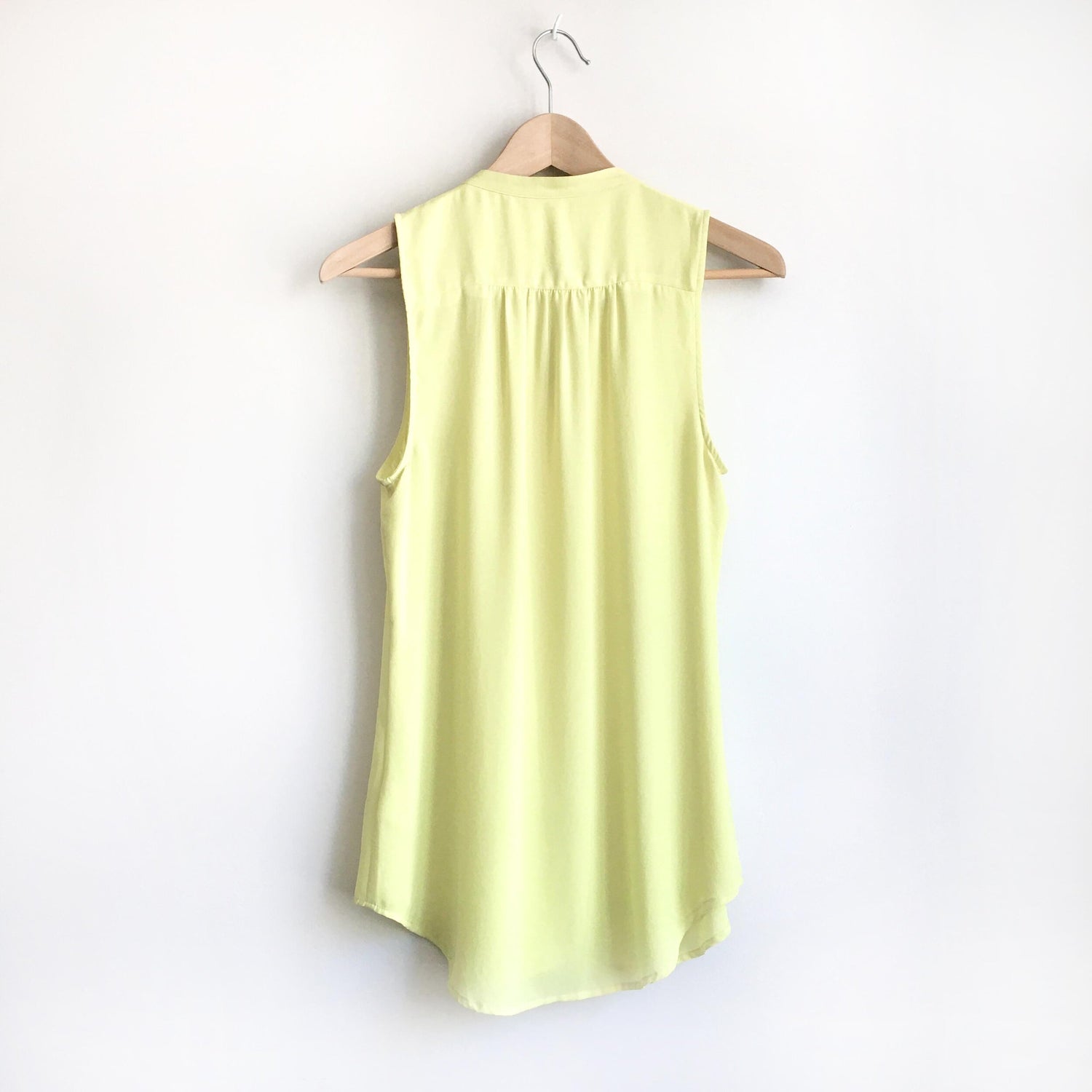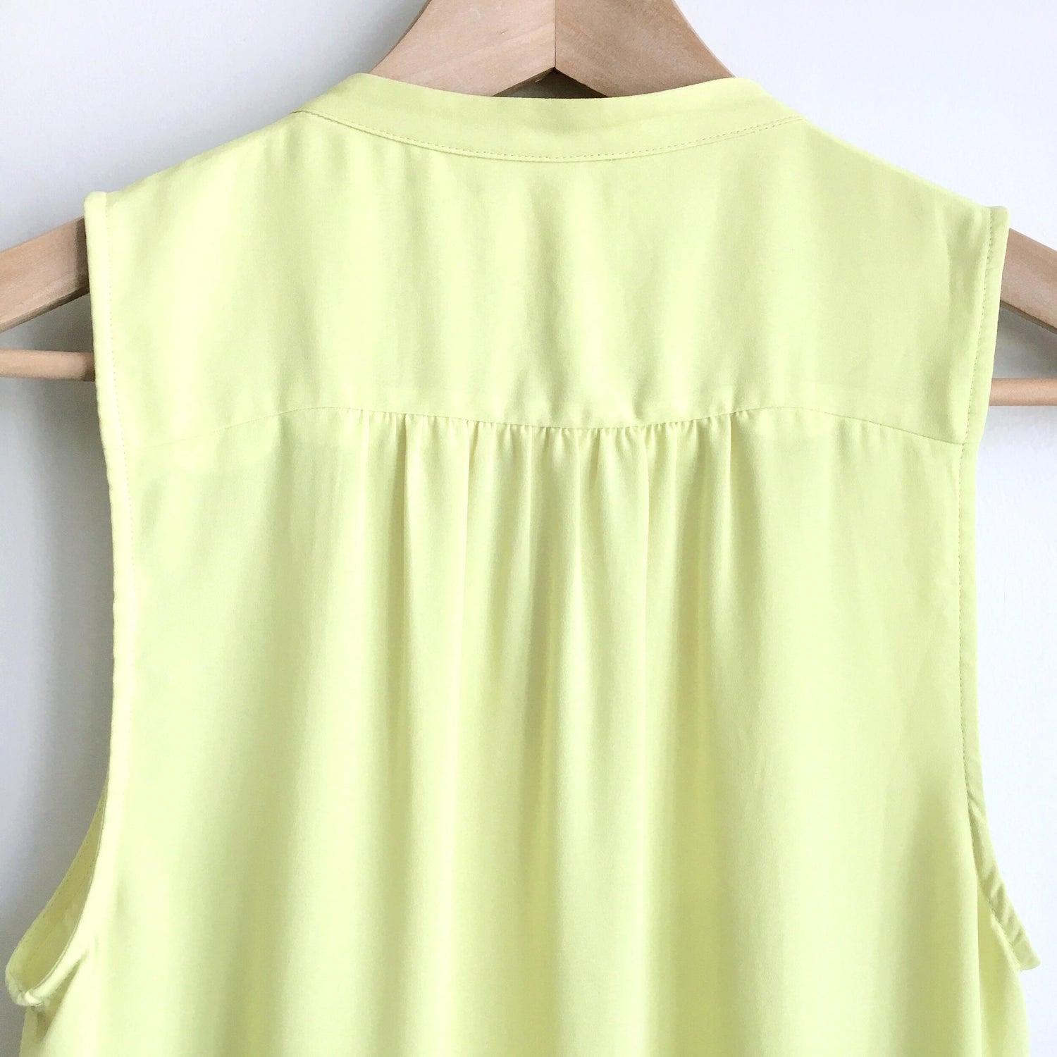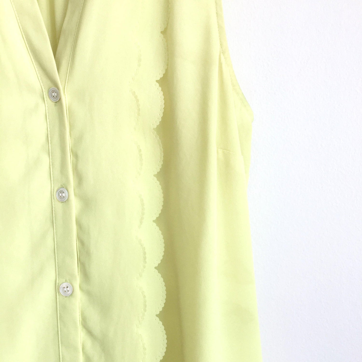 Item Description: This bright lemon-lime sleeveless buttondown from Anthropologie’s Meadow Rue features a beautiful laser cut scallop ruffle front. 100% polyester