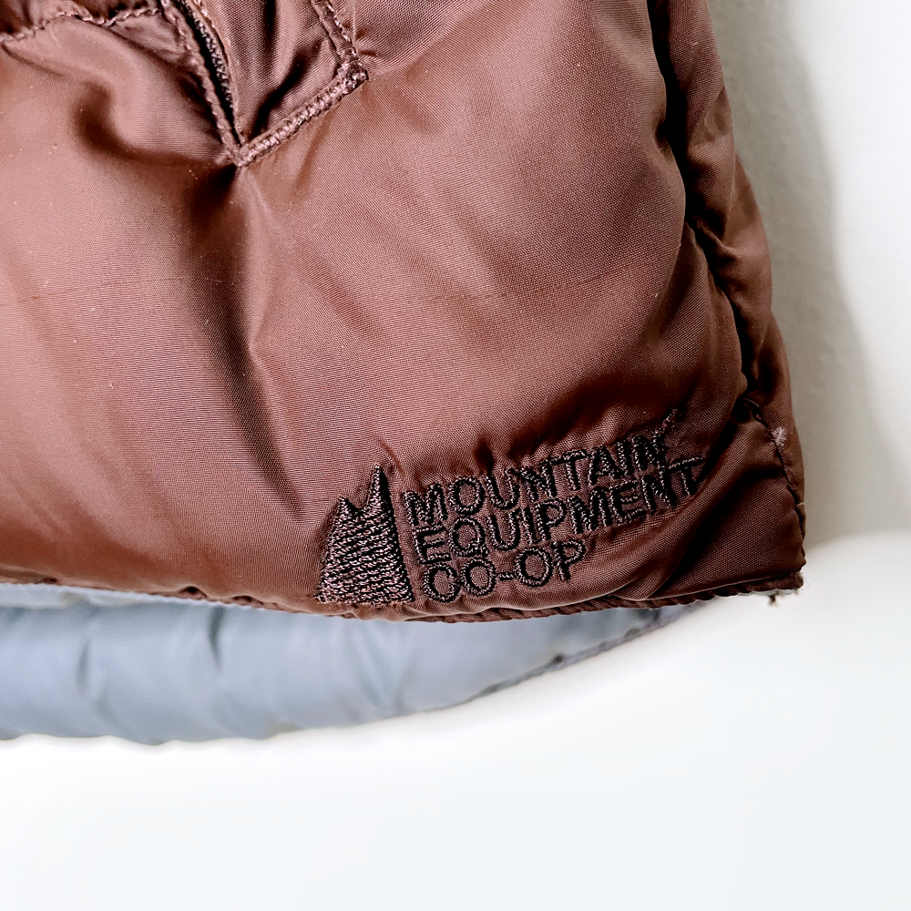 Item Description: Designed for the outdoors, this thick puffer vest from MEC comes in a neutral brown hue with grey liner. 100% down fill