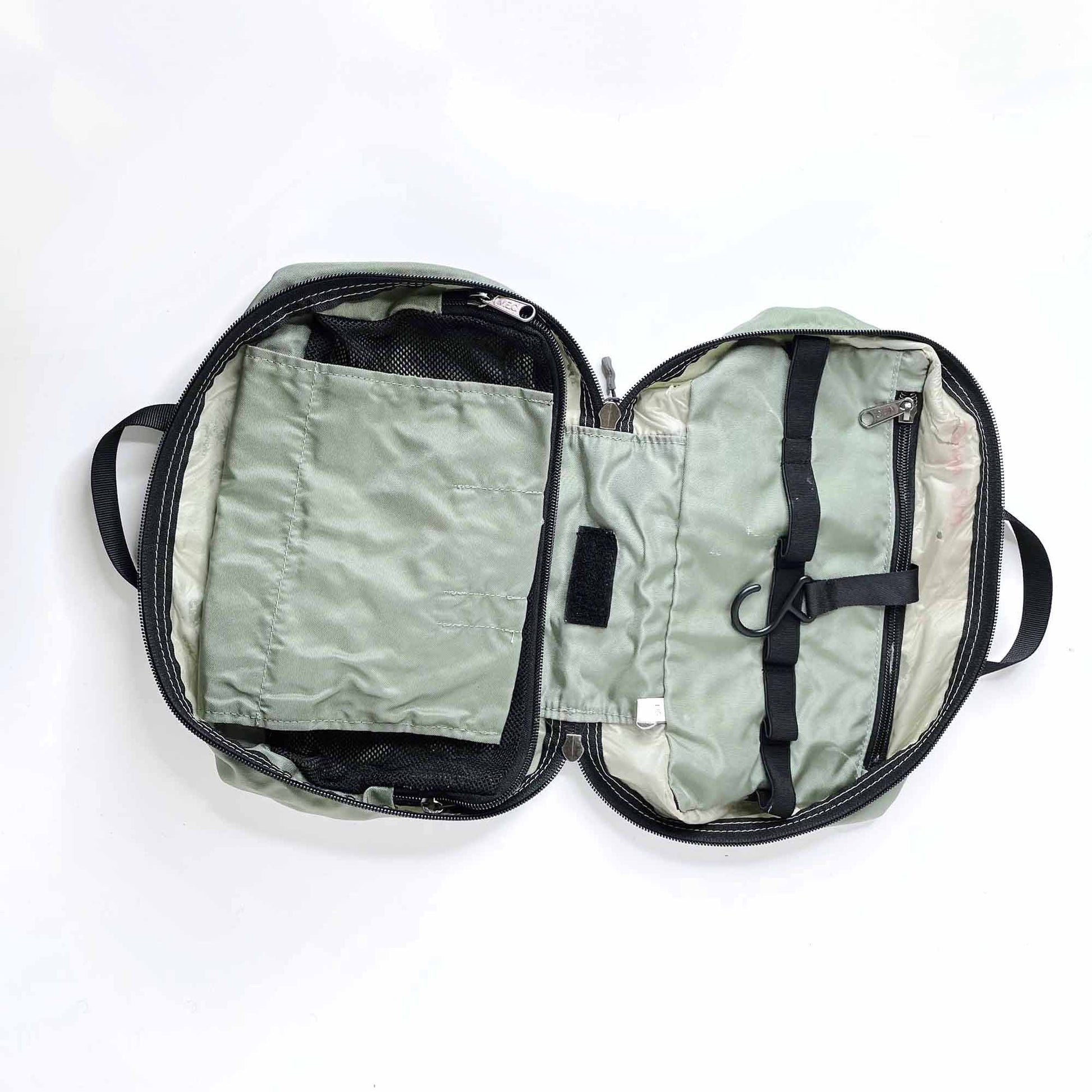 Item Description: Grooming on the go just got easier. This compact bag zips open to reveal 3 compartments that keep your toiletries organized. A hide-away hook lets you hang the whole thing from shower bars or tree branches.