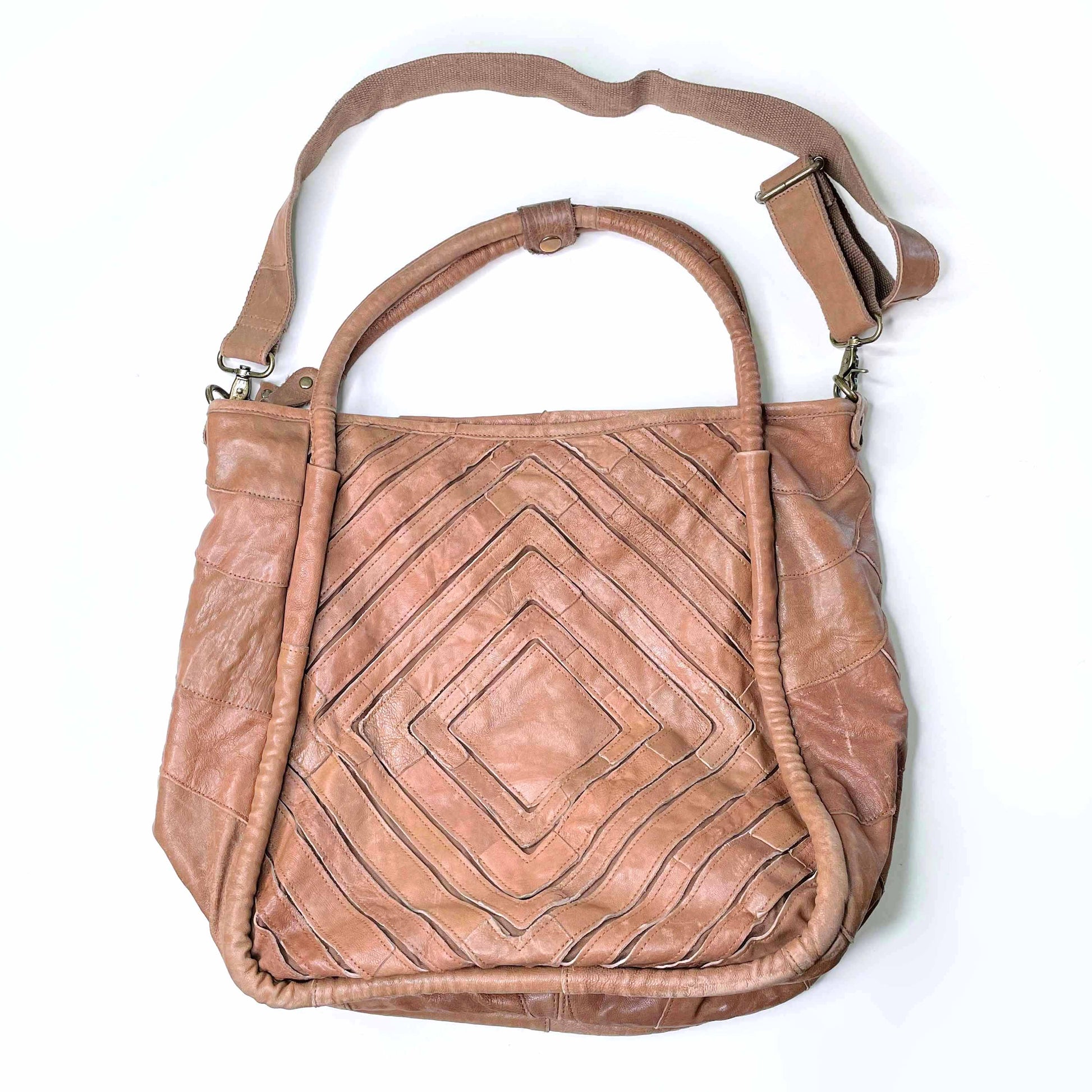 Item Description: Diamond shaped genuine leather patchwork gives this classic tote bag a modern edge. Fully lined interior contains two patch pockets and one zip pocket. Zip closure.