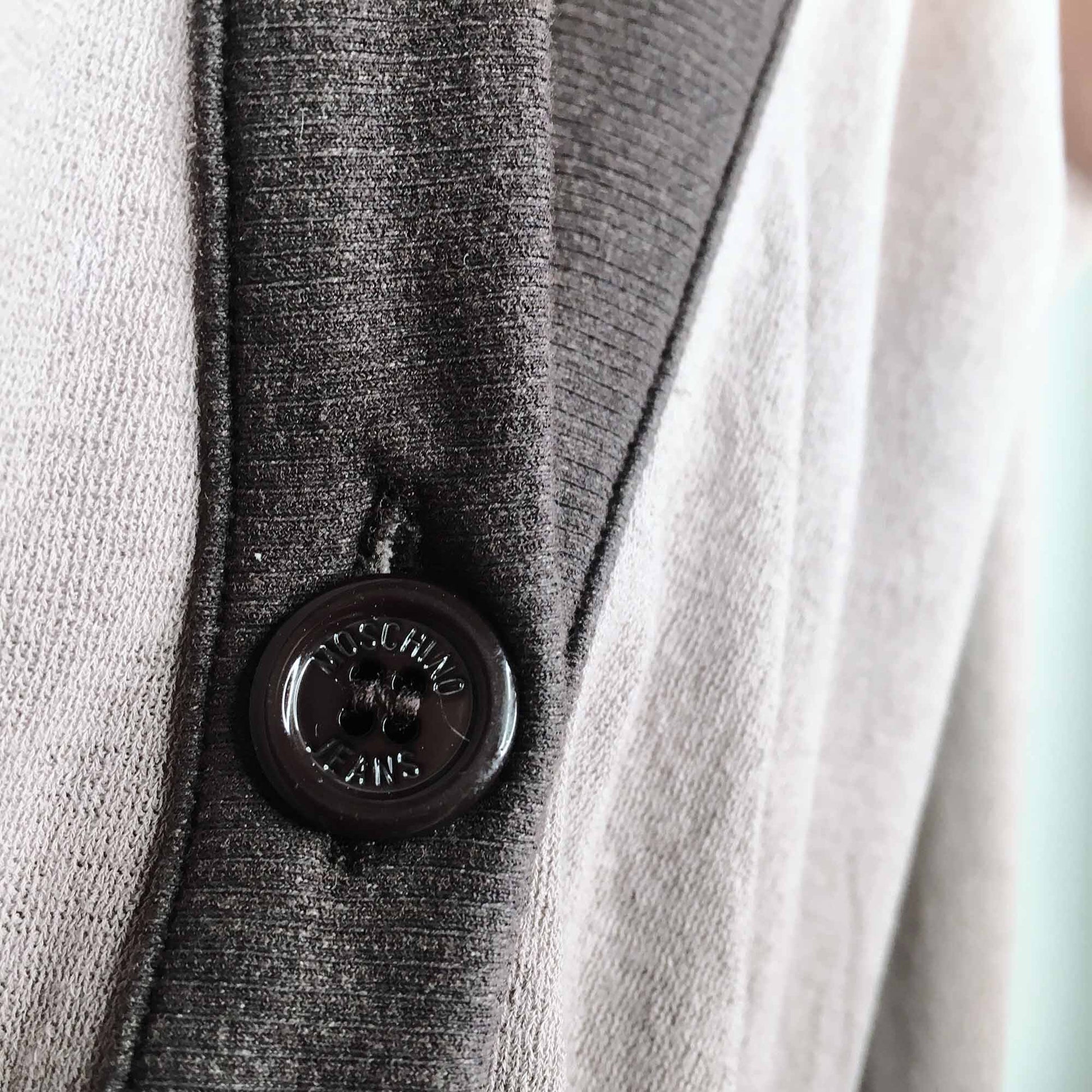 Item Description: This vintage Moschino jeans cardigan features a stretch shell with ombre dye and duster length. No content tag.