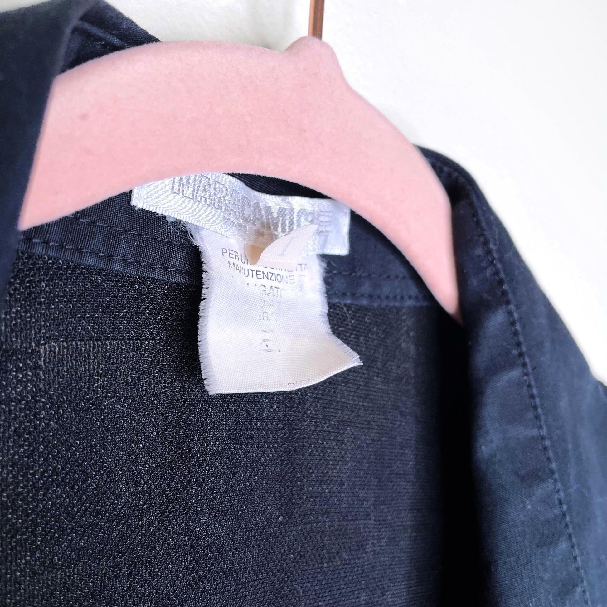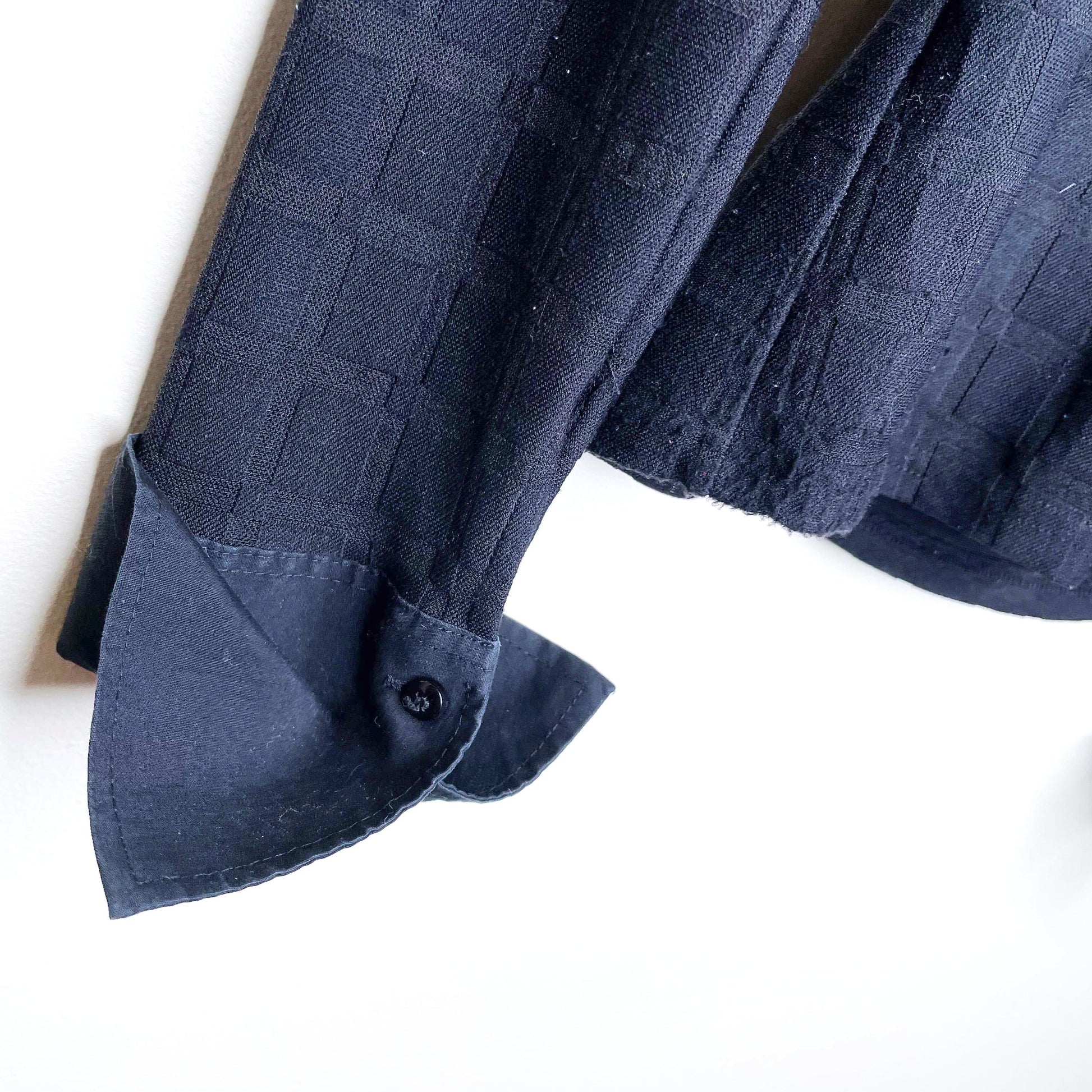 Item Description: This milano designer from the 00's was known for her collared, semi-sheer stretchy tops. Nara Camicie nails this window pane wrap top with contrast collar and cuffs. No content tag.