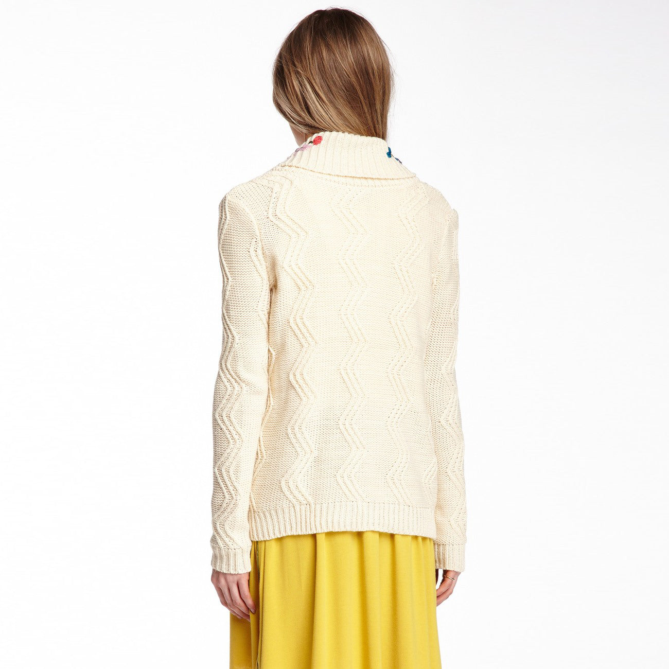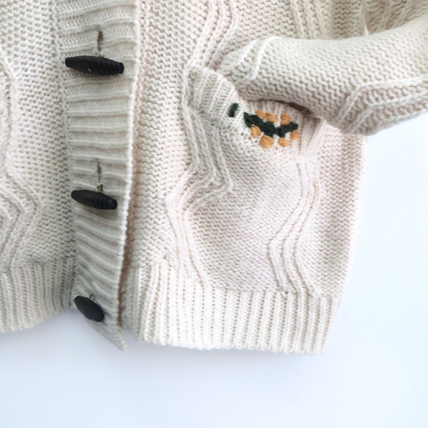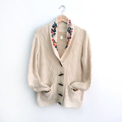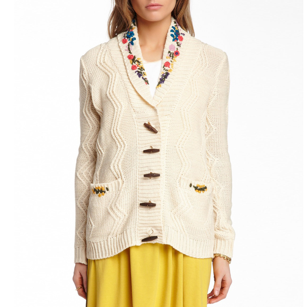 Item Description: Shawl collar - Long sleeves - Front toggle closure - 2 front patch pockets - Floral embroidered detail - Knit construction - 100% Acrylic