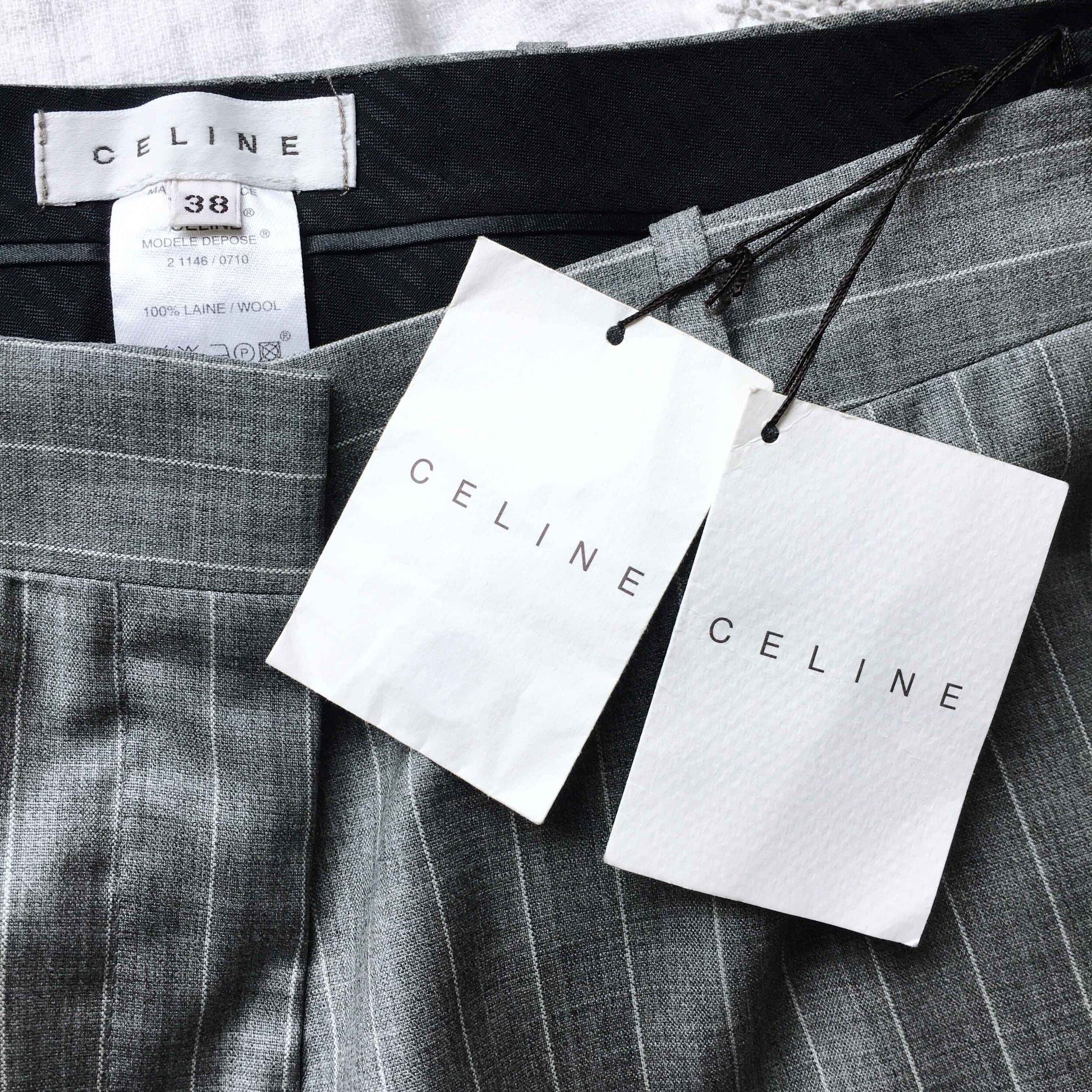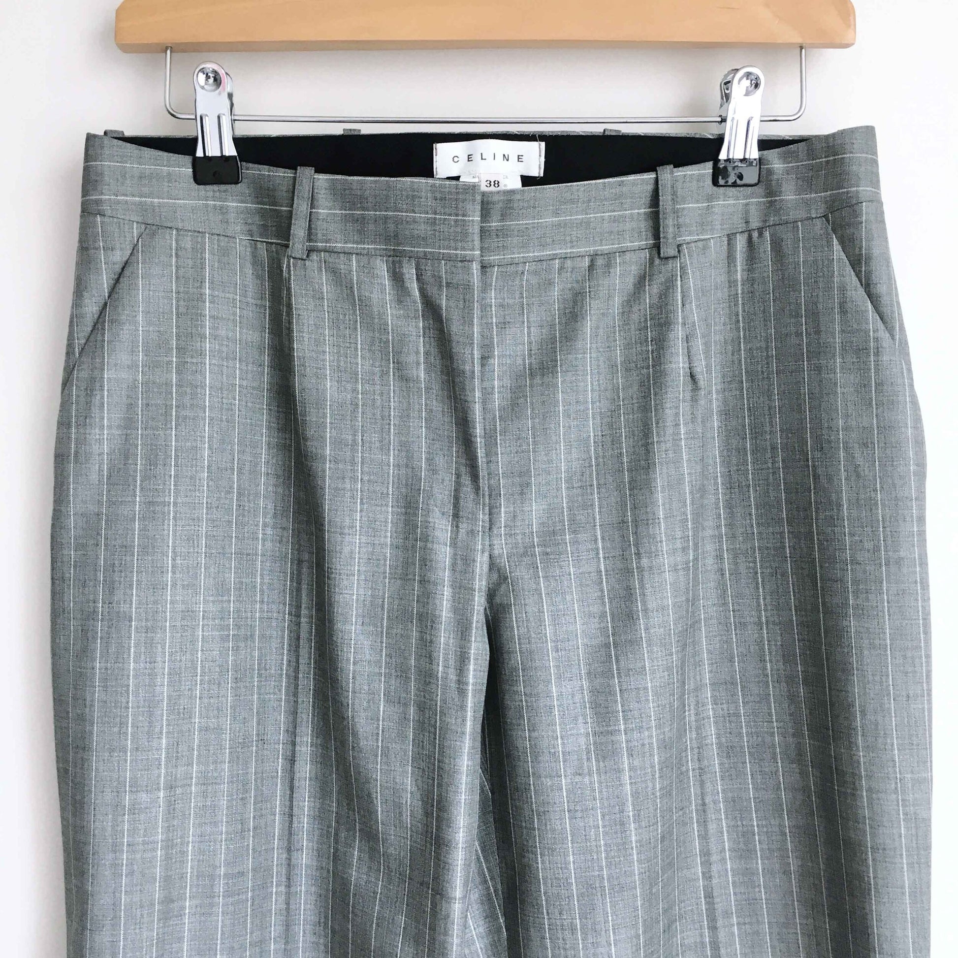 Item Description: A classically tailored double pleat straight leg trouser from CELINE with a high rise, side pockets and stripes. 100% wool