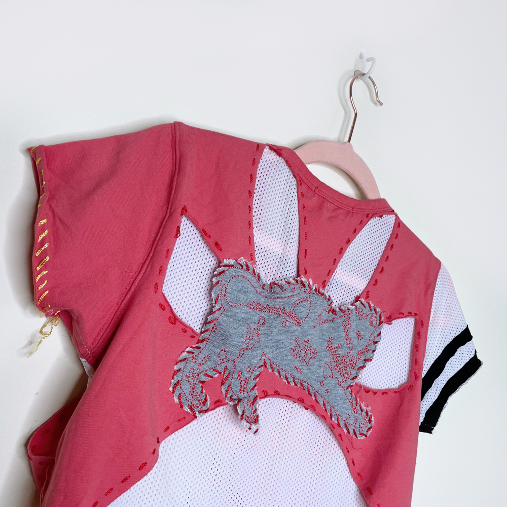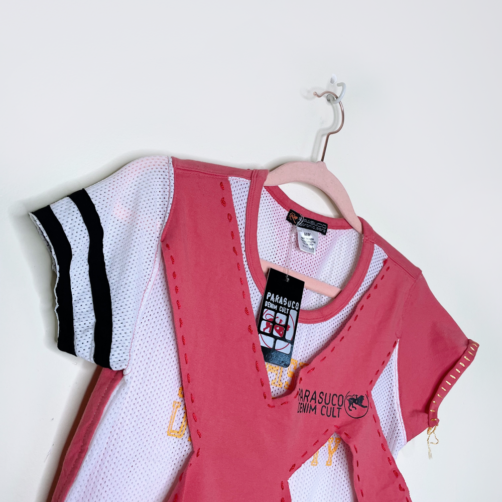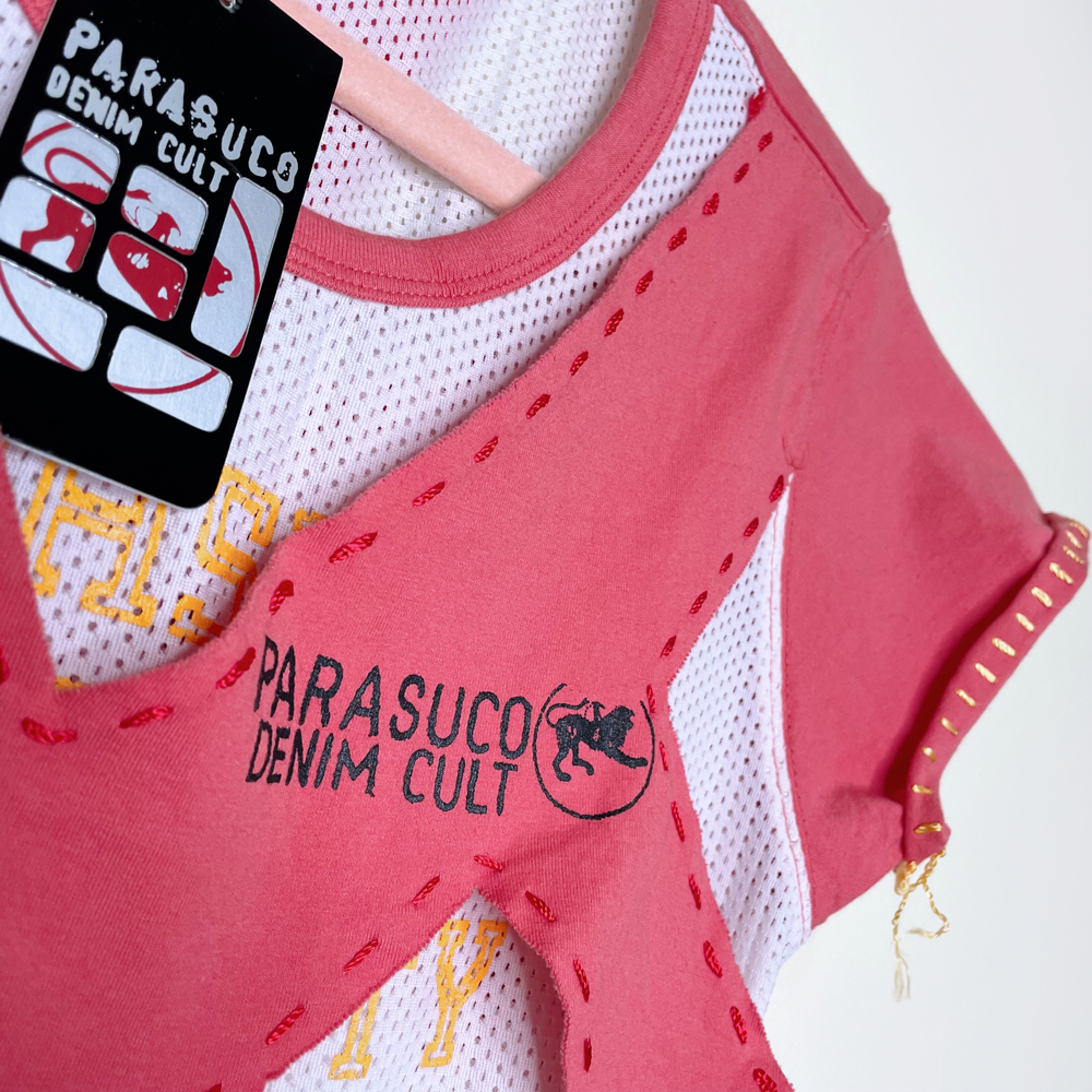 Item Description: This streetwear tee from Parasuco features a mesh varsity tee with raw cut-out jersey overlay, hand-stitch edges and a cut out lion back. 93% cotton 7% spandex