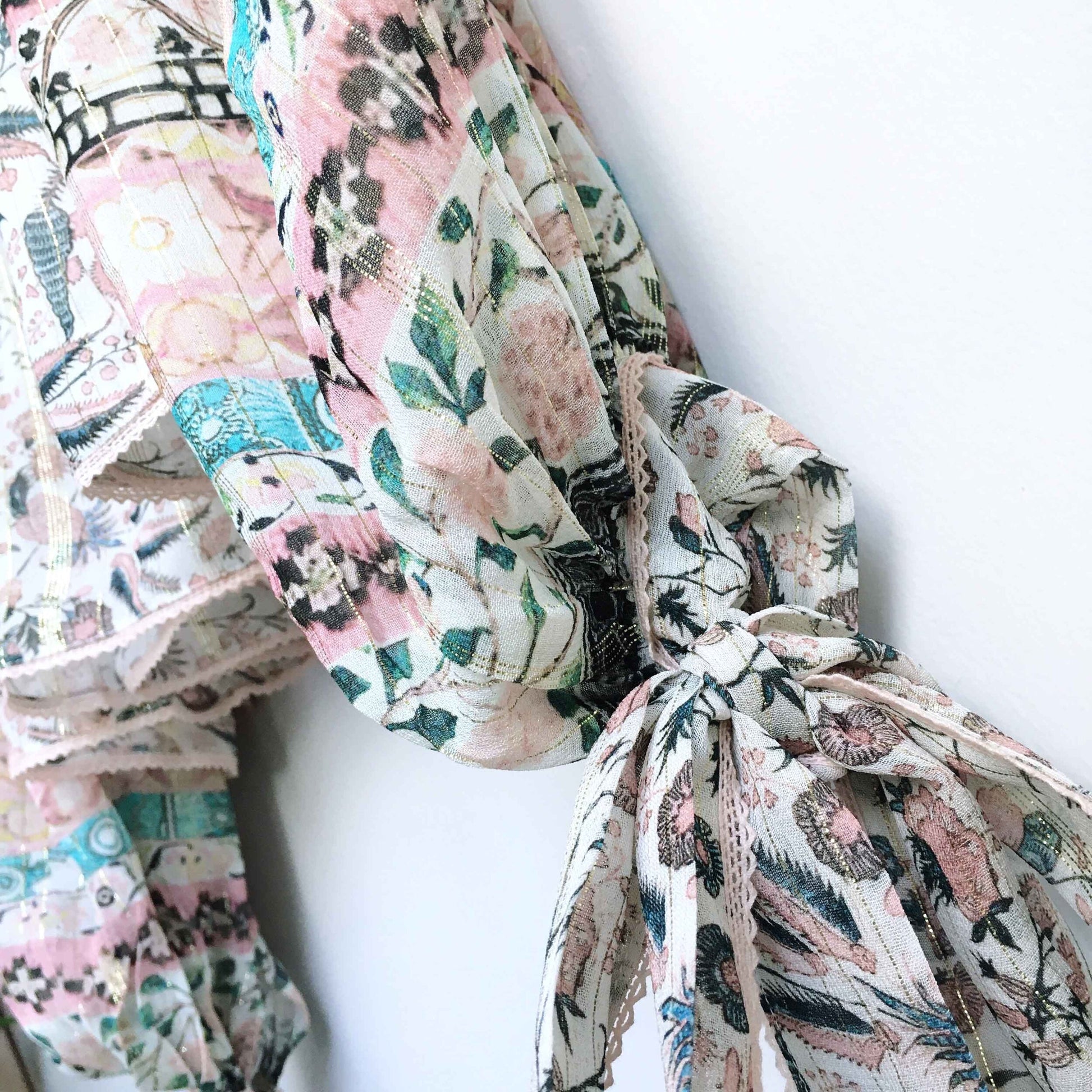 Item Description: This luxe boho brand from India, Hermant & Nandita, is a feature at Anthropologie. Cascading chiffon with metallic gold thread, tie up neckline and billowy balloon sleeves that tie at the cuff in a bow. 100% viscose