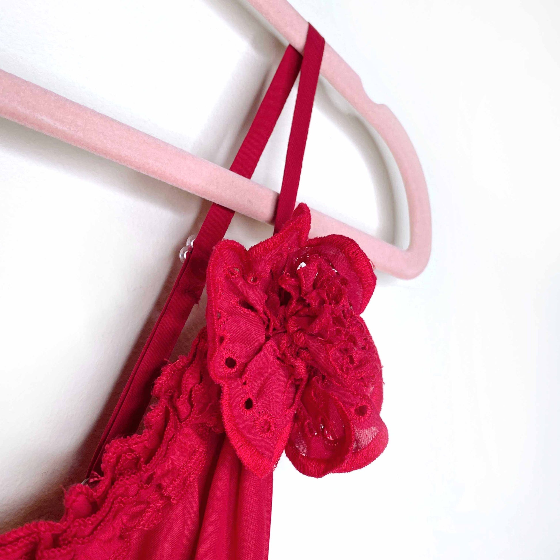 Item Description: This adorable red summer dress from KFG has a bit of Spanish flair with a red flower and lace ruffle hem. 100% cotton