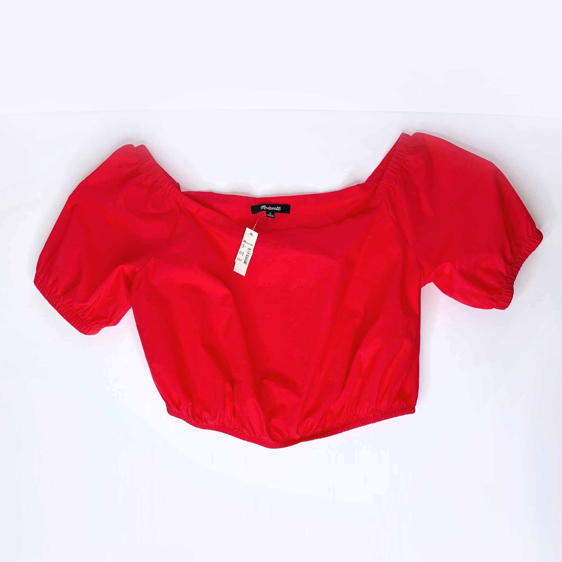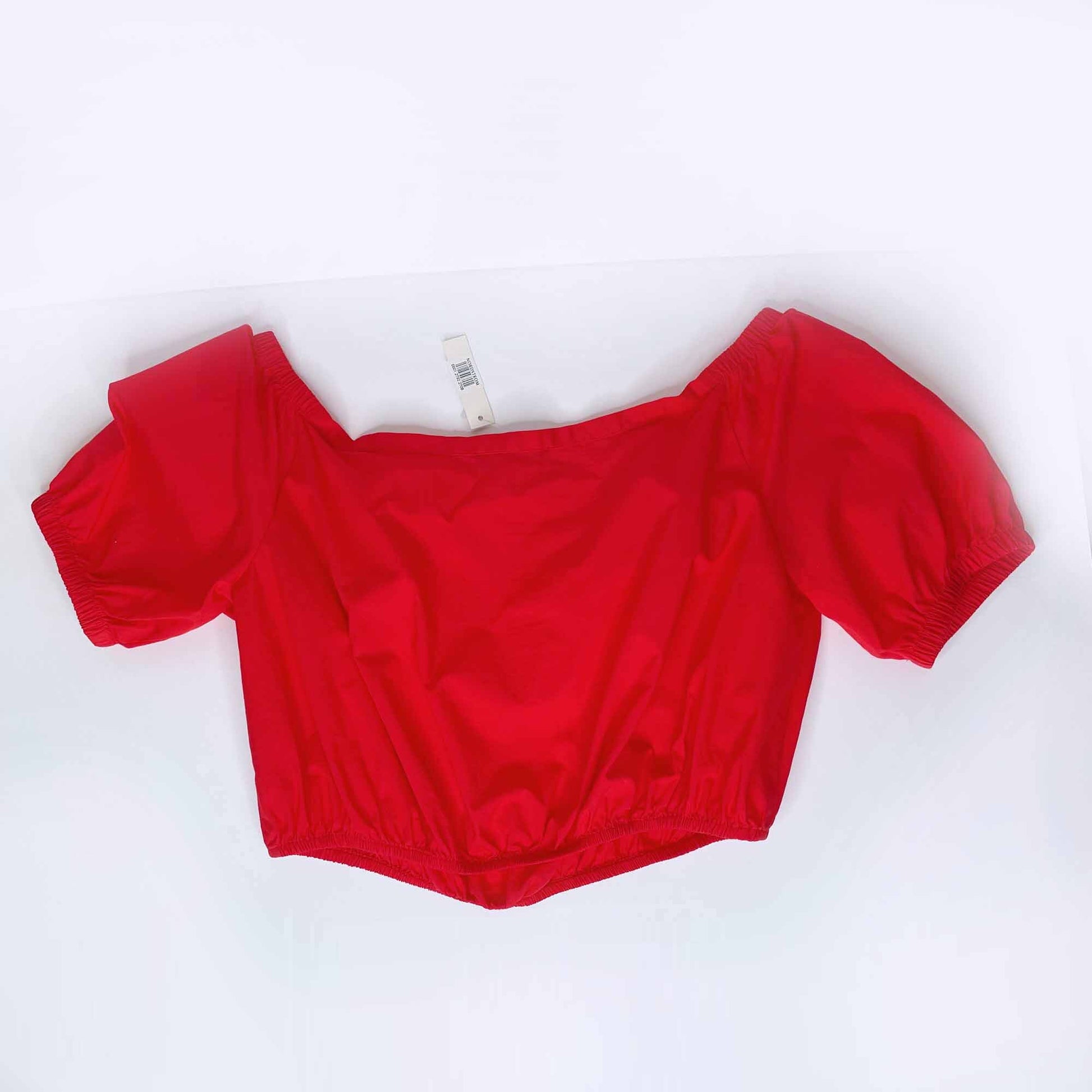 Item Description: An off-the-shoulder crop top in bold red. Easy and elasticized, we recommend wearing it with a tiered maxi skirt for full salsa-dancing-emoji-girl vibes. 100% cotton