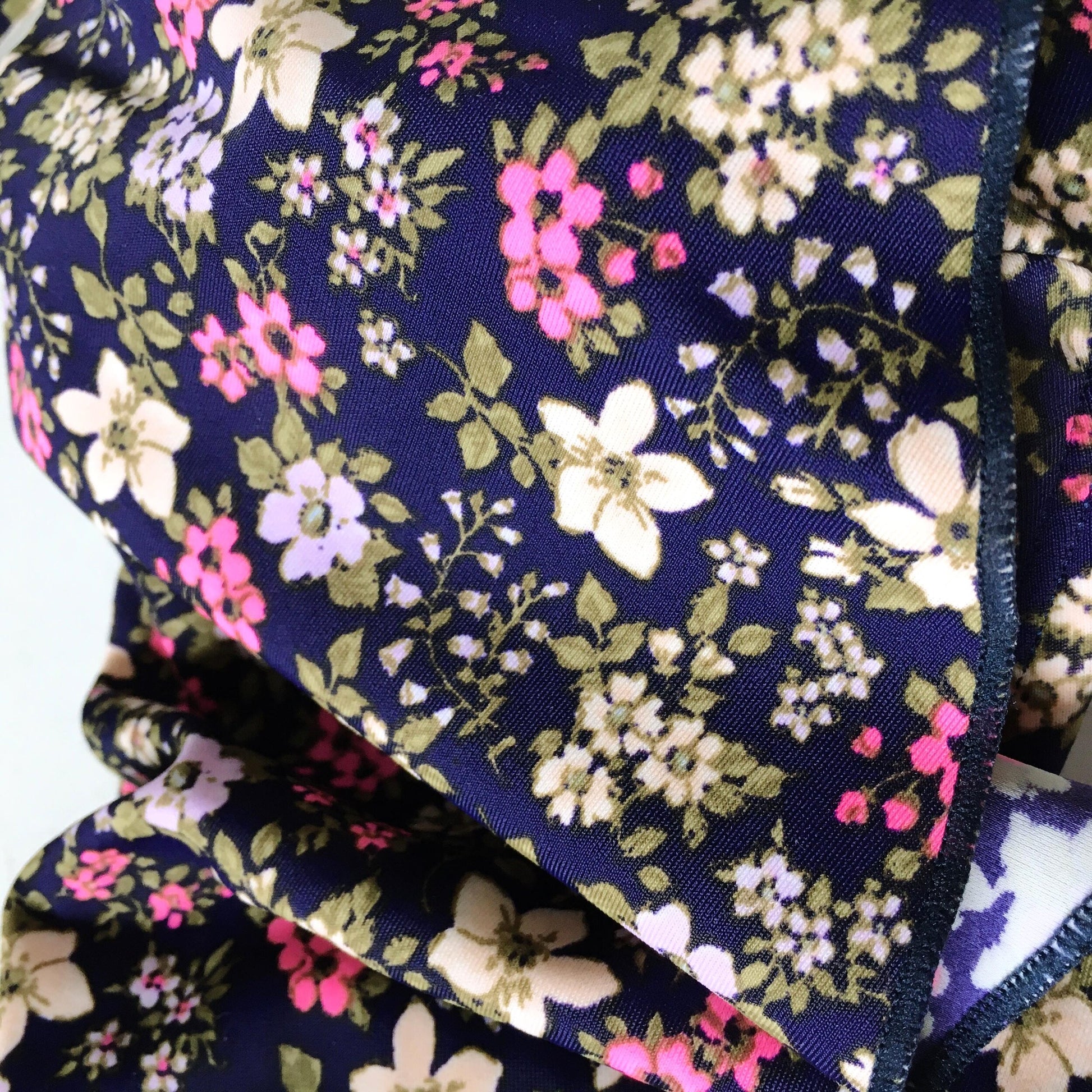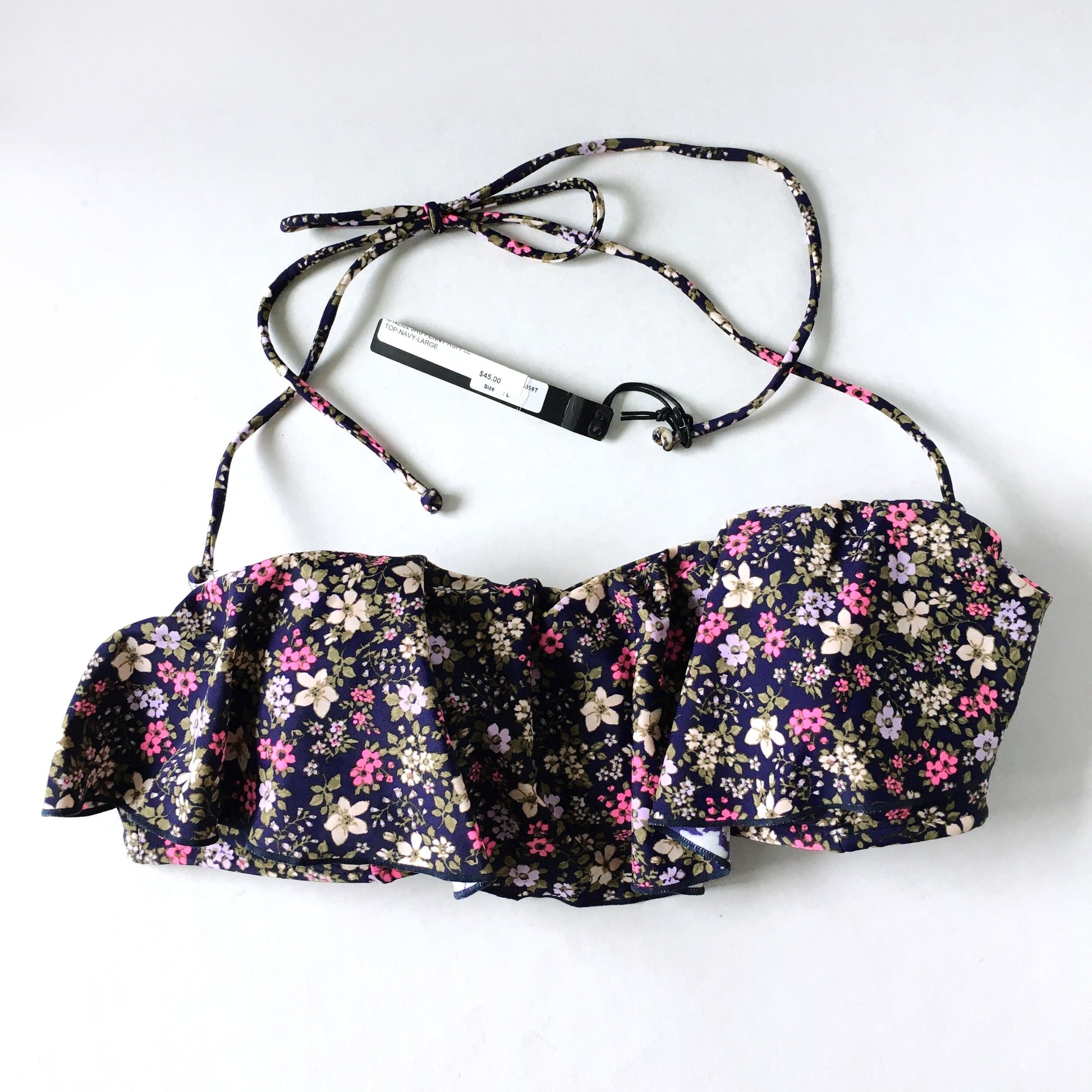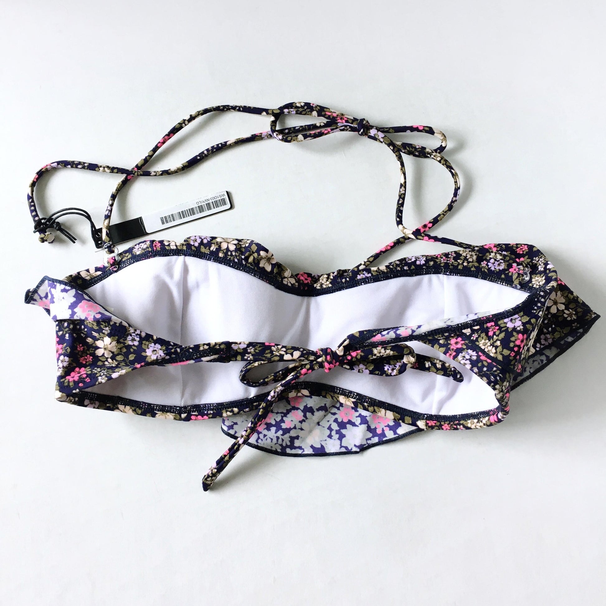 Item Description: The cutest bather for the summer, this navy blue bandeau features an all-over floral print, front ruffle, tie back, and tie top with removeable straps. 80% nylon 20% elastane