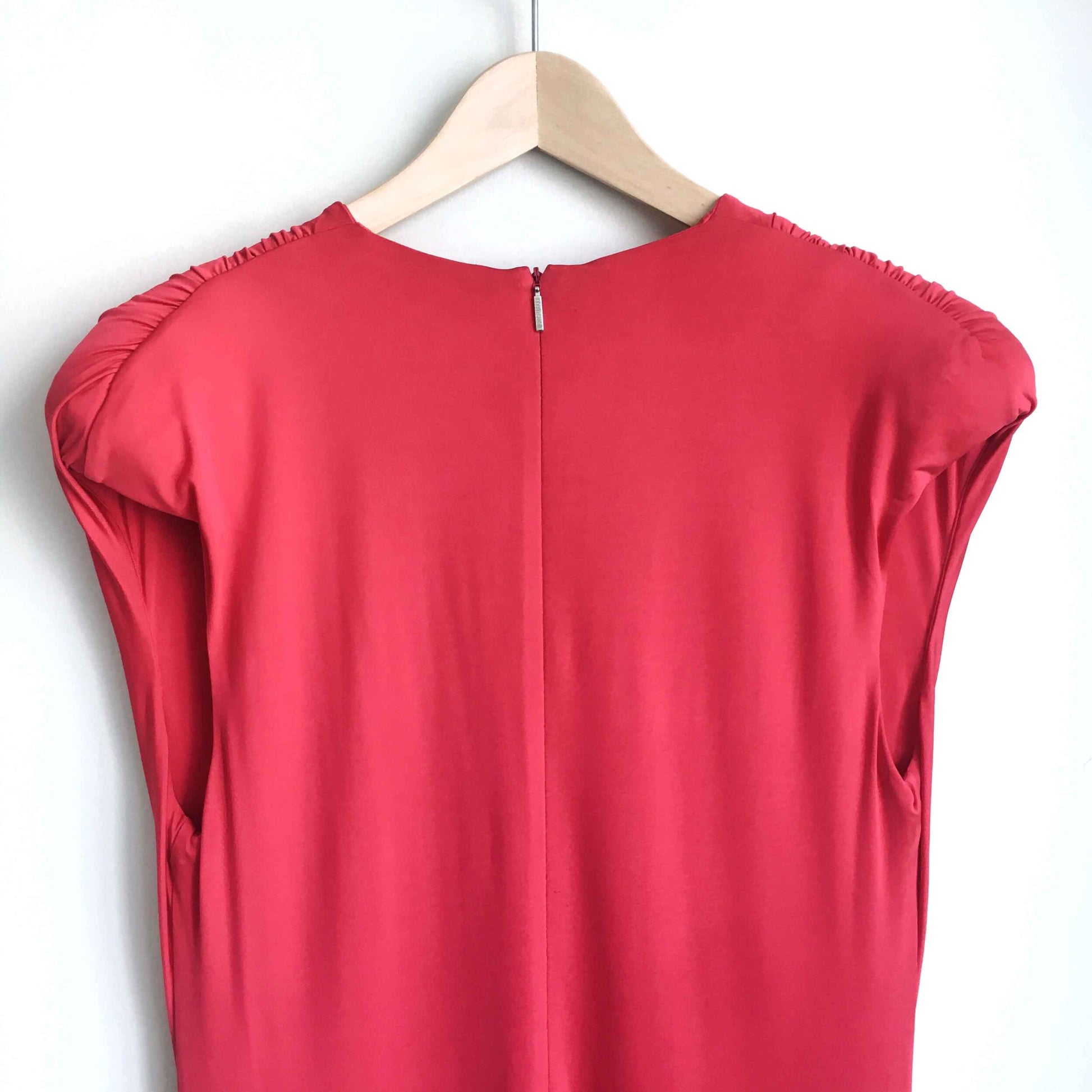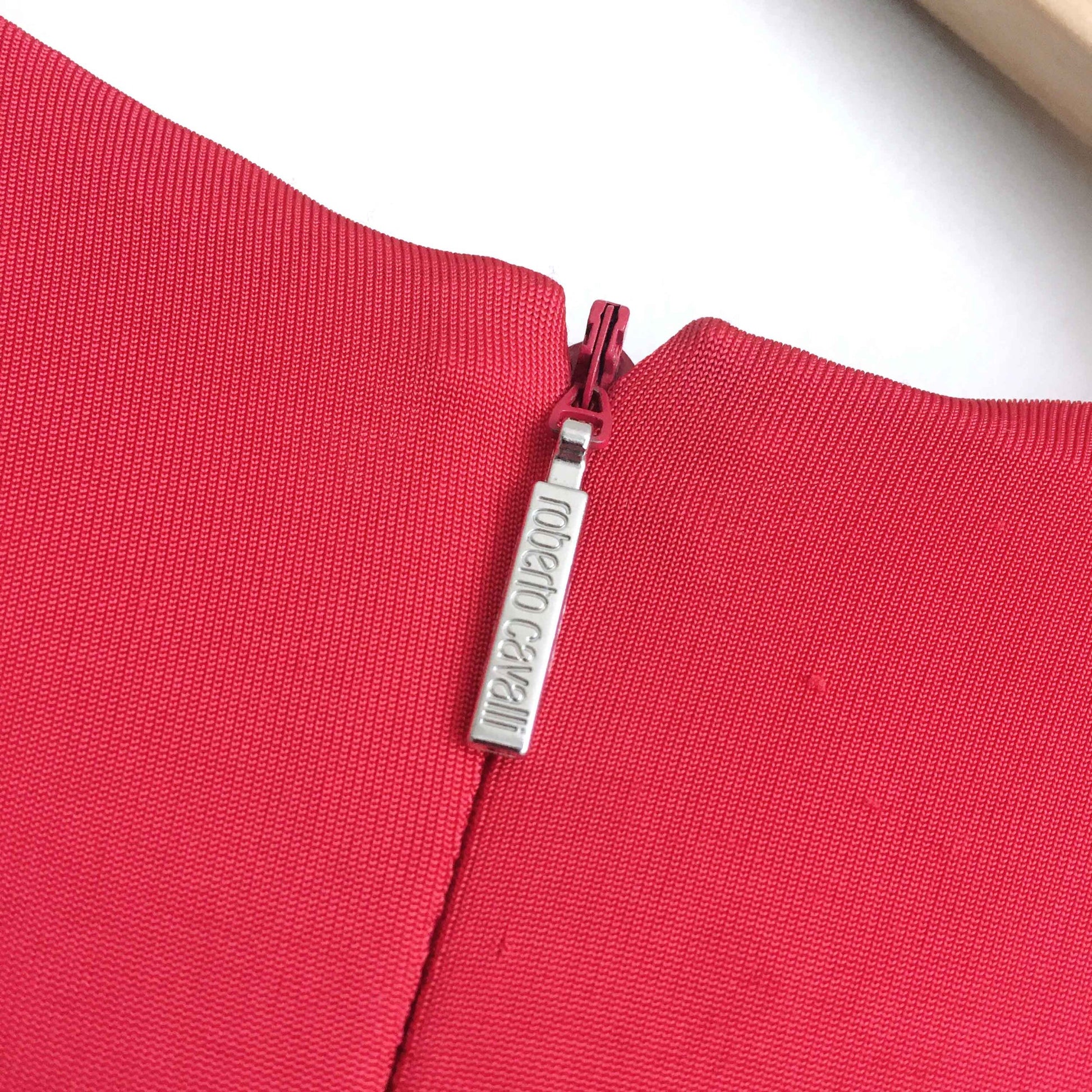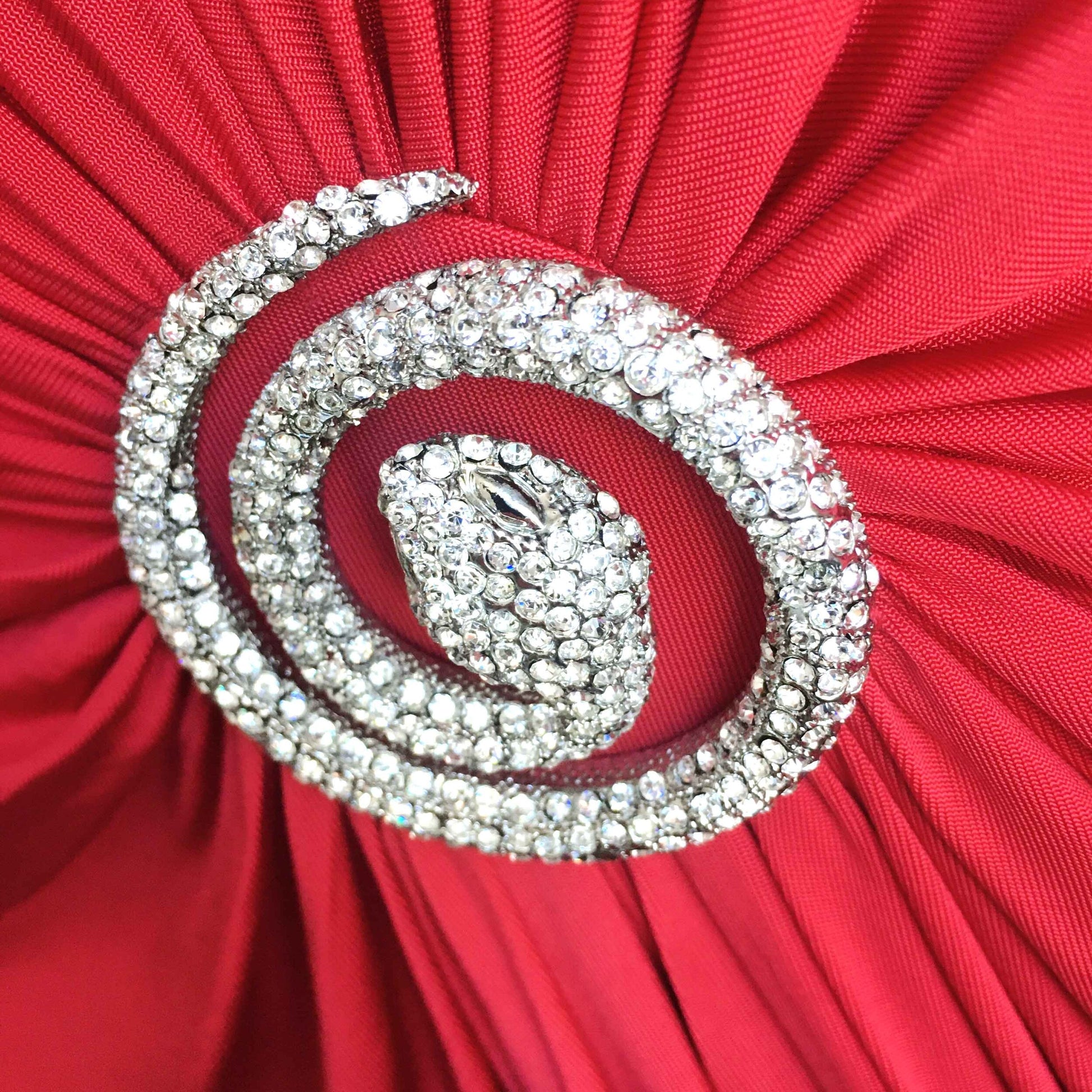 Item Description: This ultra flattering dress from Roberto Cavalli features a light shoulder pad for the empowered woman, ruched shoulder detail and a plunging deep v neckline with crystal snake epicentre. Lined 95% viscose 3% polyamide 2% elastane