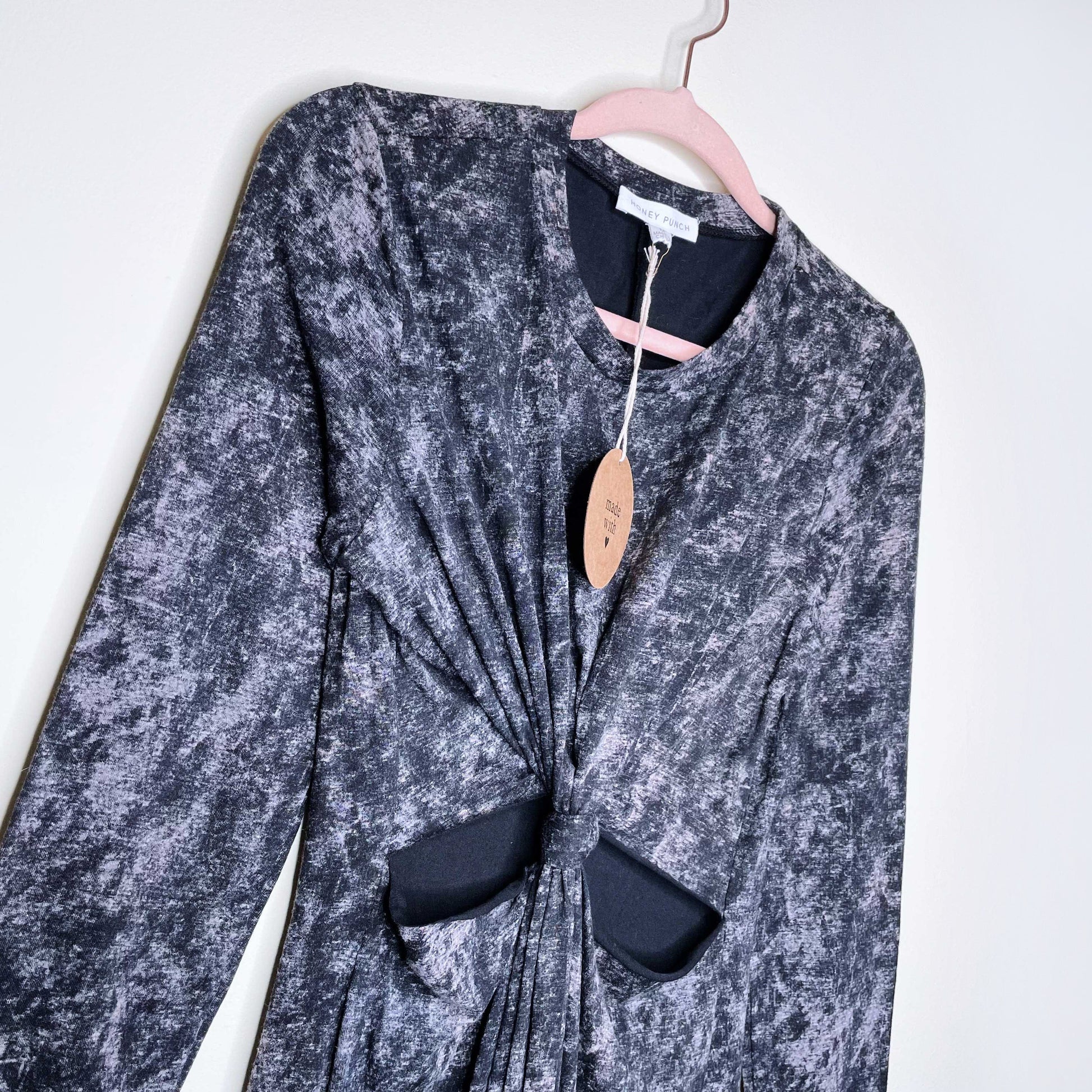 Item Description: Casual-cool cutout knot-front maxi dress from Honey Punch in an easy breezy stretch knit. Finished with a banded crew-neck + long sleeves in a maxi length with back slit. 60% cotton 40% polyester