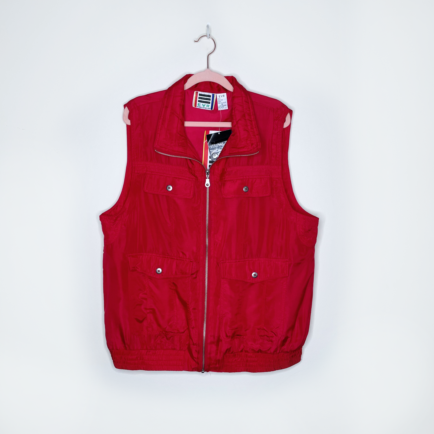 Item Description: This perfectly retro 90's set from EVR features a full zip vest top with front cargo pockets, reinforced gusset and quilted collar. Add to that a pair of classic track pants with elastic waistband and side pockets, all in a bright red washed silk.