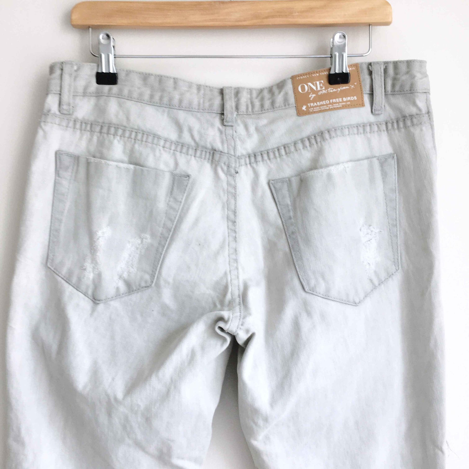 Item Description: Shredded holes break down a vintage-inspired pair of cropped One Teaspoon boyfriend jeans. Heavy fading and worn edges add a well-loved feel. Exposed zips detail the ankles. 5-pocket styling. Single-button closure and zip fly. 100% cotton