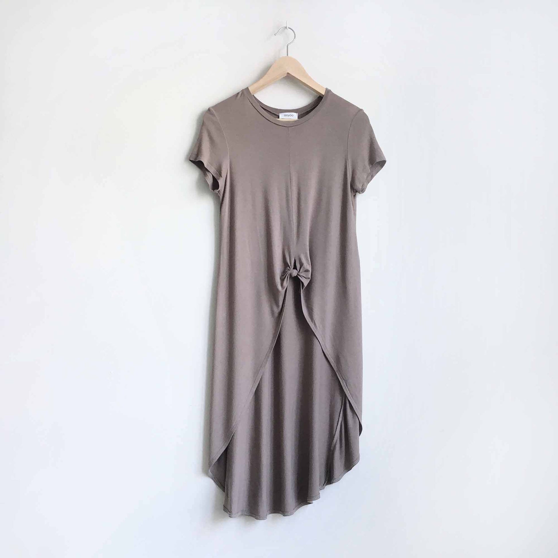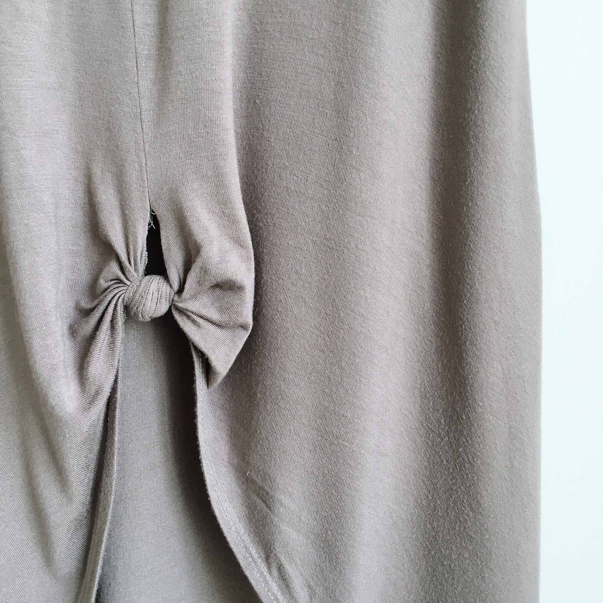 Item Description: This stretch jersey tee from Mendocino’s Ooyoo features a delicate cap sleeve, crop knotted front and long trail back. No content tag, but ultra soft stretch jersey.