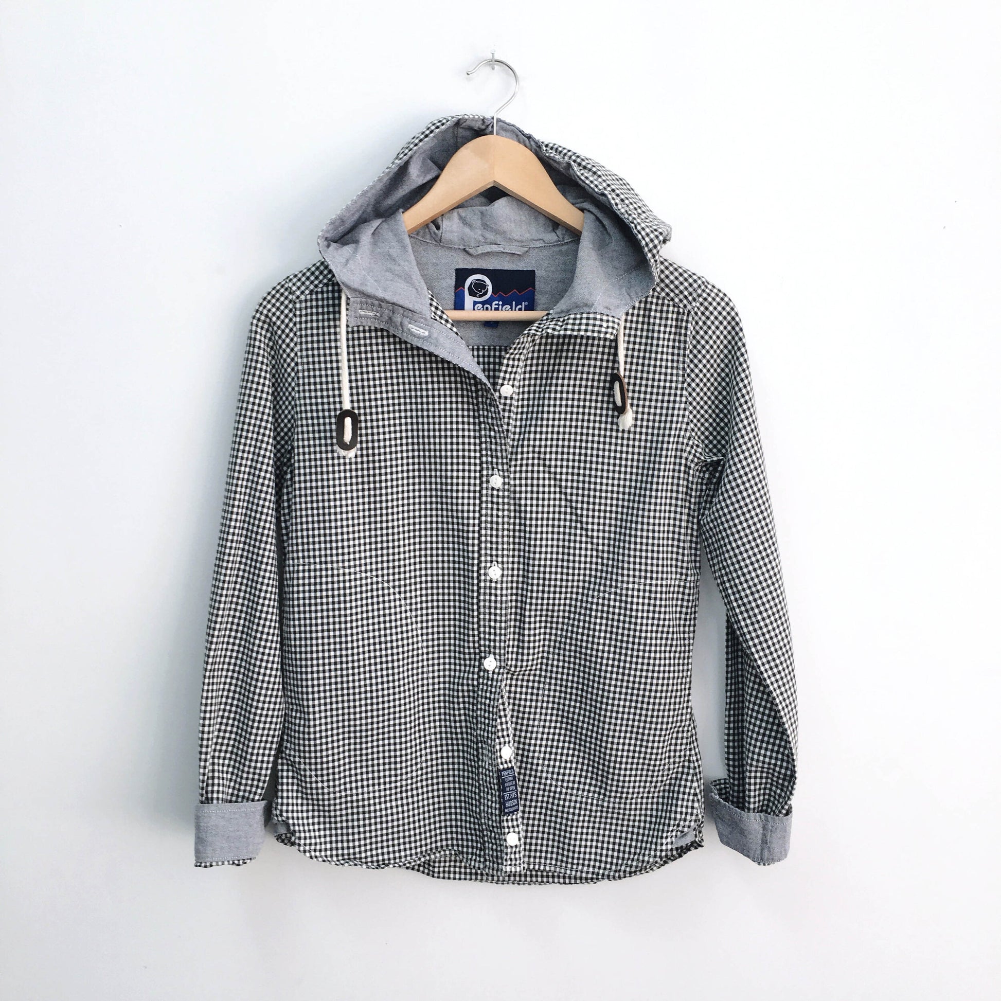 Item Description: Sold at Urban Outfitters, and a recent collab with Madewell, Penfield is on the rise as the latest outdoors label to make it big. This button up hooded shirt in a white/black check features contrast cuffs and hood, and faux leather detailing on the string. 100% cotton