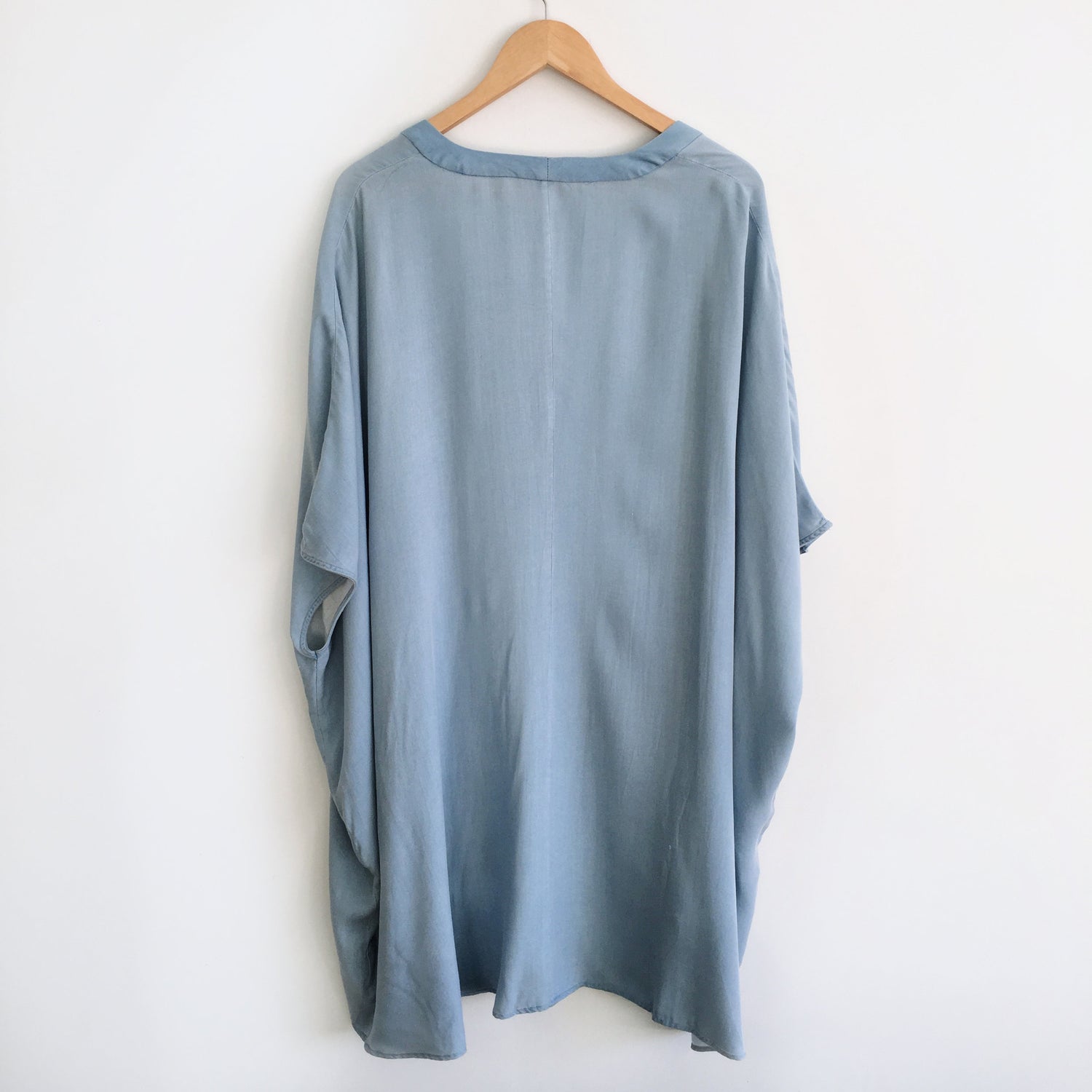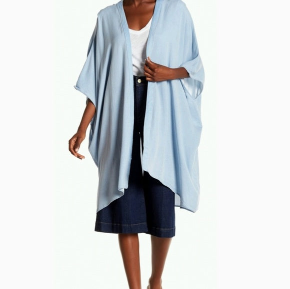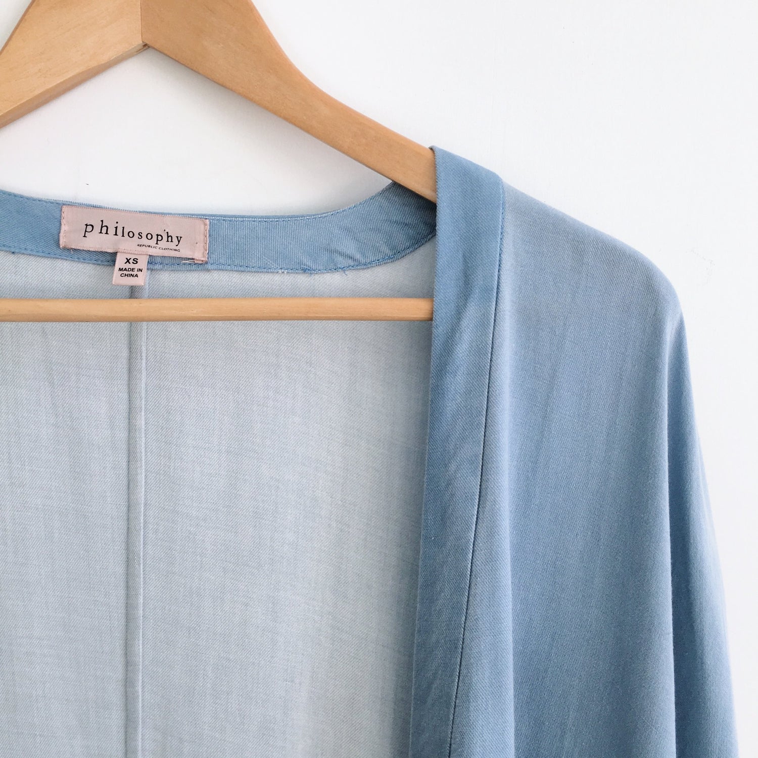Item Description: This lightweight chambray kimono from Philosophy Republic Clothing is easy-breezy lemon squeezy. Ultra flowy fabric and oversized for the perfect casual festival look.