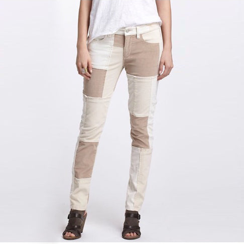 - Skinny leg - Ankle length - Patchwork cords - 9" medium rise - 29" inseam - Belt loops at waistband - Zip fly with button closure - Five pockets